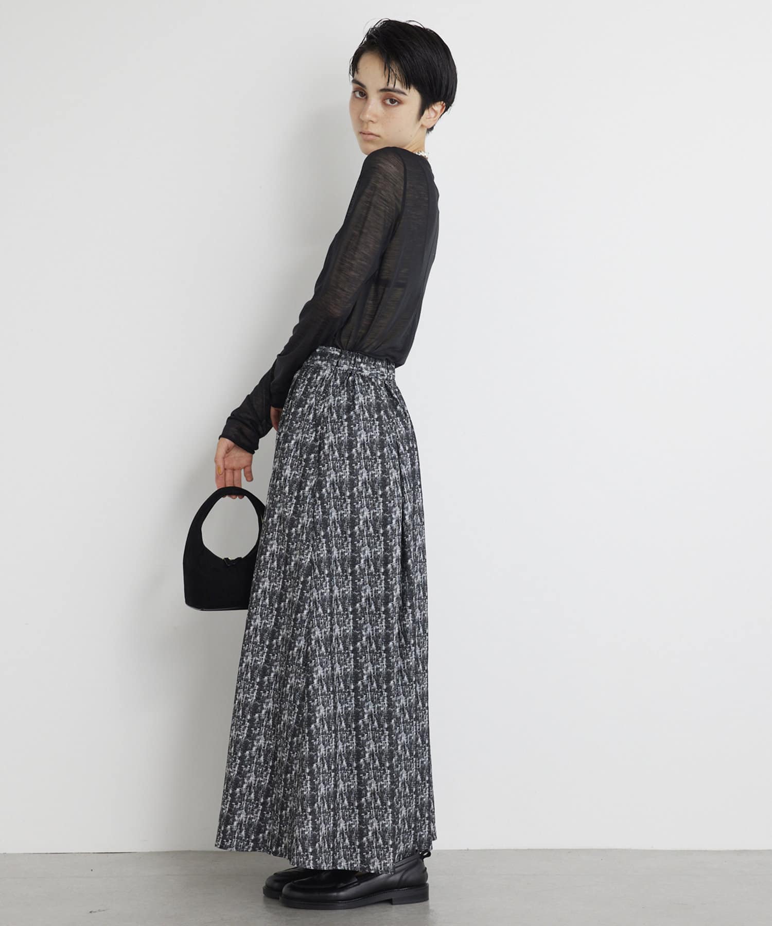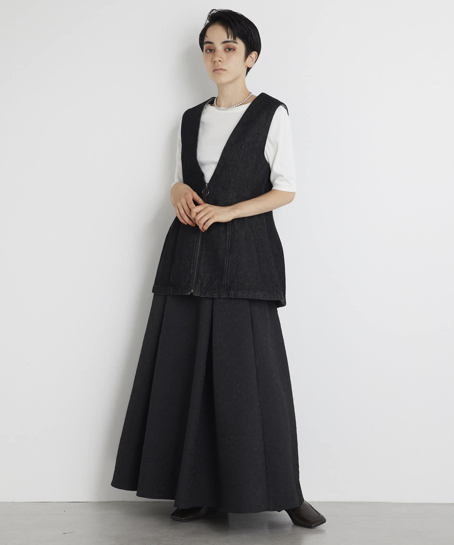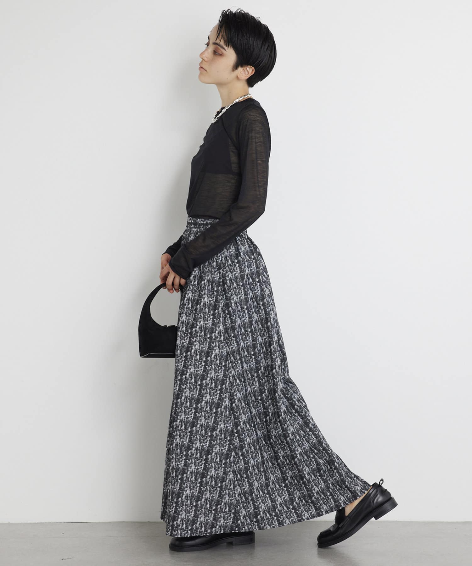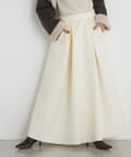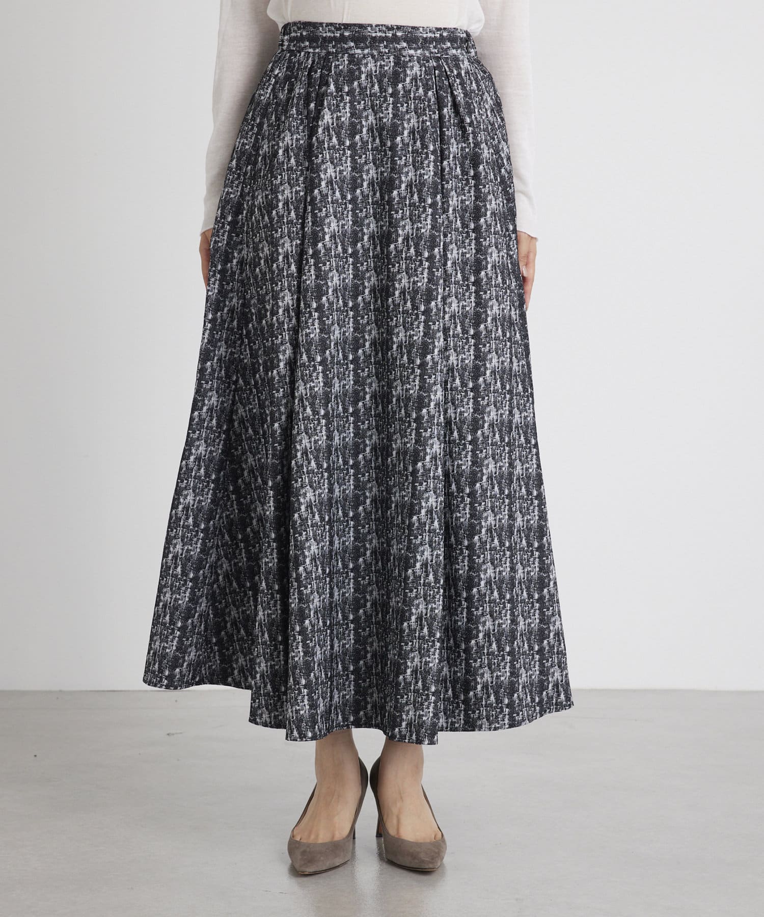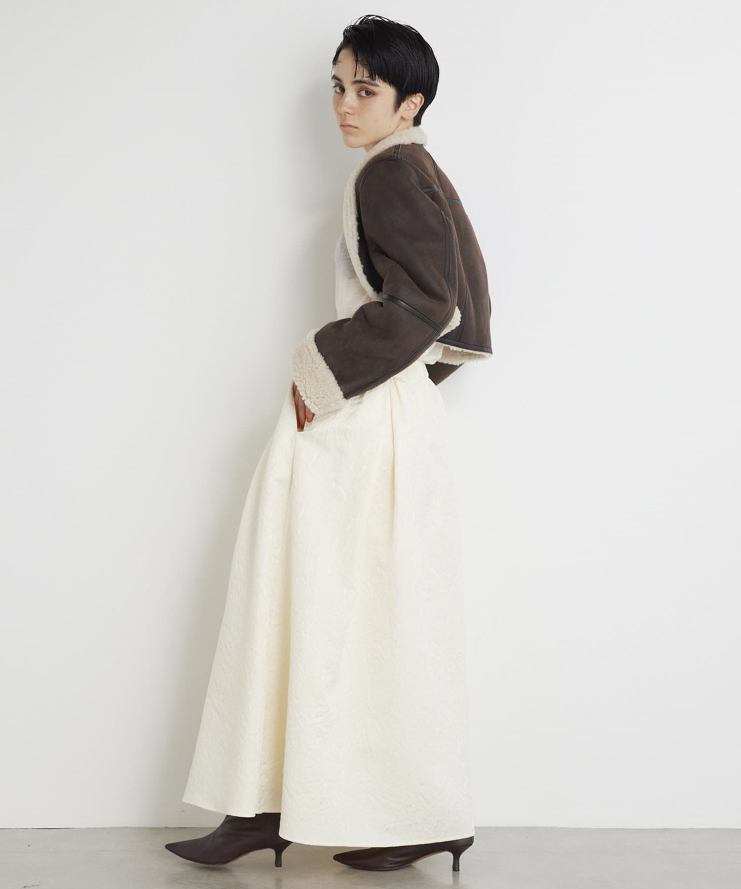 ハリを楽しむ上品なロングスカート。ジャガード生地が差をつけます。タックが入ることにより、より美しいシルエットに。一枚で着映えるスカートだと思います。シューズはフラットからロングブーツまで楽しめますよ。季節を問わず投入できます!