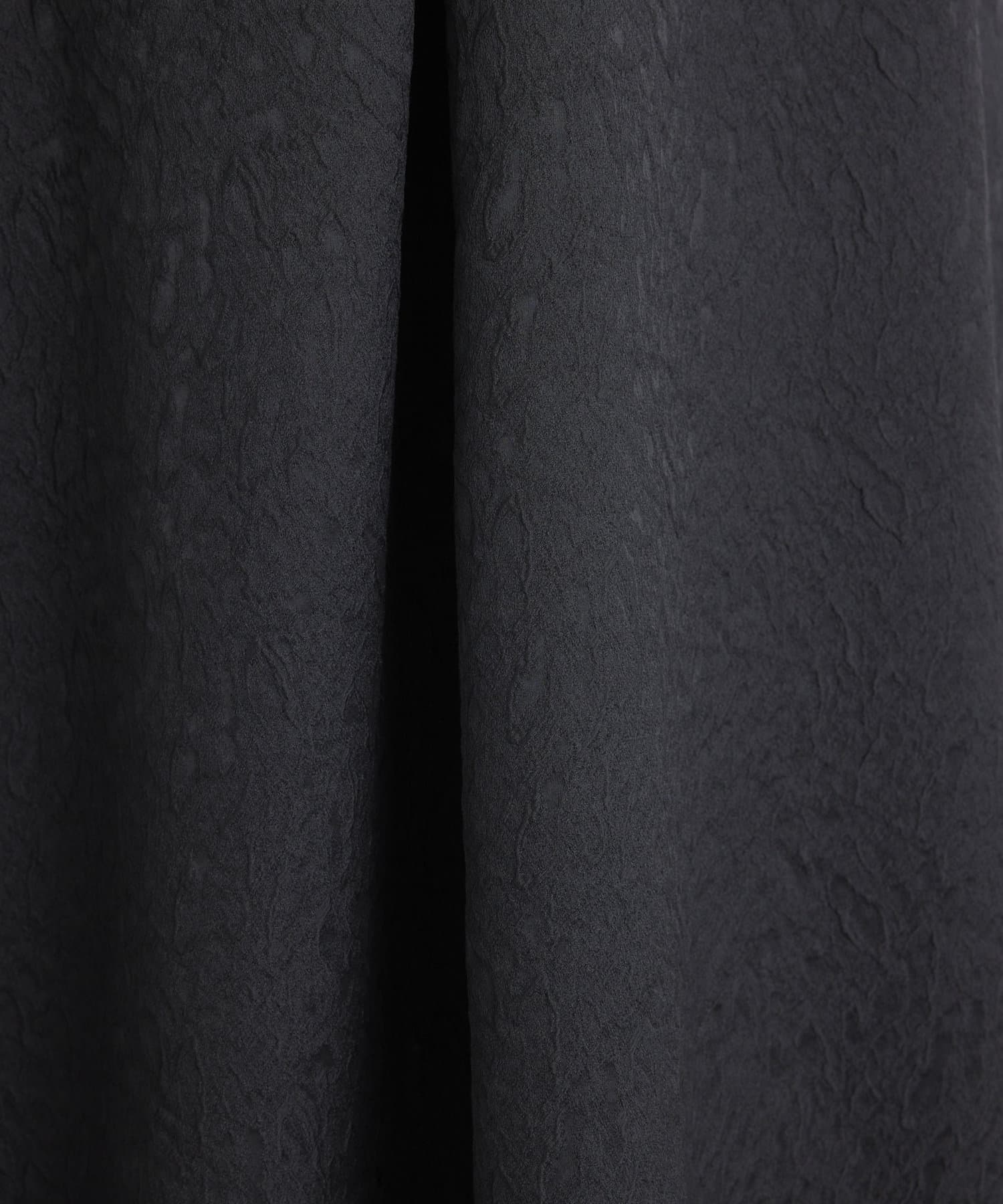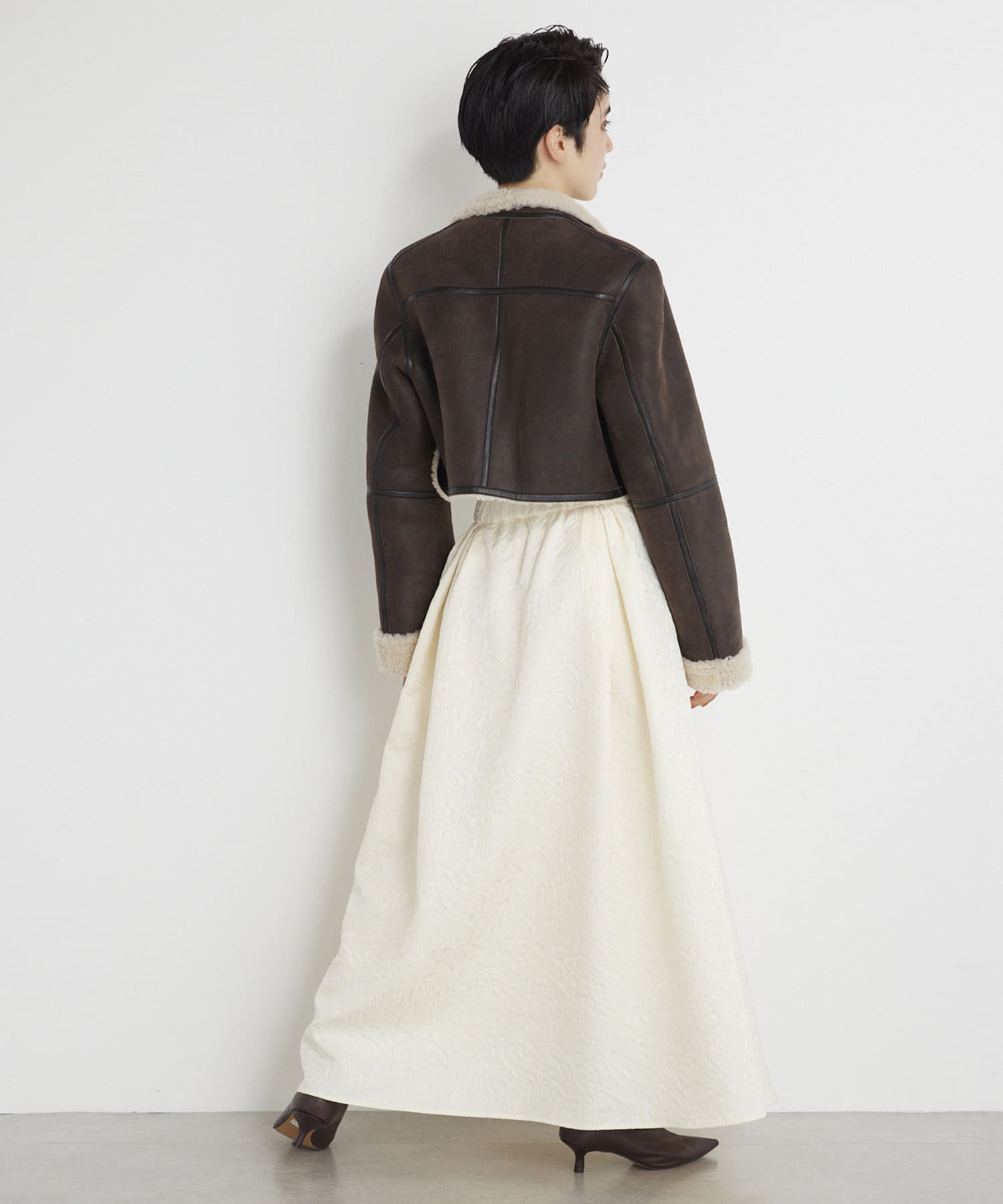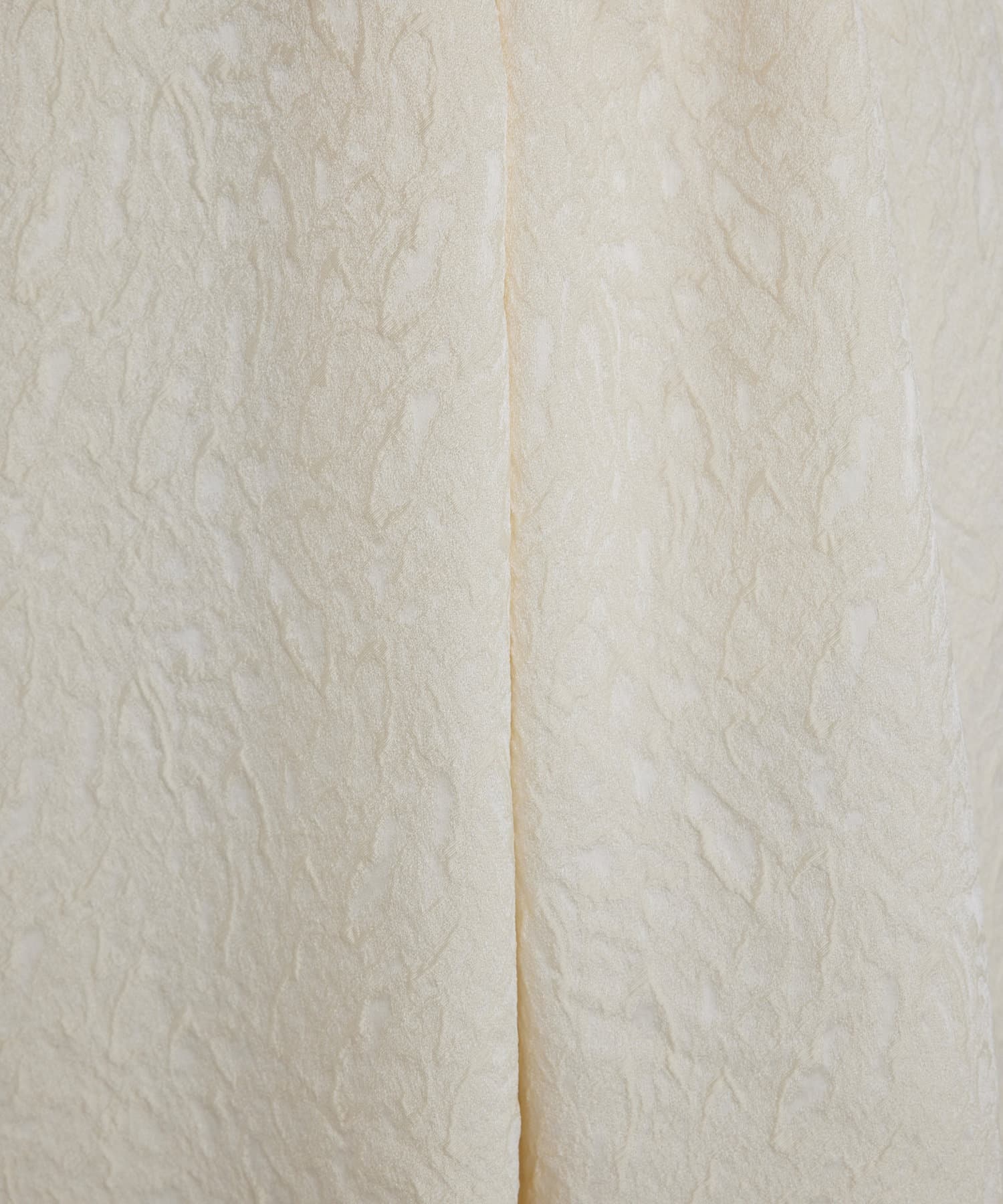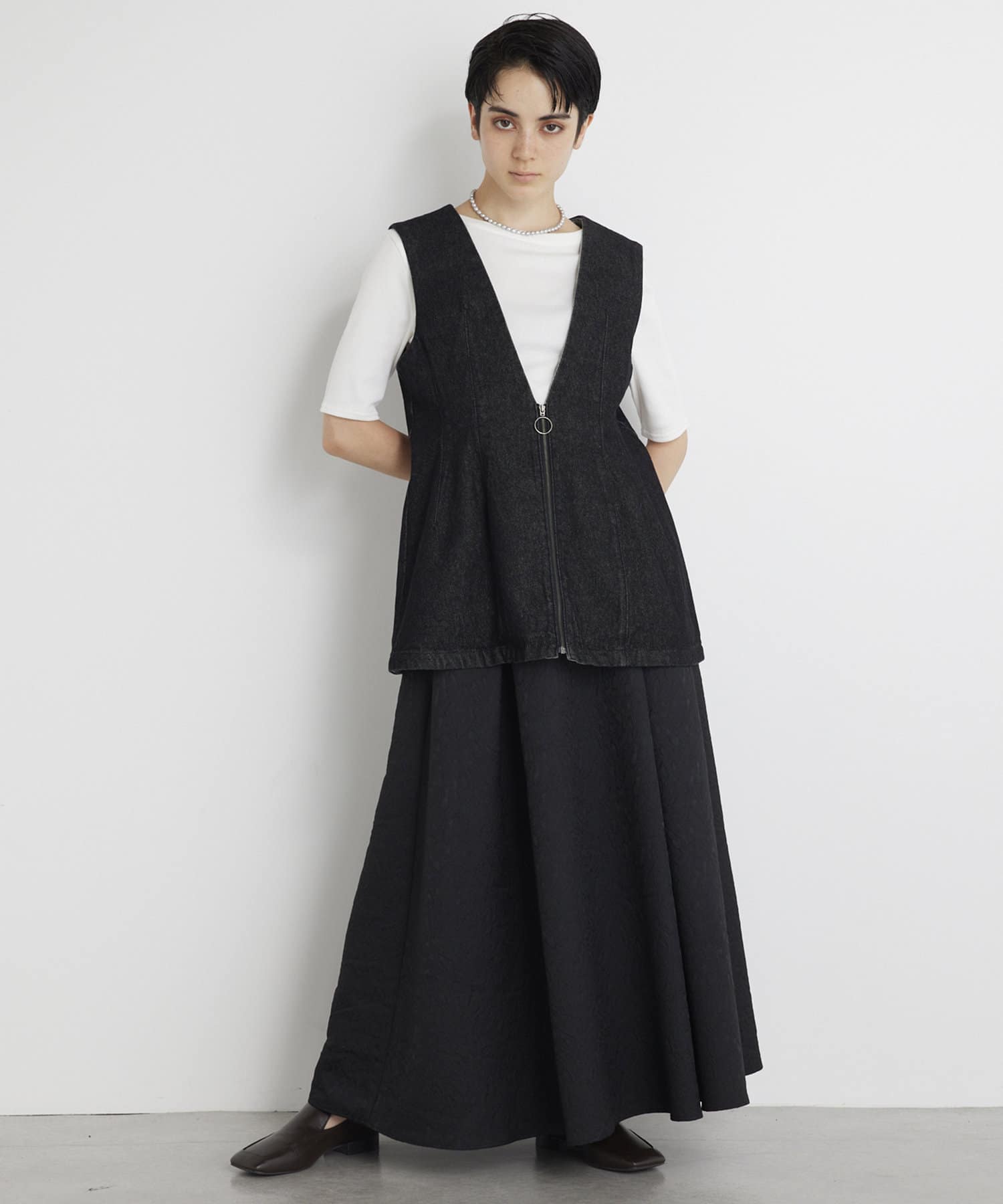 ハリを楽しむ上品なロングスカート。ジャガード生地が差をつけます。タックが入ることにより、より美しいシルエットに。一枚で着映えるスカートだと思います。シューズはフラットからロングブーツまで楽しめますよ。季節を問わず投入できます!
