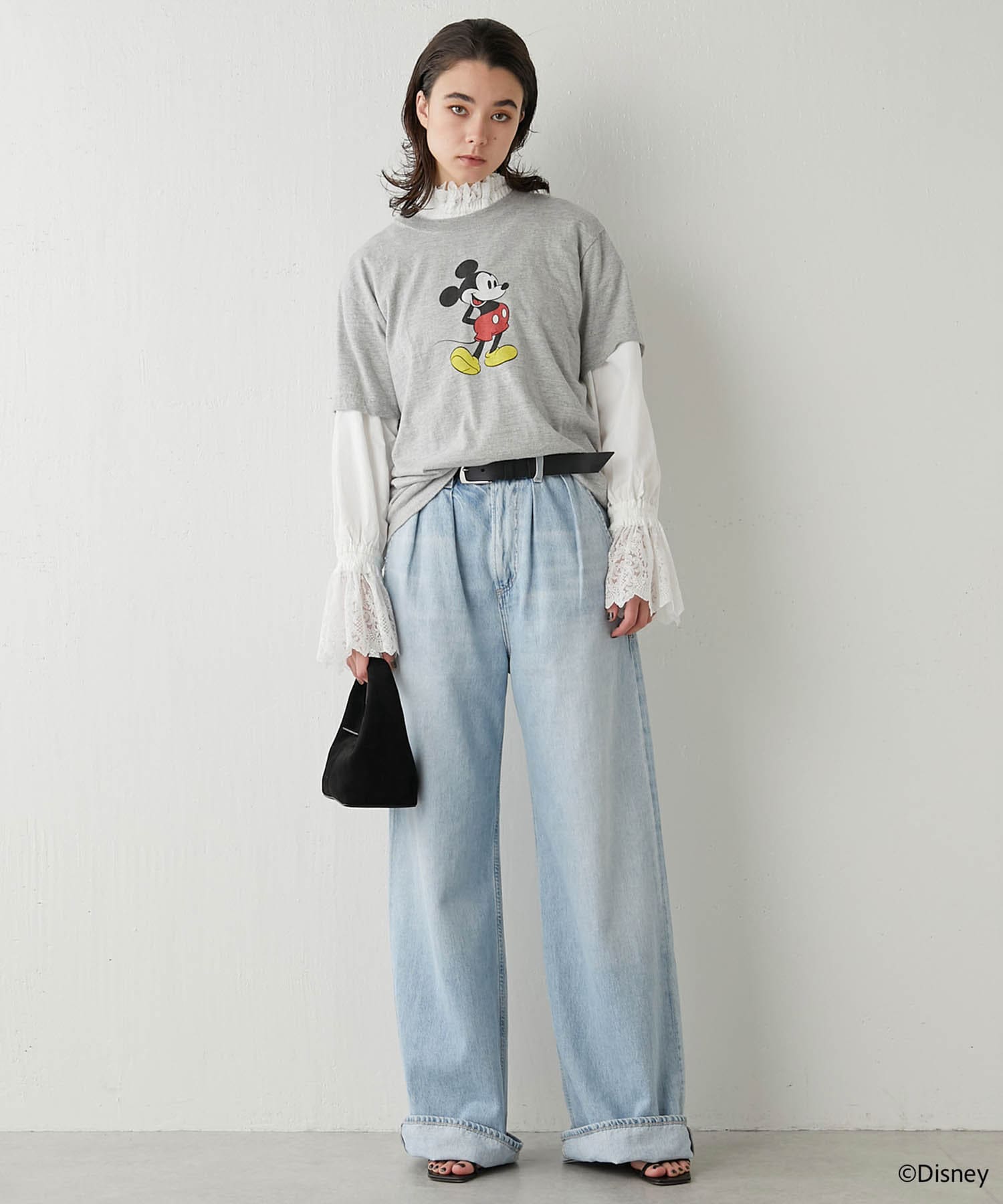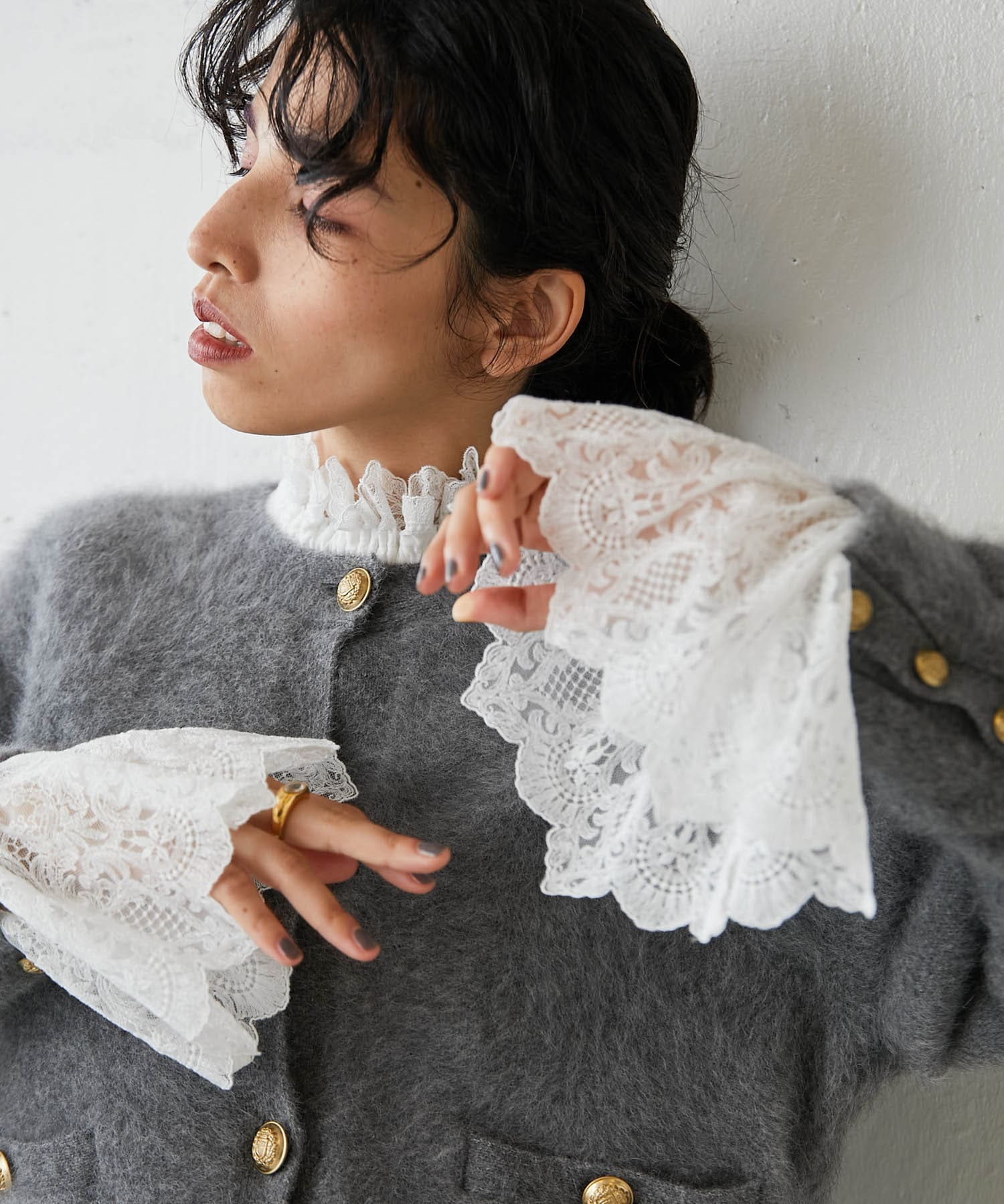 ■一枚で楽しむのはもちろん、ニットやジャケットのインナーに合わせてレースを覗かせるレイヤードスタイルもおすすめ。