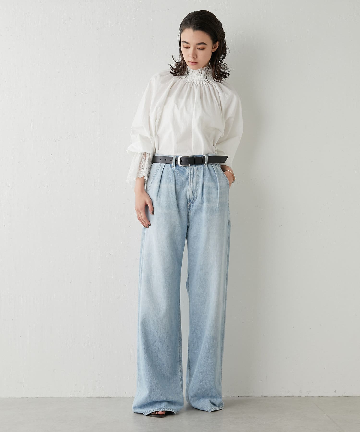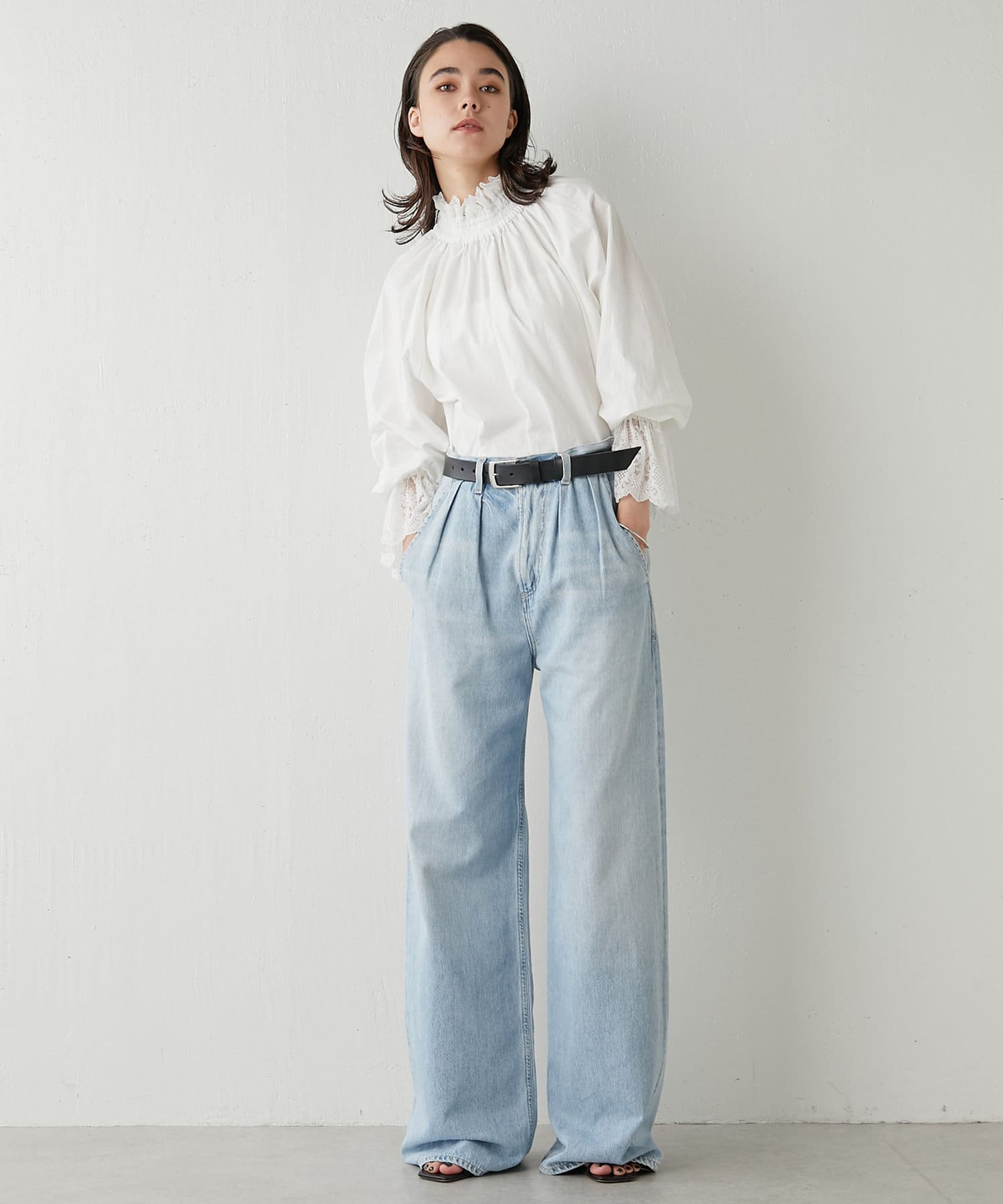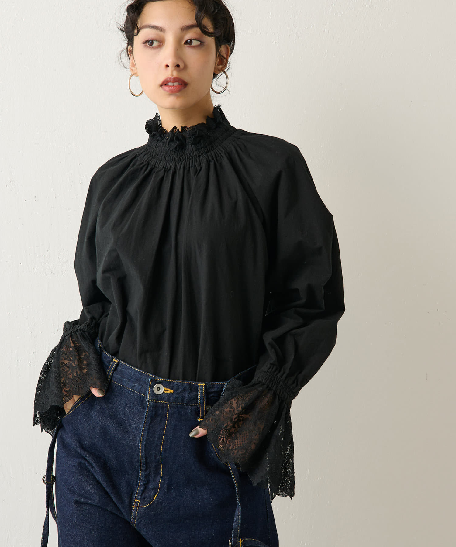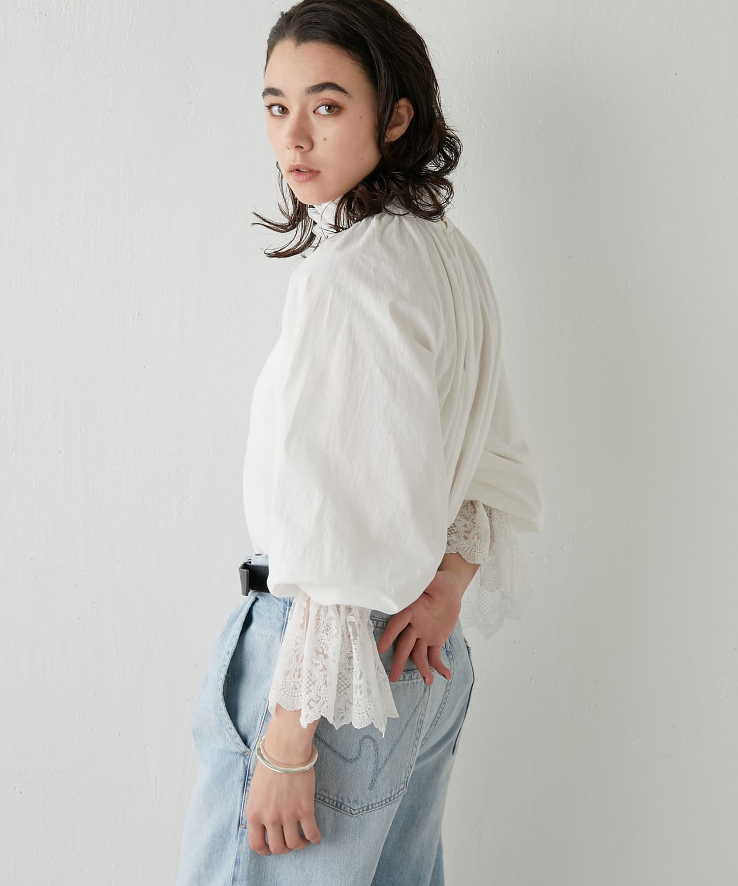 お問合せの多かった魅力的なレースブラウス。袖口の華やかさと、襟元のスタンド具合が目をひくアイテム。オーバーサイズ気味のシルエットがこなれ感を出してくれます。一枚ではもちろんのこと、ニットやジャケット合わせもおすすめです!