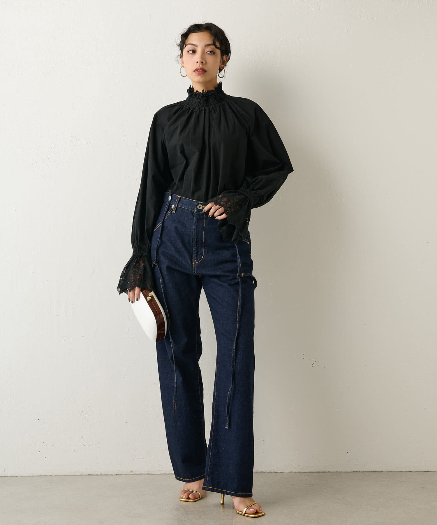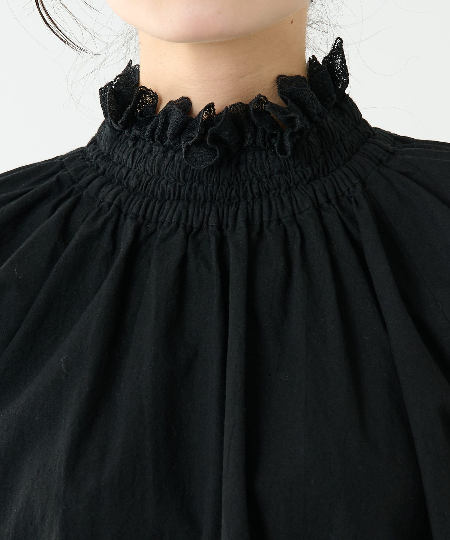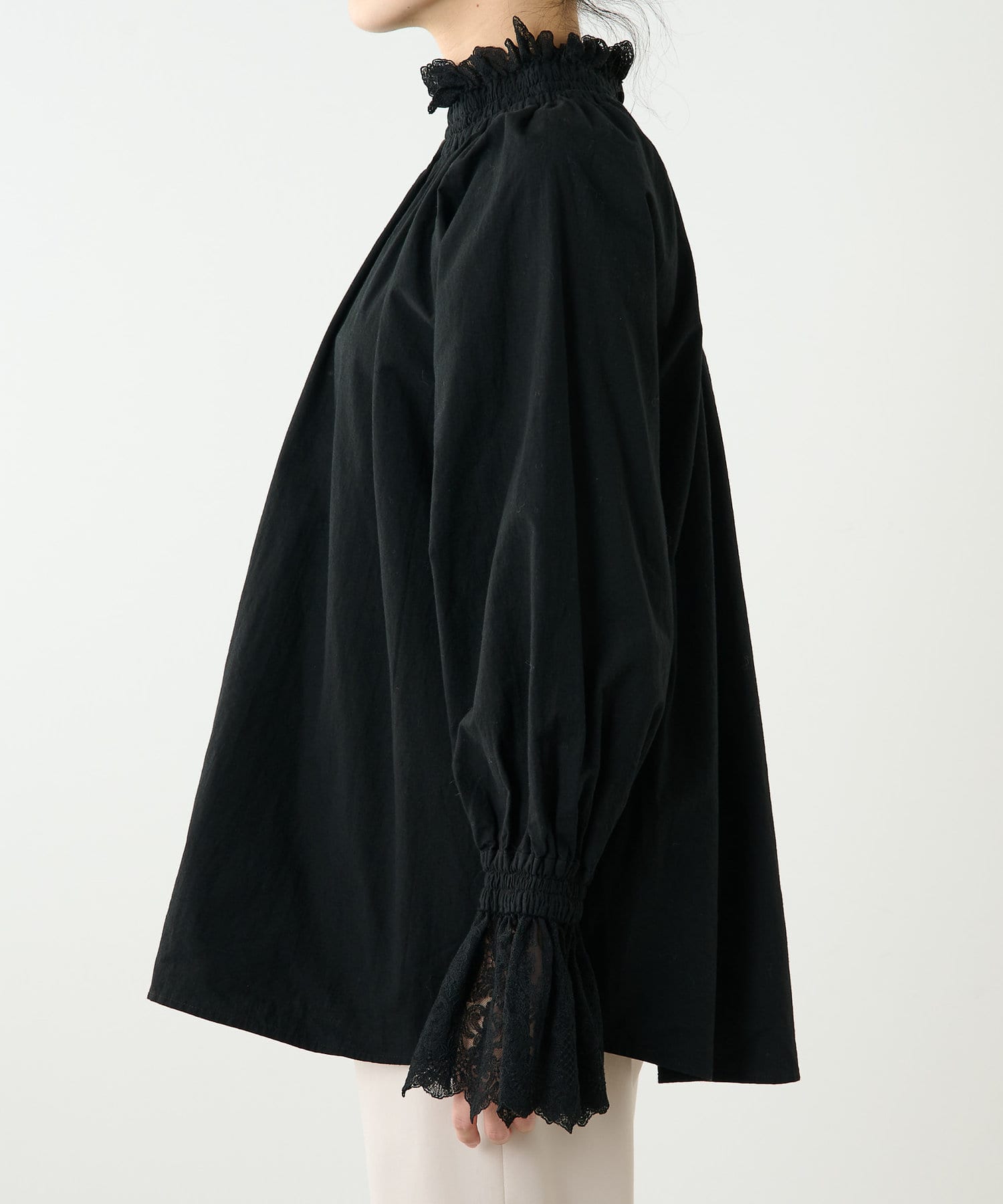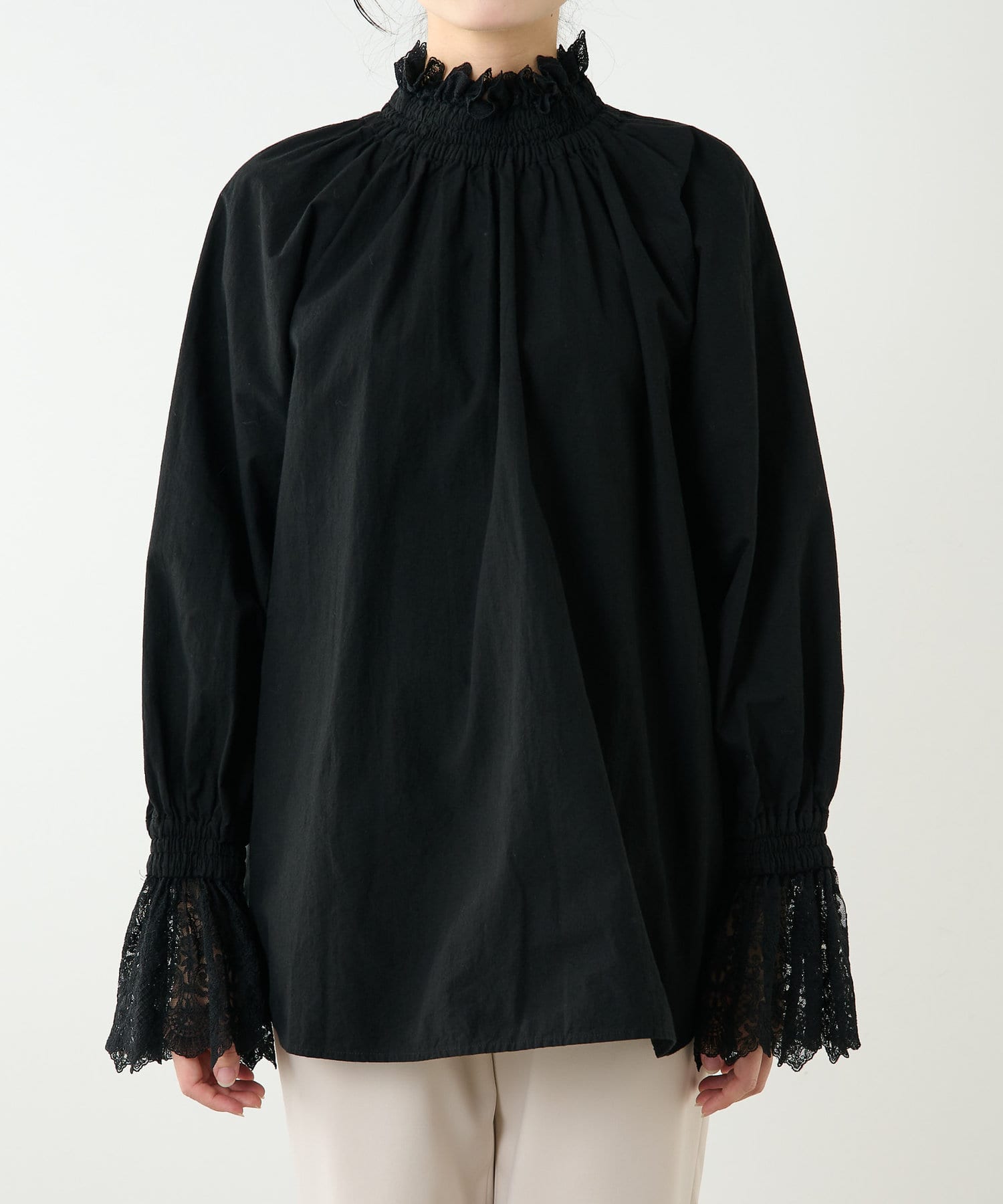 繊細なレース使いが美しい、大人のスタンドカラーブラウス