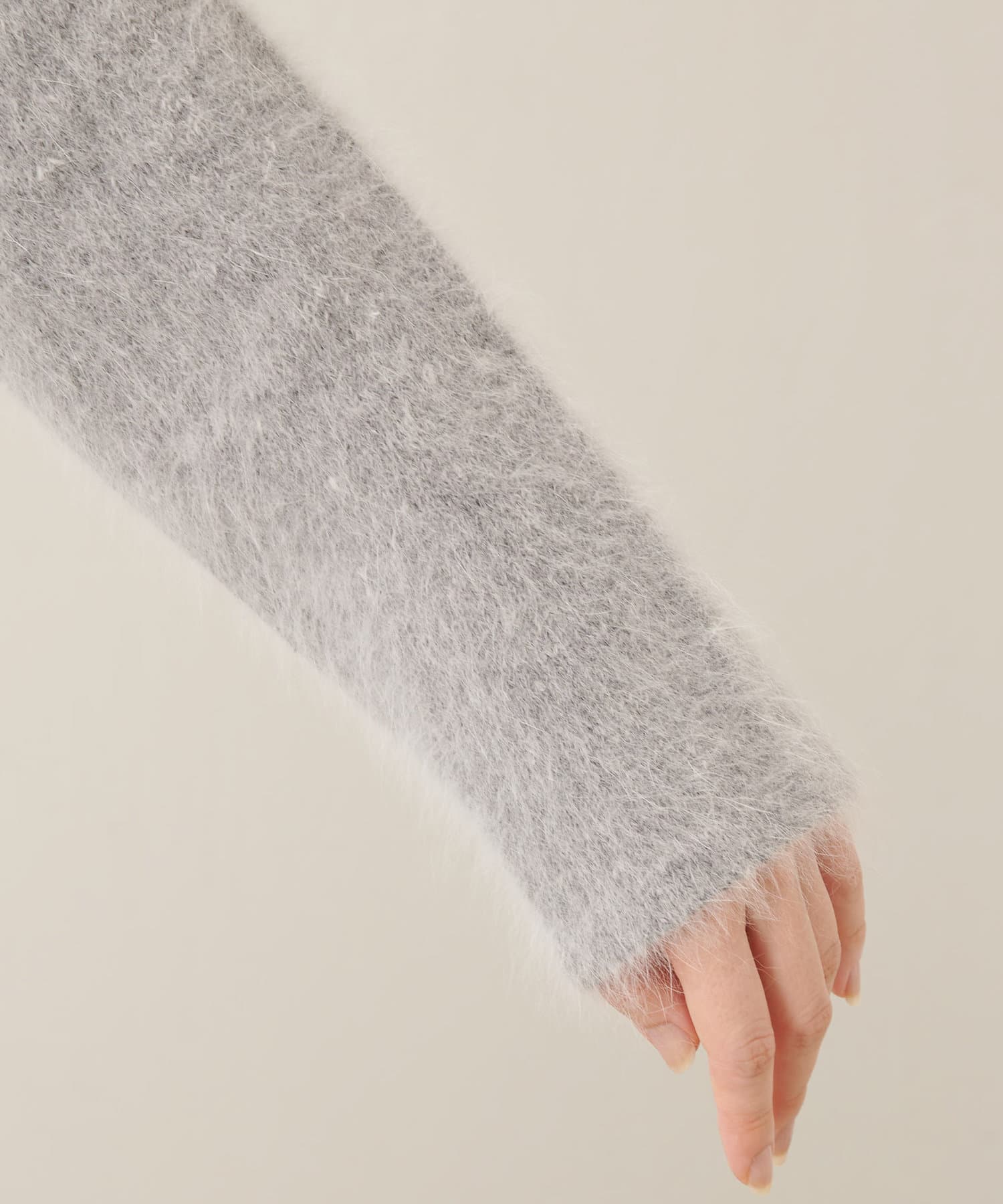 軽く柔らかで保温性に優れ、ふわふわとした肌触りが心地よく、ポリエステル糸をプレーティングして伸び・ヨレにくくしたアンゴラ混ニット。