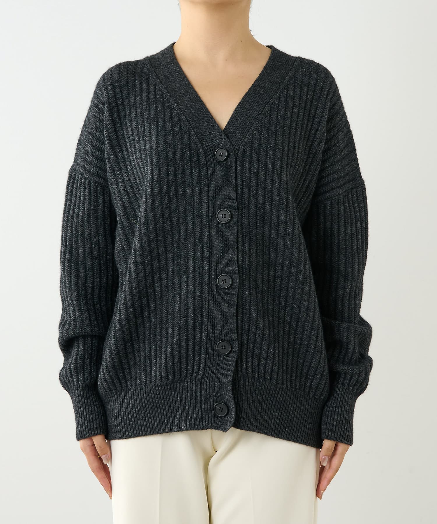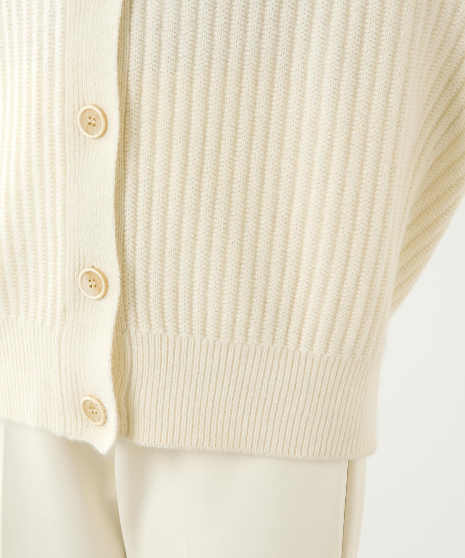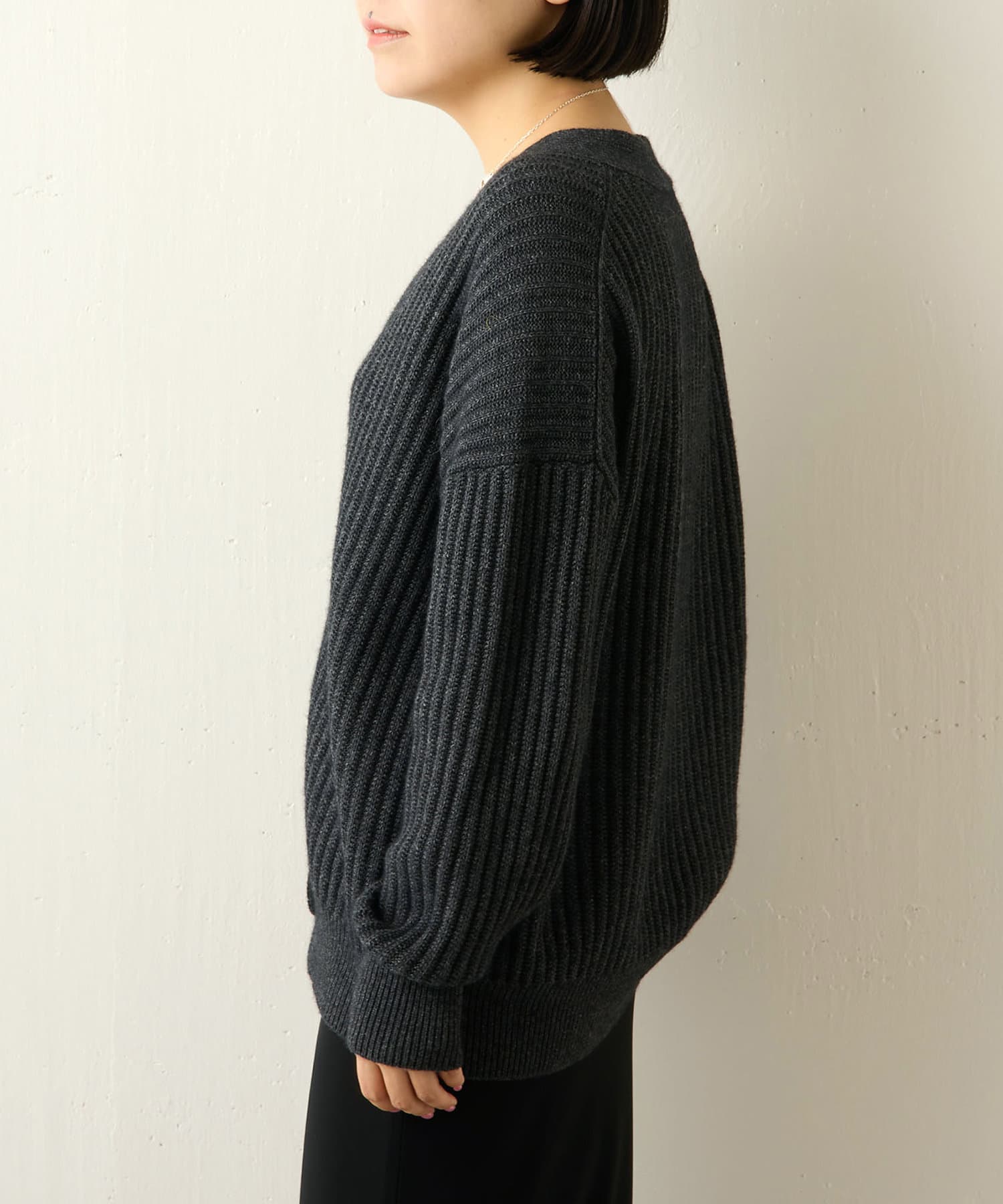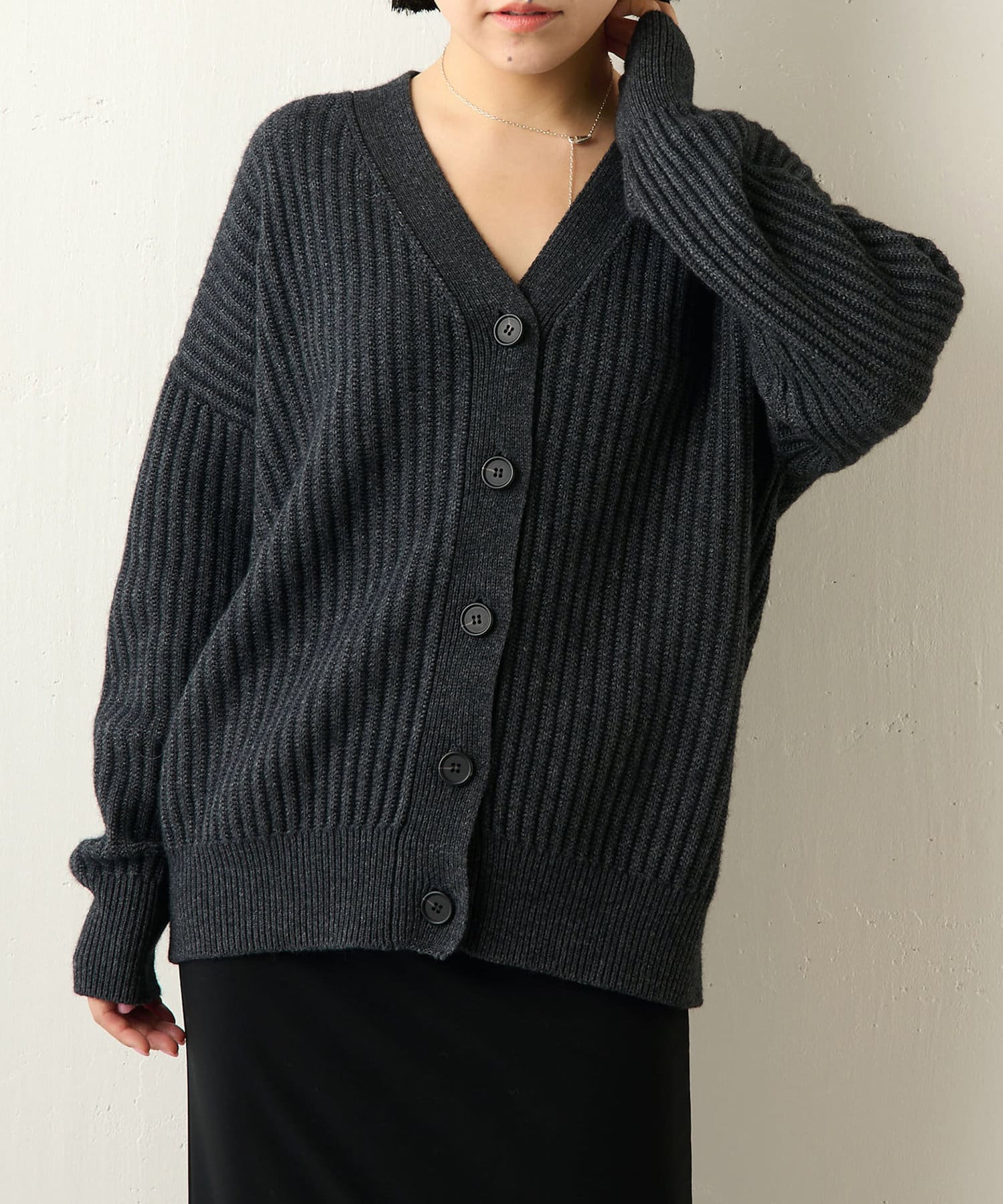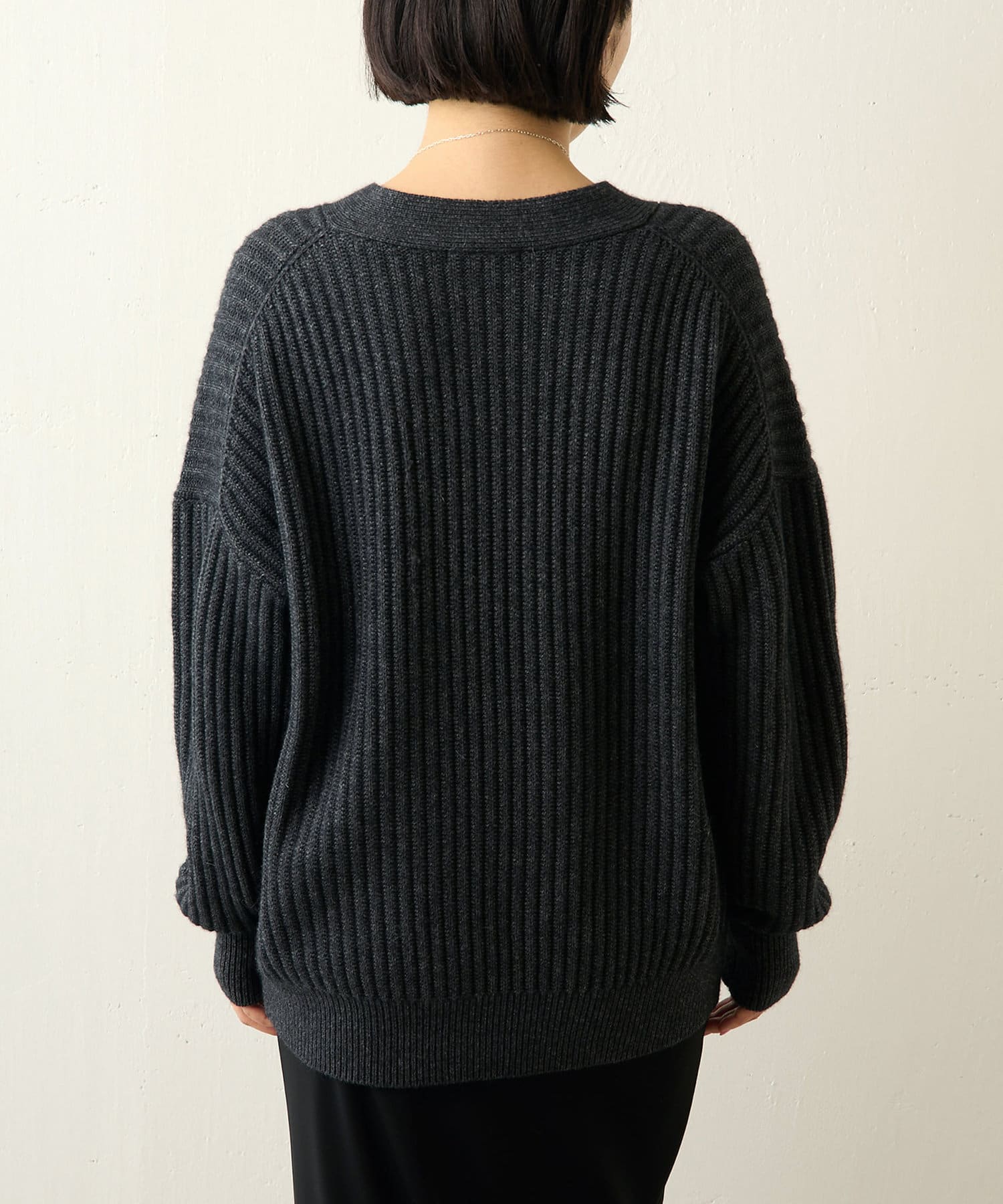 ■表情のある編地がポイントのVネック変形畦編カーディガン。