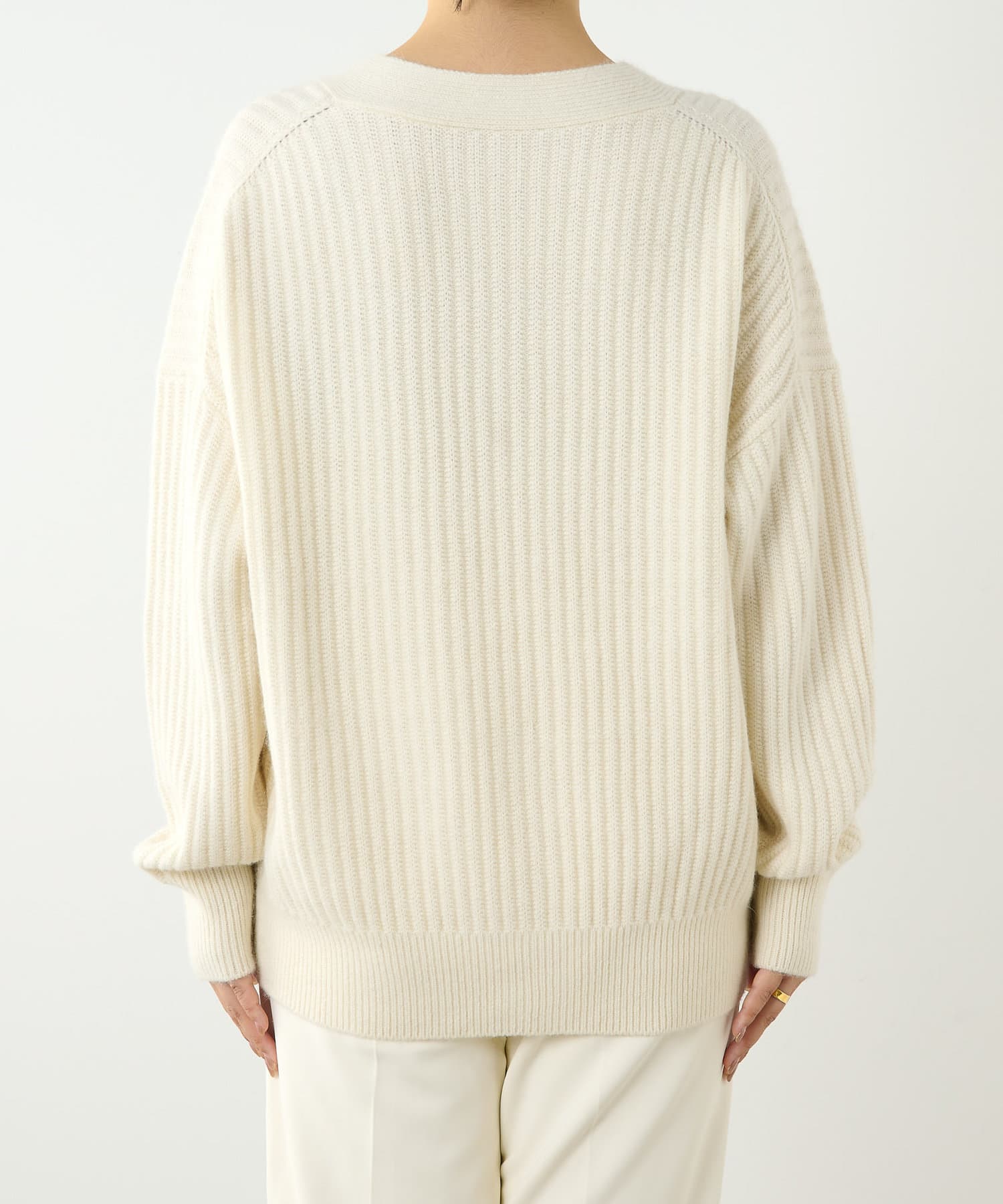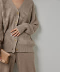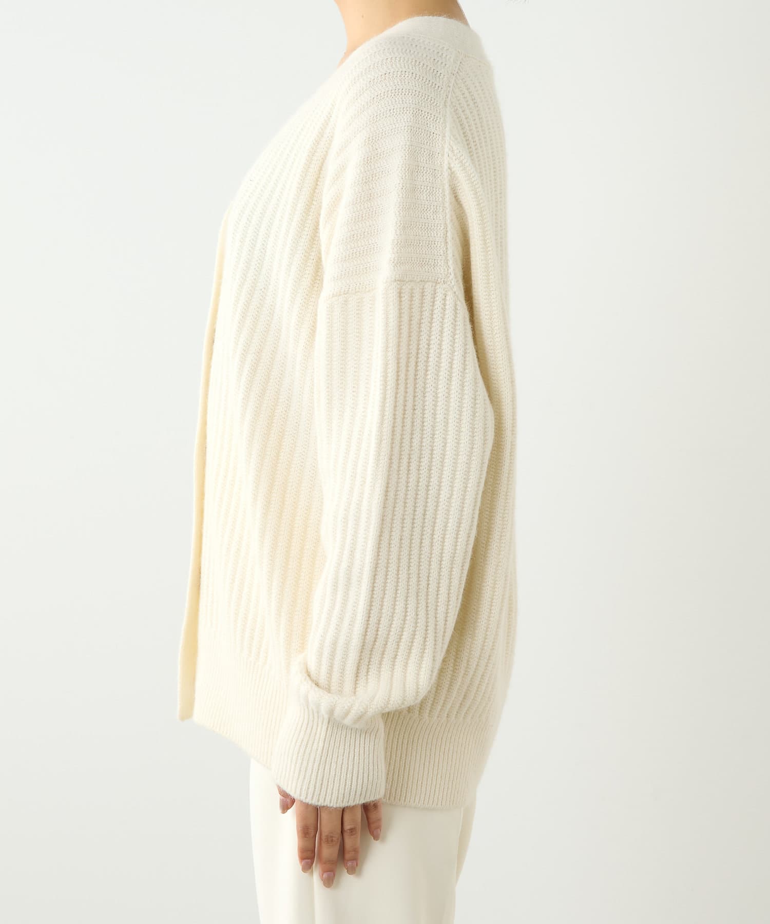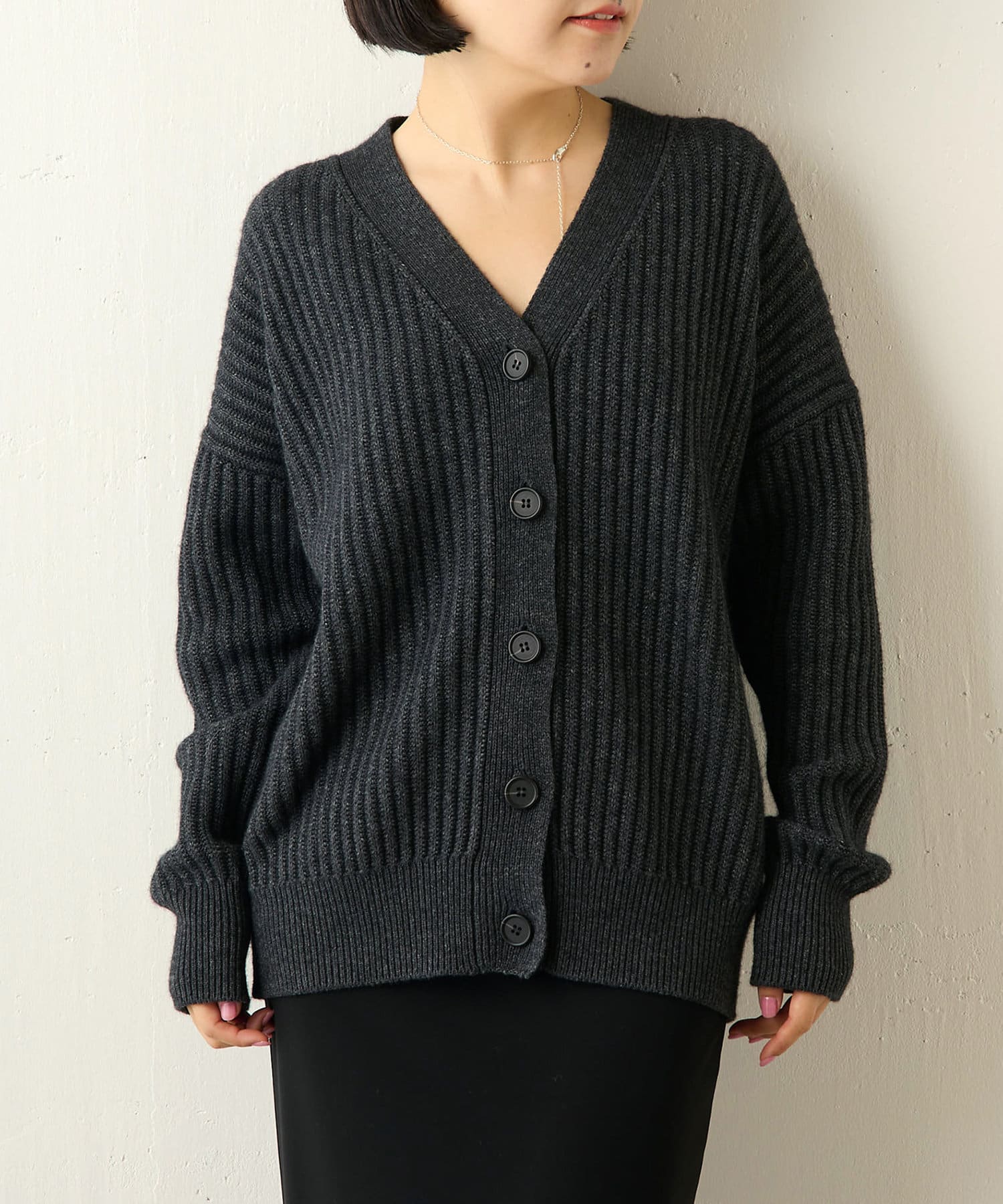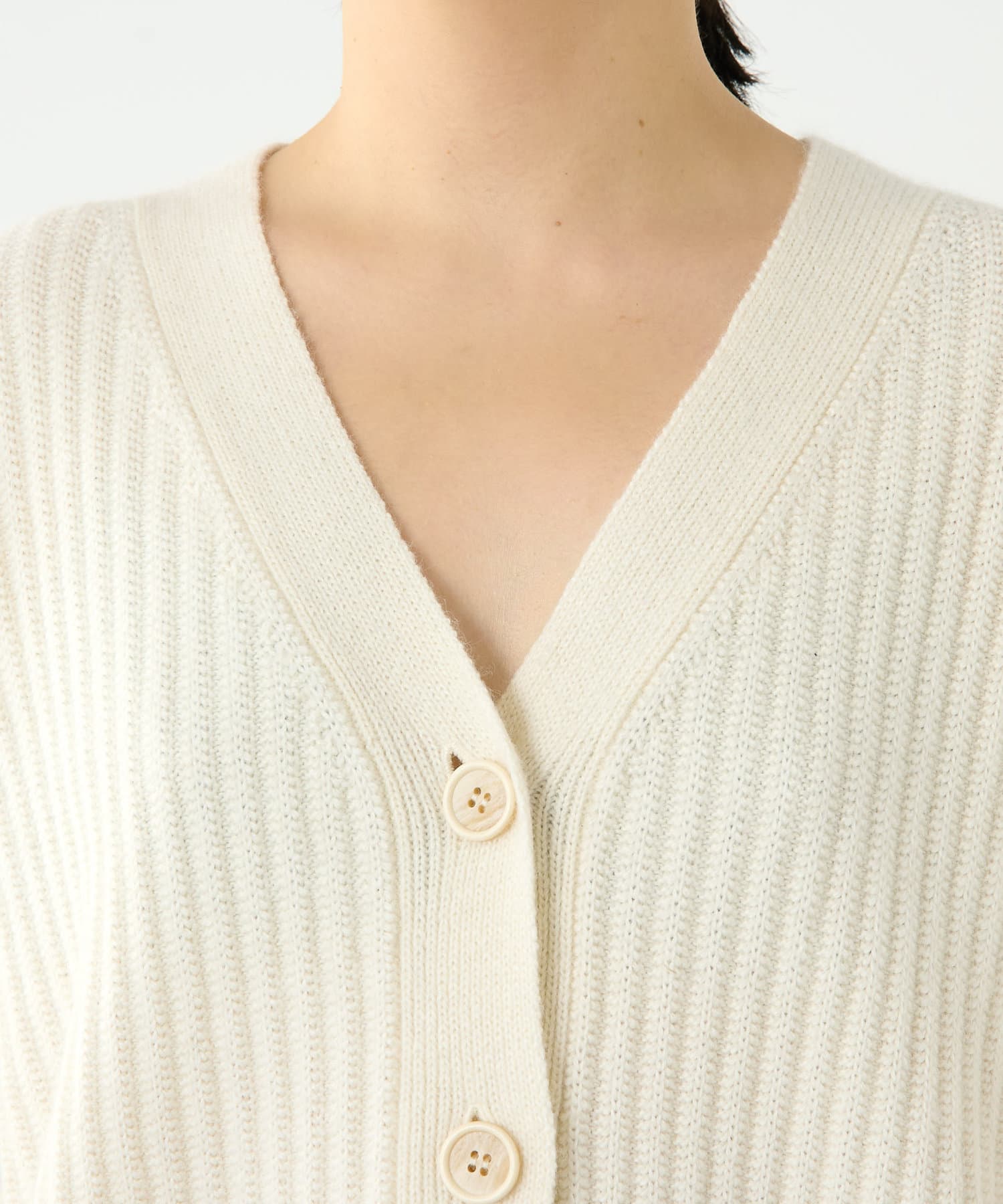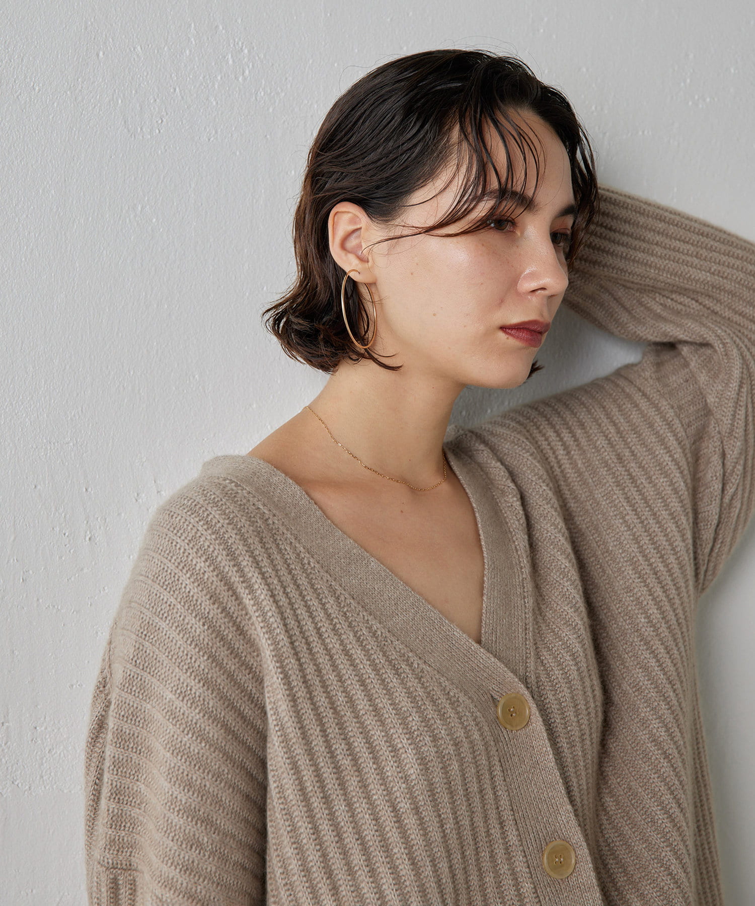 ■表情のある編地がポイントのVネック変形畦編カーディガン。
