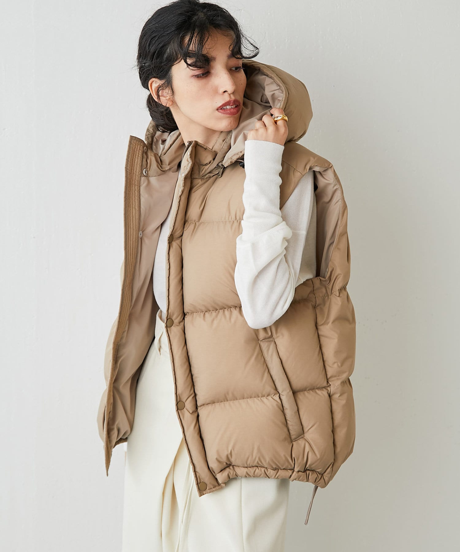 ■手首に向かってフィット感の増す袖のリブ切り替えや、ネックにぴったりと沿うタートルネックがメリハリ感をプラス。