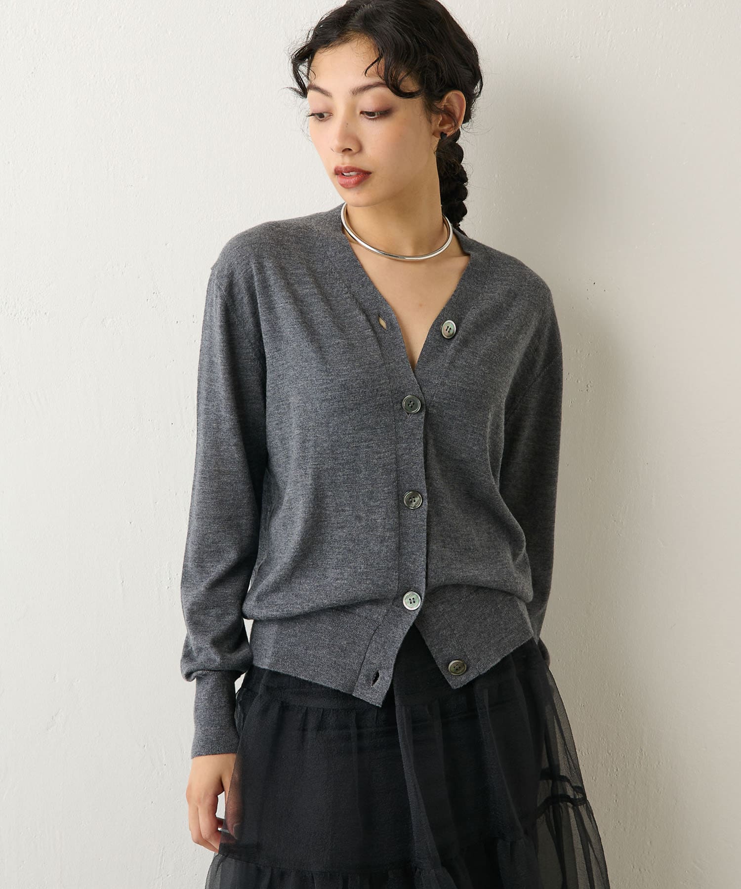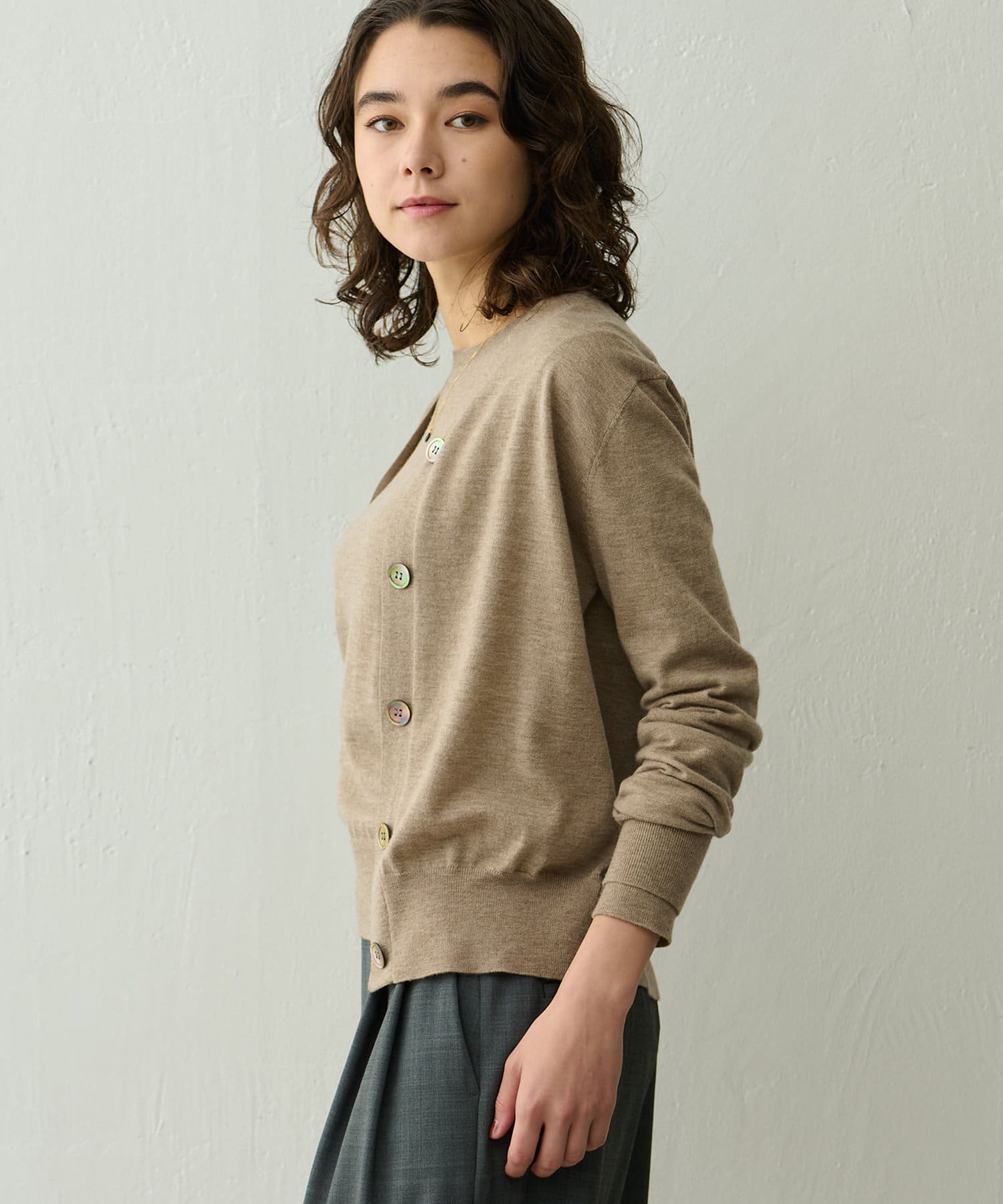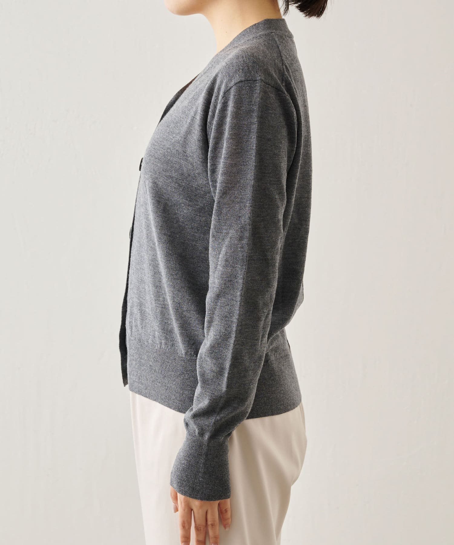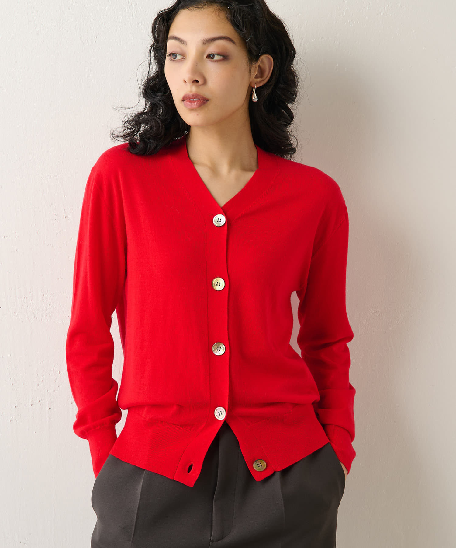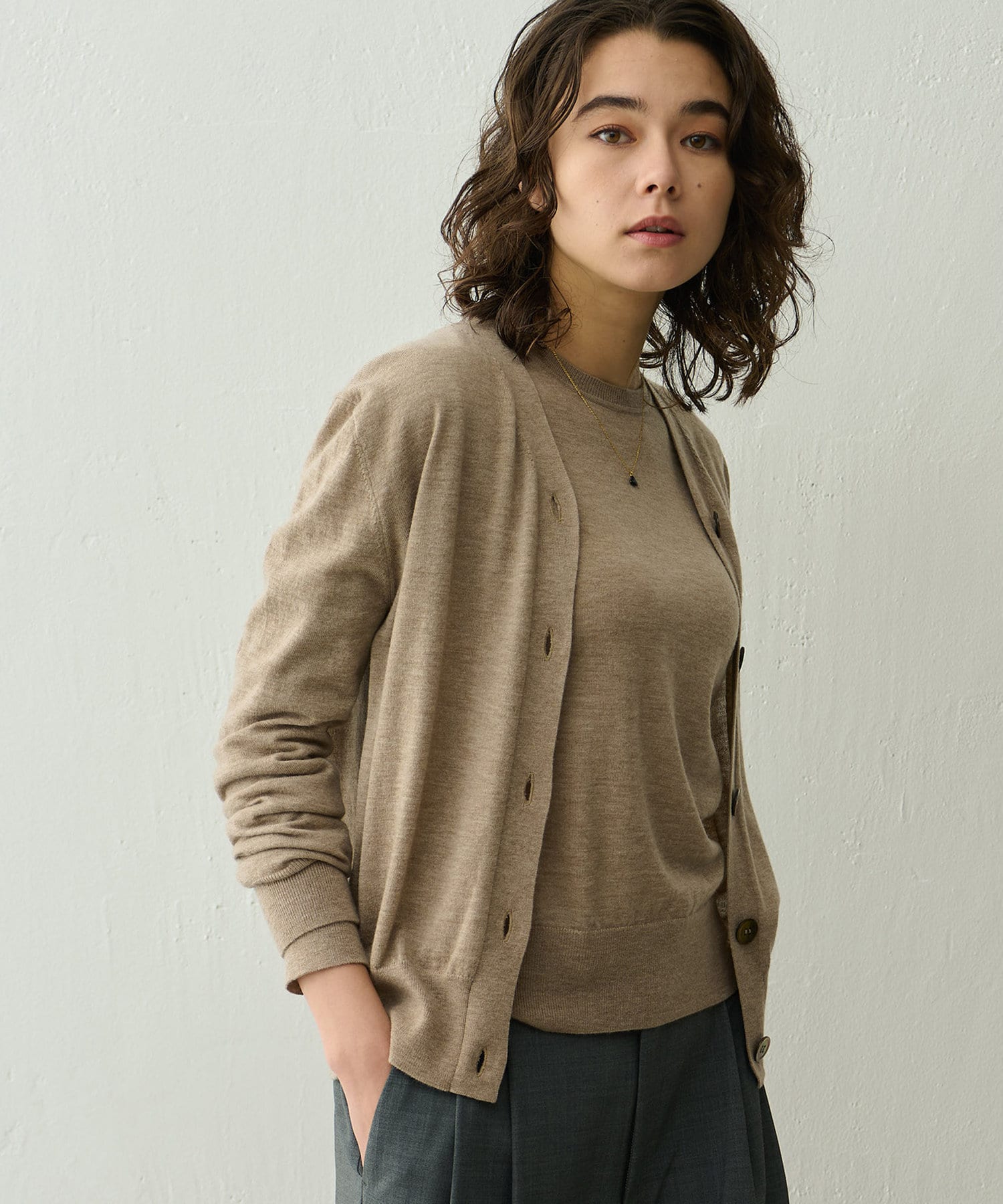 深過ぎないVネックカーディガン。ボタンを全てとめてプルオーバー風な着こなしもおすすめです。滑らかな肌のあたりで生地感が最高。薄手のニットは秋の始まりに活躍し、冬は素材感のあるボトムとの合わせも素敵ですよ。