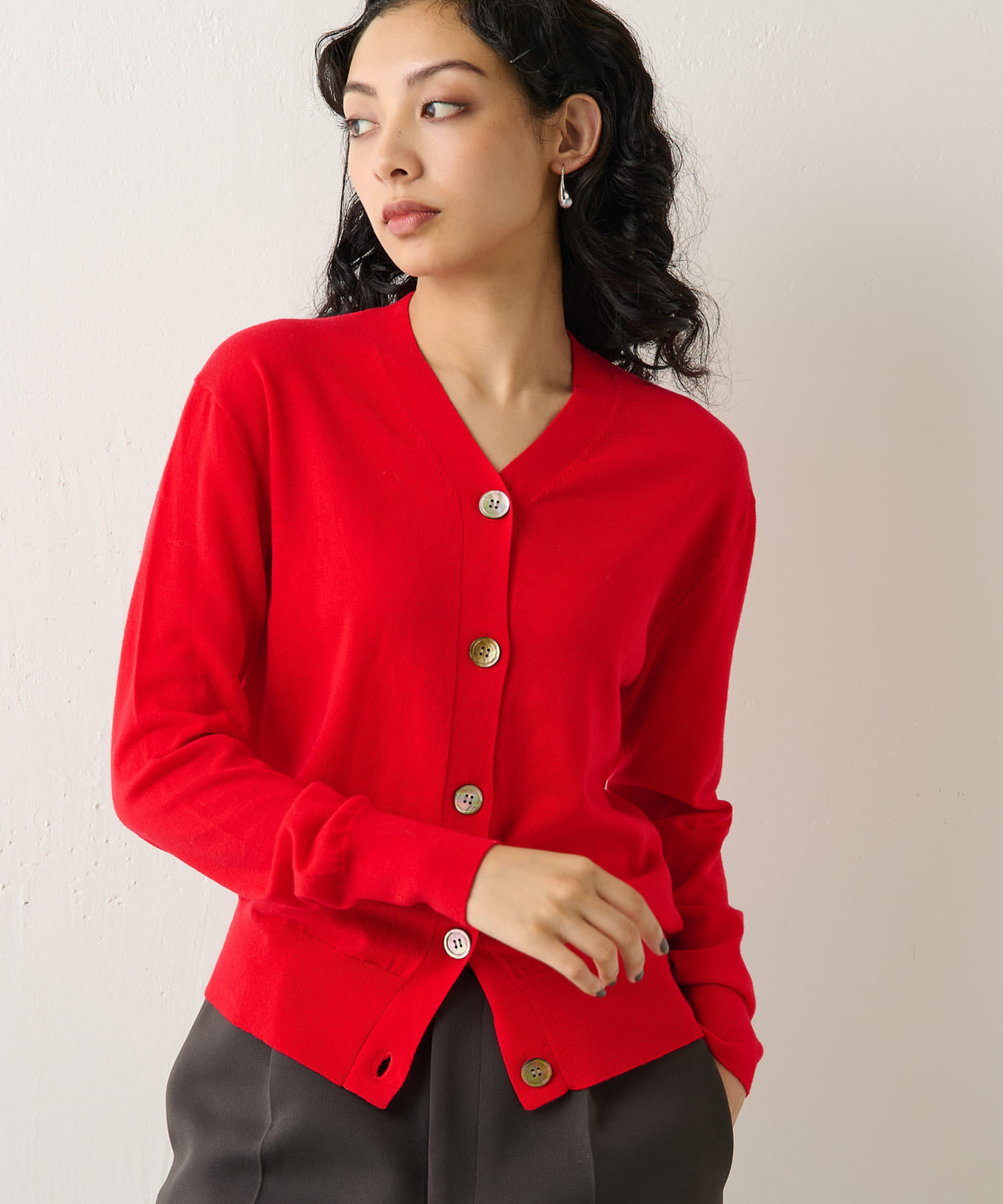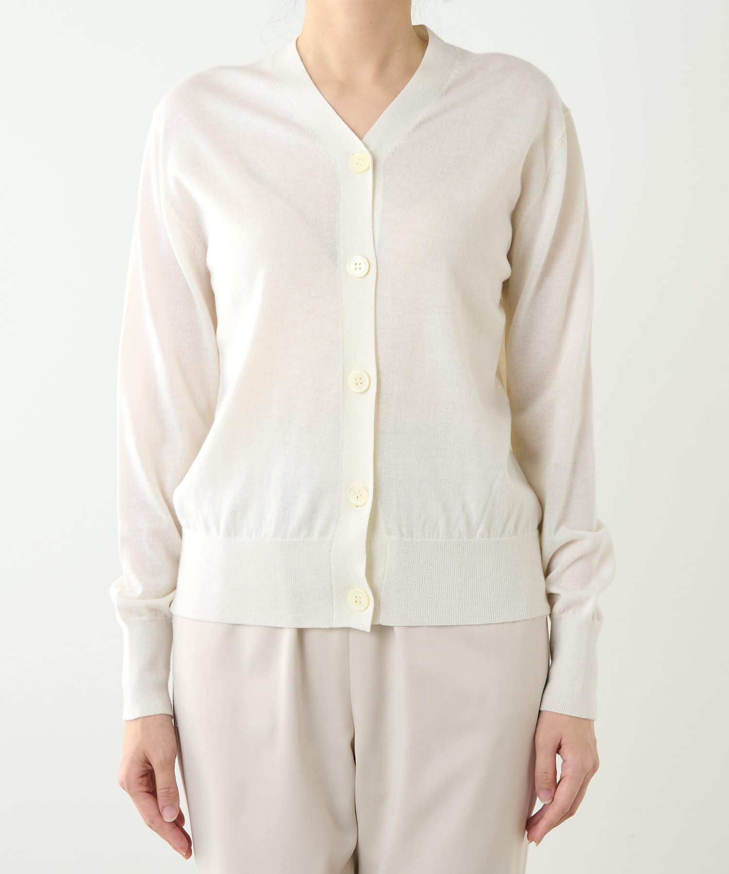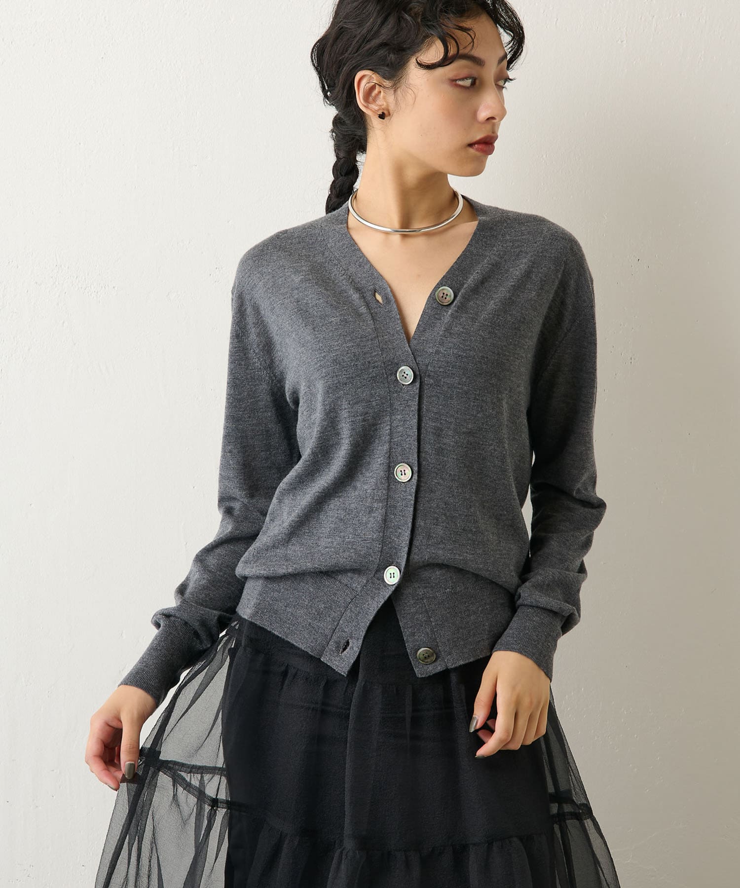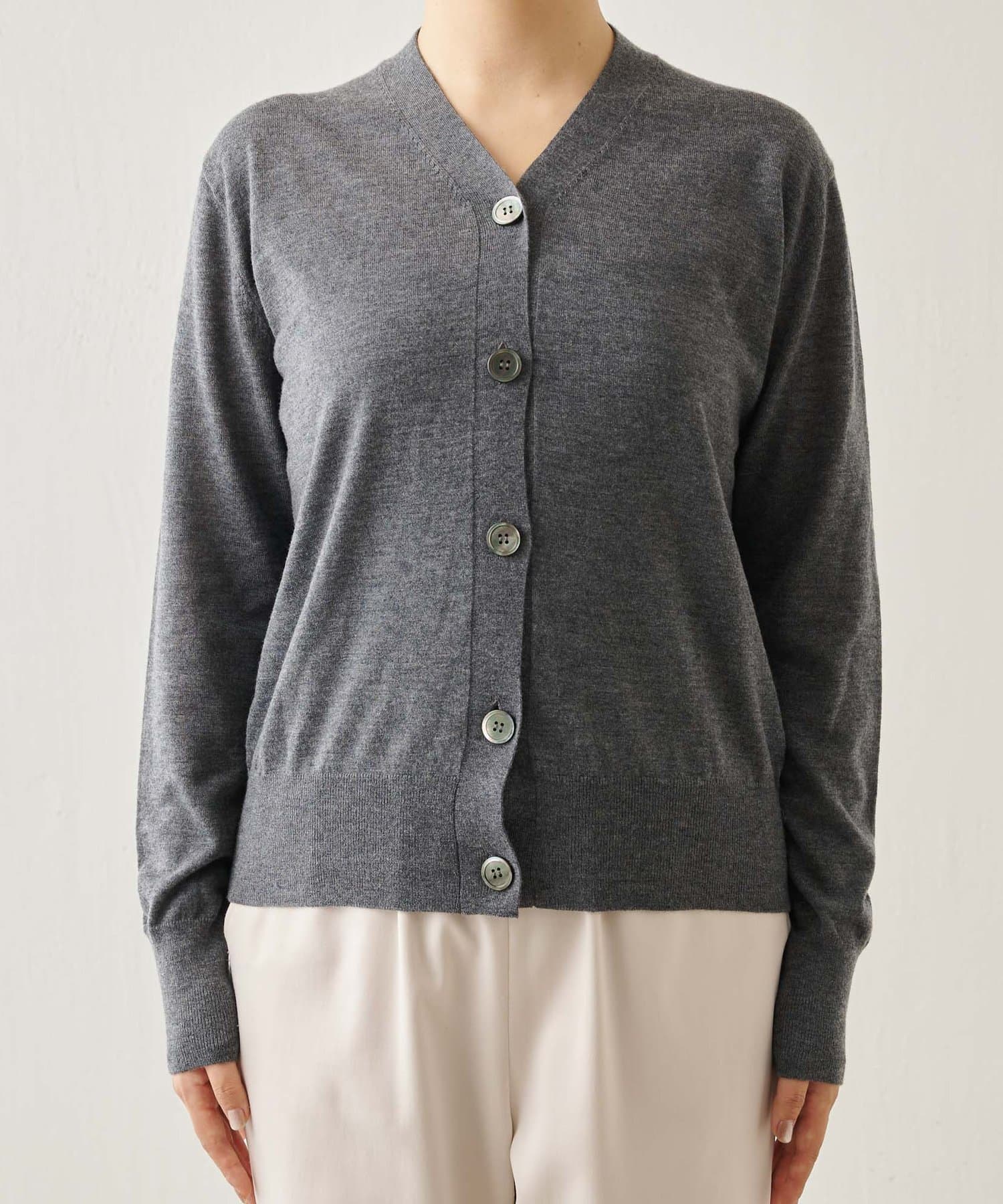 深過ぎないVネックカーディガン。ボタンを全てとめてプルオーバー風な着こなしもおすすめです。滑らかな肌のあたりで生地感が最高。薄手のニットは秋の始まりに活躍し、冬は素材感のあるボトムとの合わせも素敵ですよ。