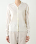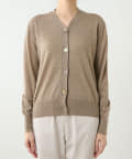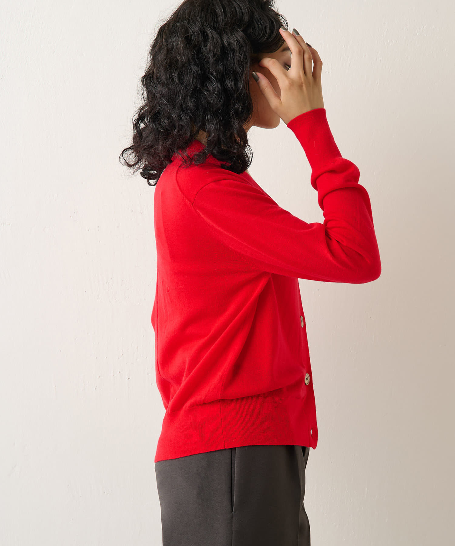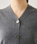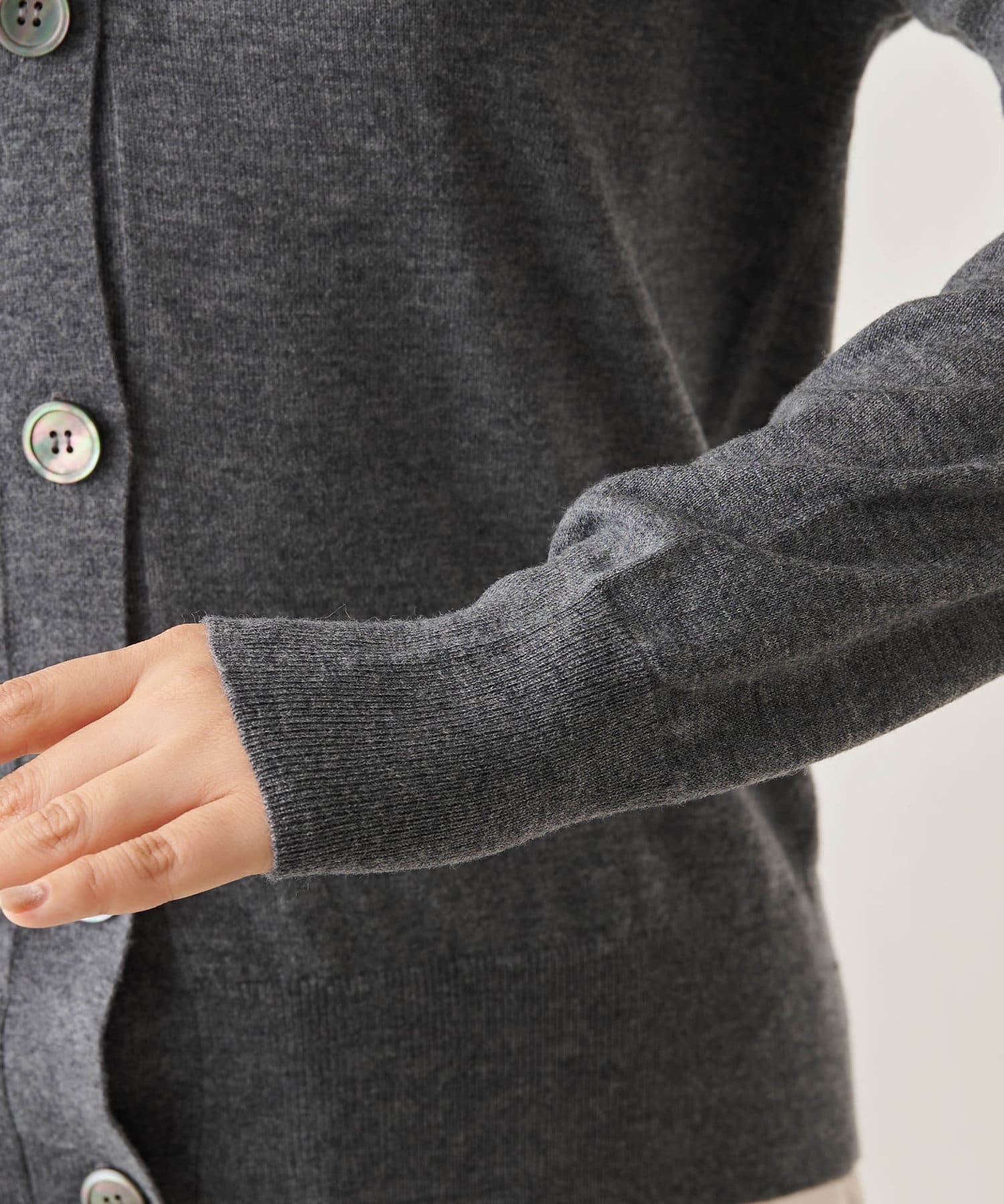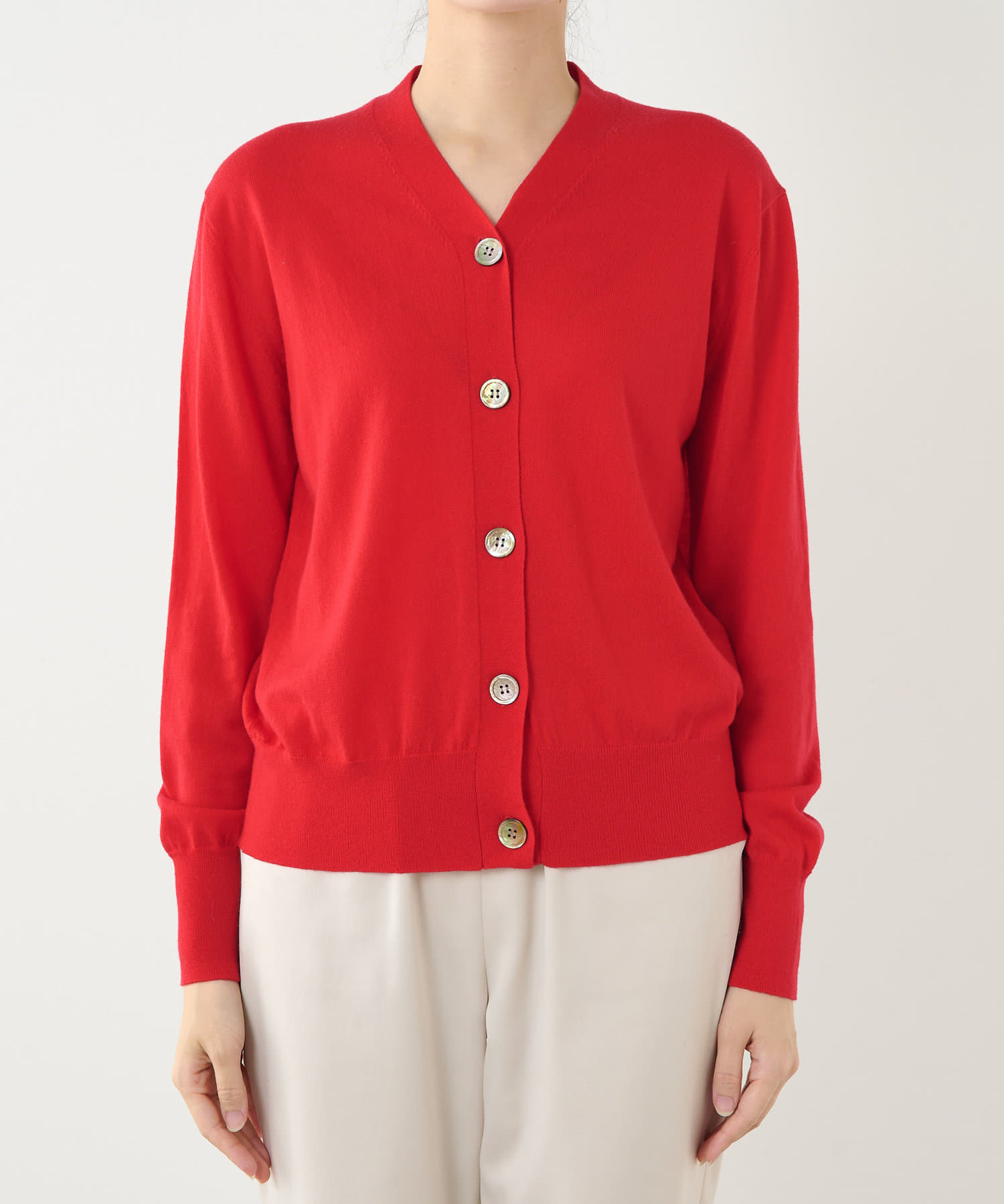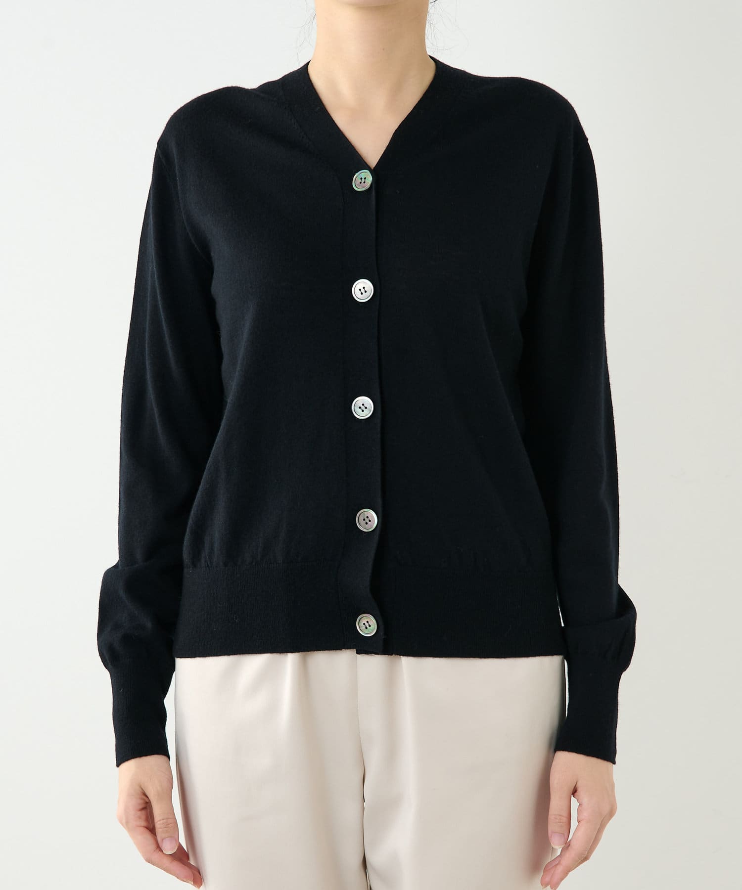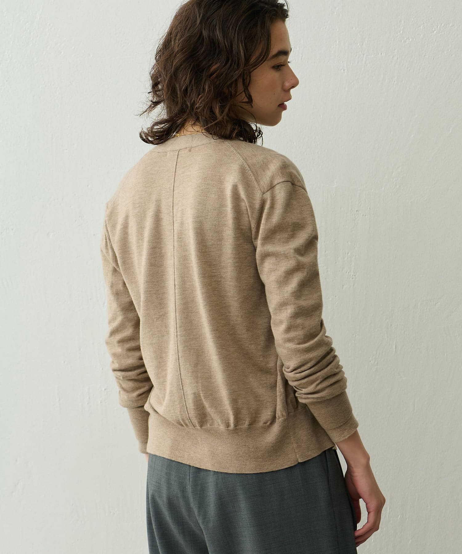 深過ぎないVネックカーディガン。ボタンを全てとめてプルオーバー風な着こなしもおすすめです。滑らかな肌のあたりで生地感が最高。薄手のニットは秋の始まりに活躍し、冬は素材感のあるボトムとの合わせも素敵ですよ。