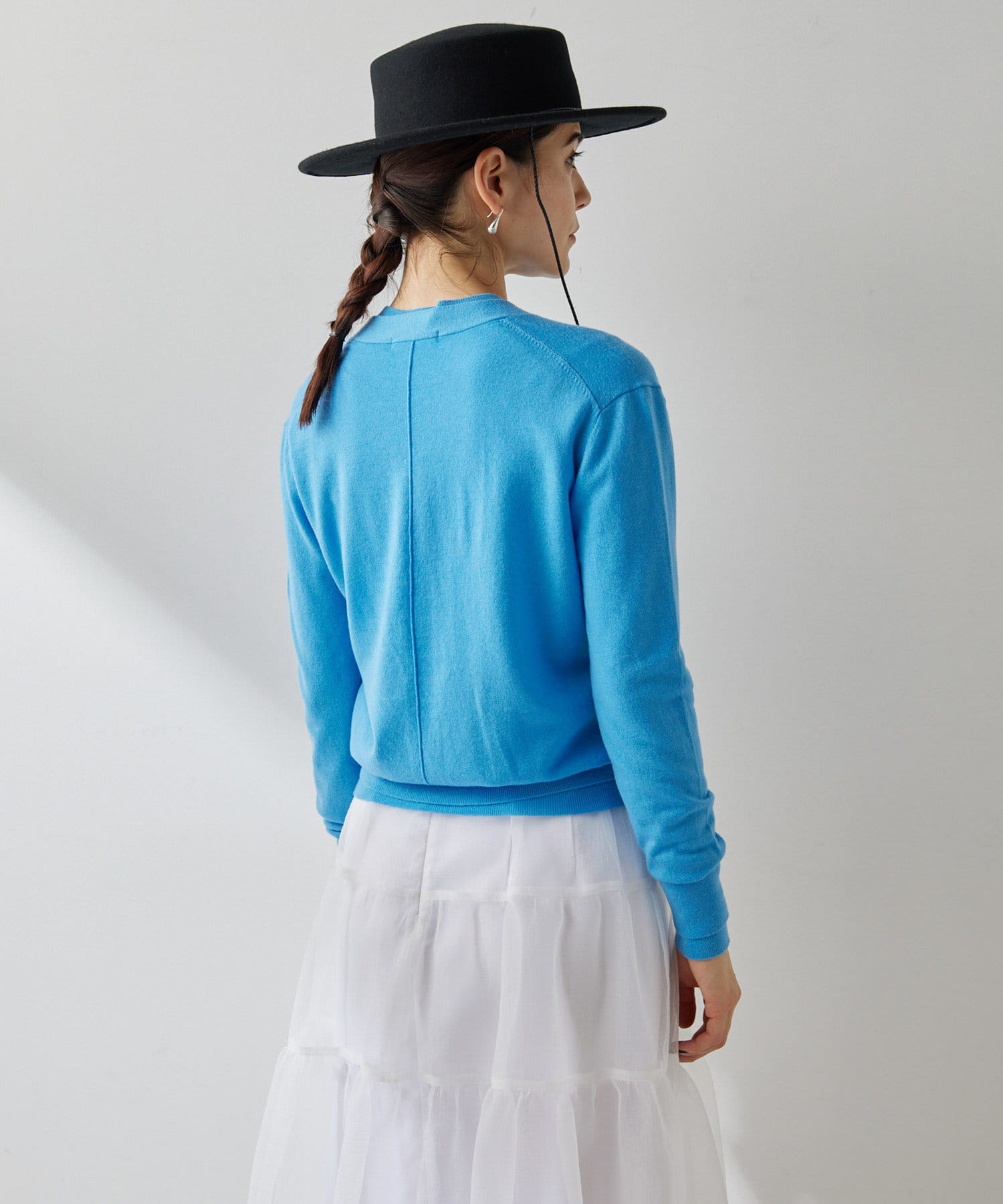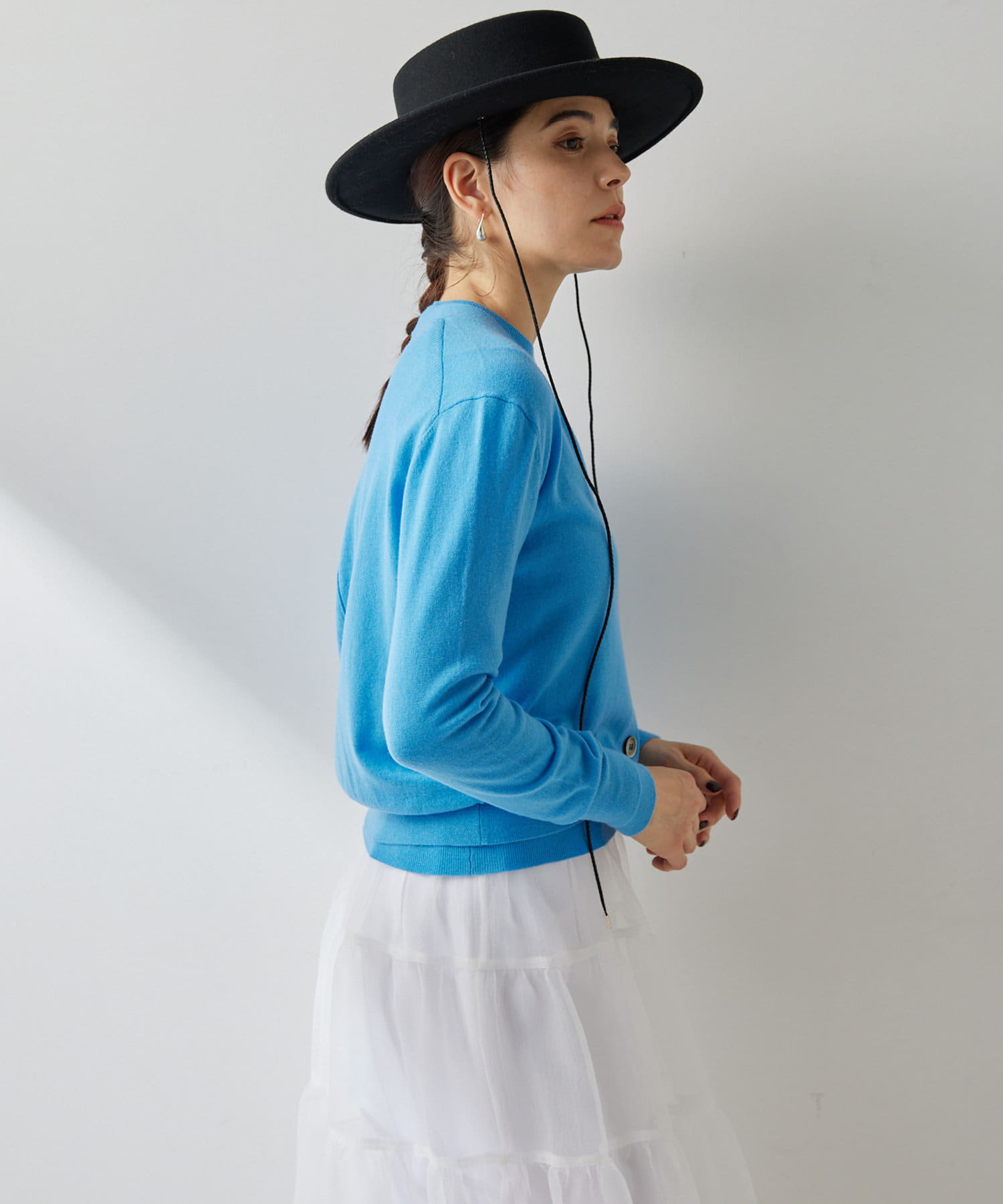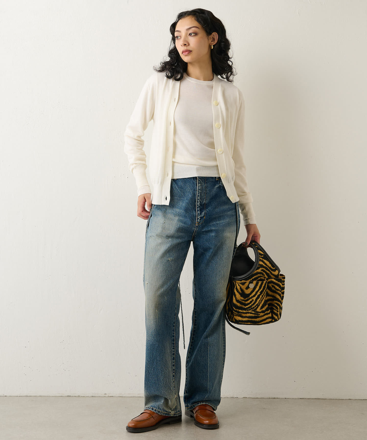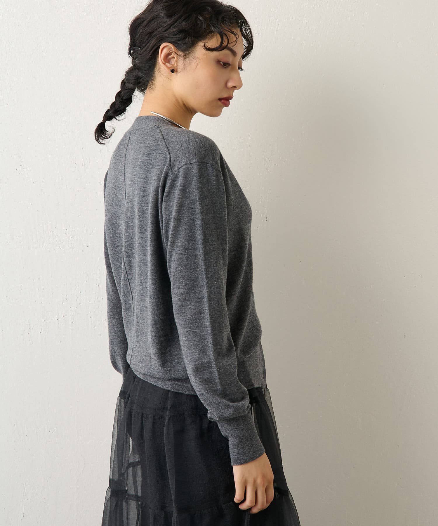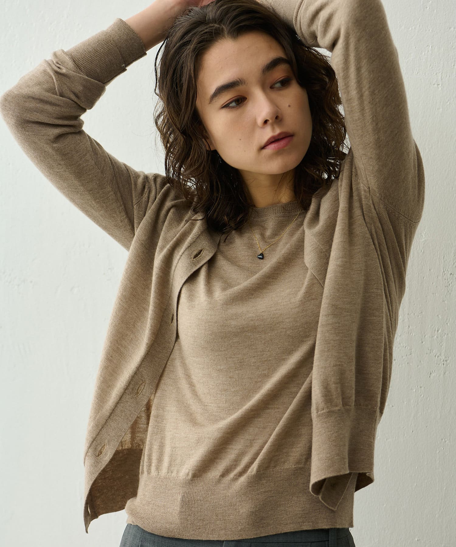 深過ぎないVネックカーディガン。ボタンを全てとめてプルオーバー風な着こなしもおすすめです。滑らかな肌のあたりで生地感が最高。薄手のニットは秋の始まりに活躍し、冬は素材感のあるボトムとの合わせも素敵ですよ。