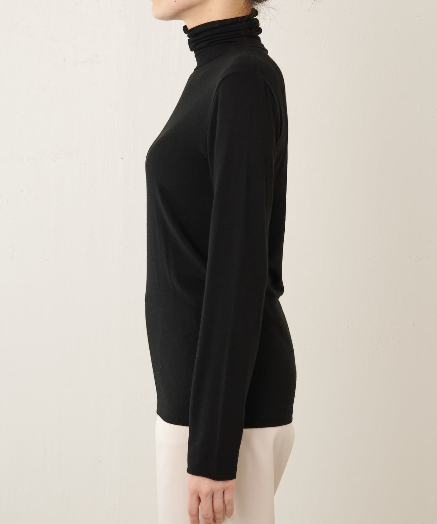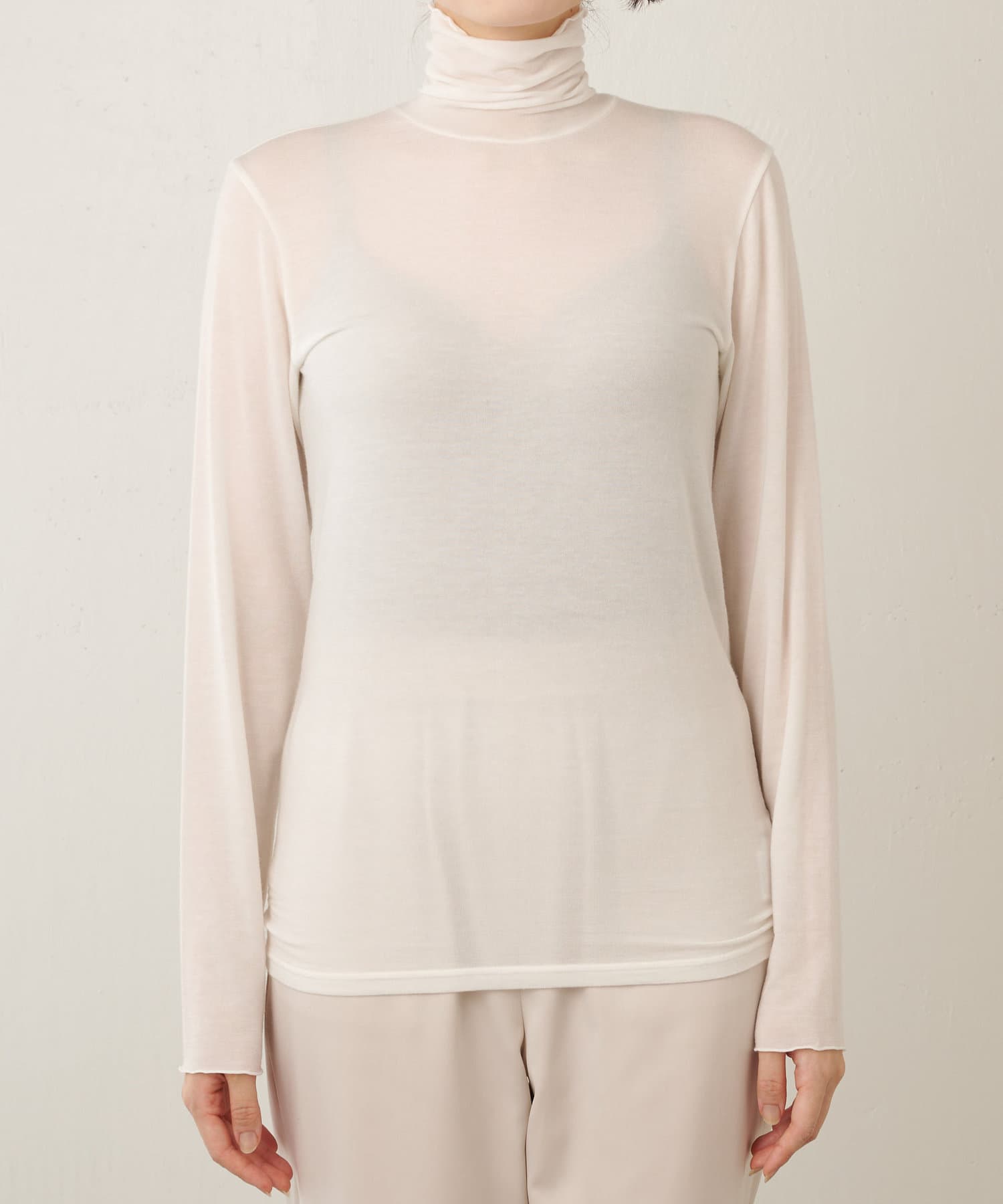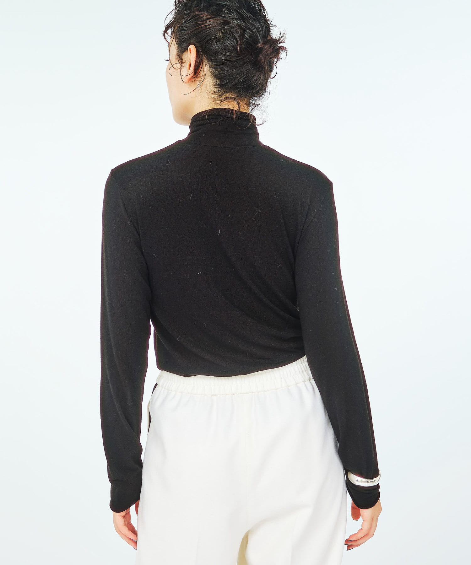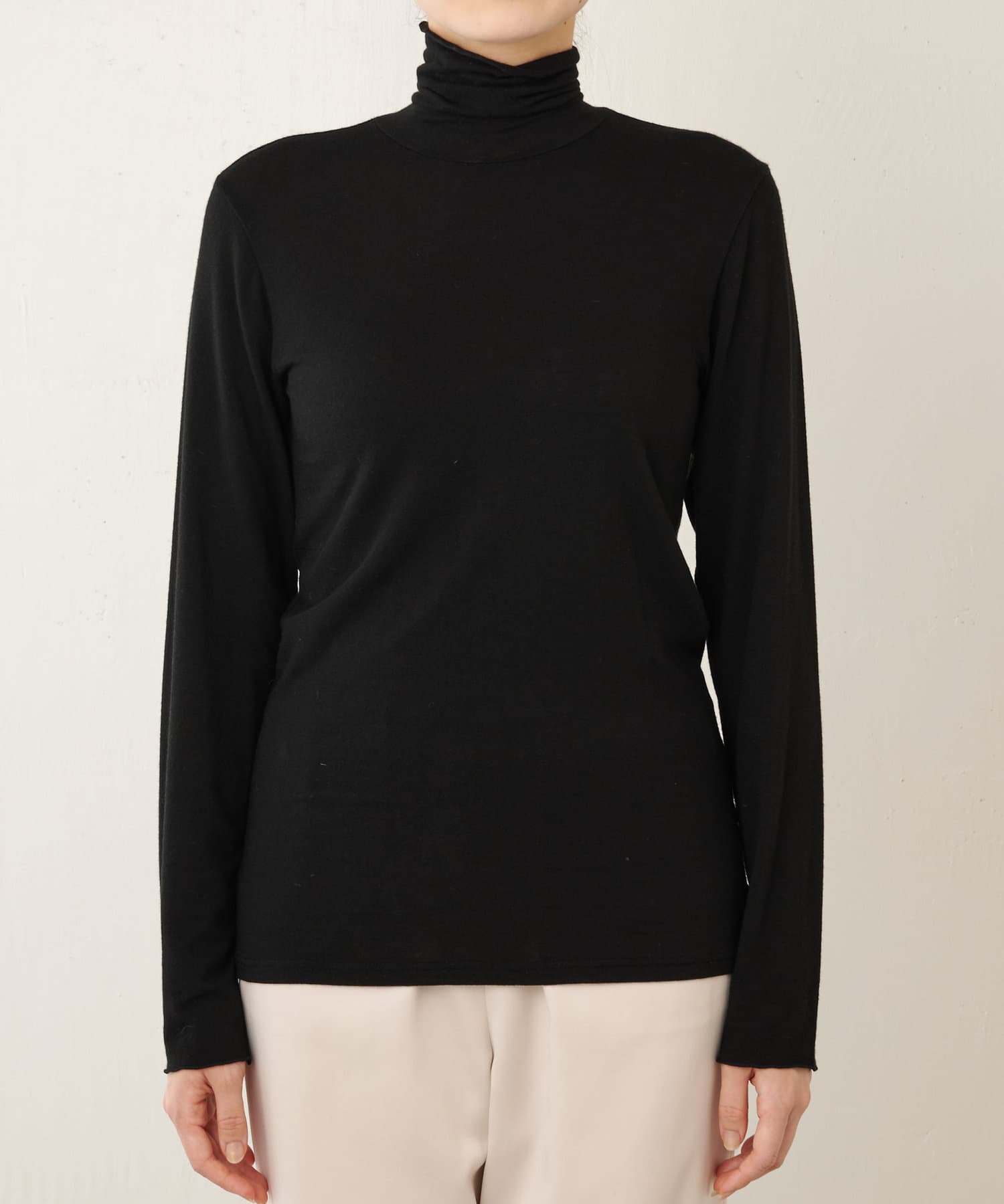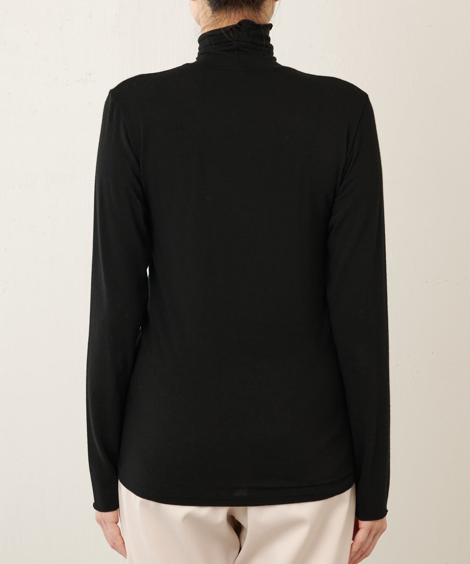 よく伸びて着心地の良いカシミアタッチのタートルカットソー。適度な透け感があり、大人っぽく着こなせるので、インナーでの使用はもちろん、一枚で着ても素敵です。