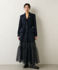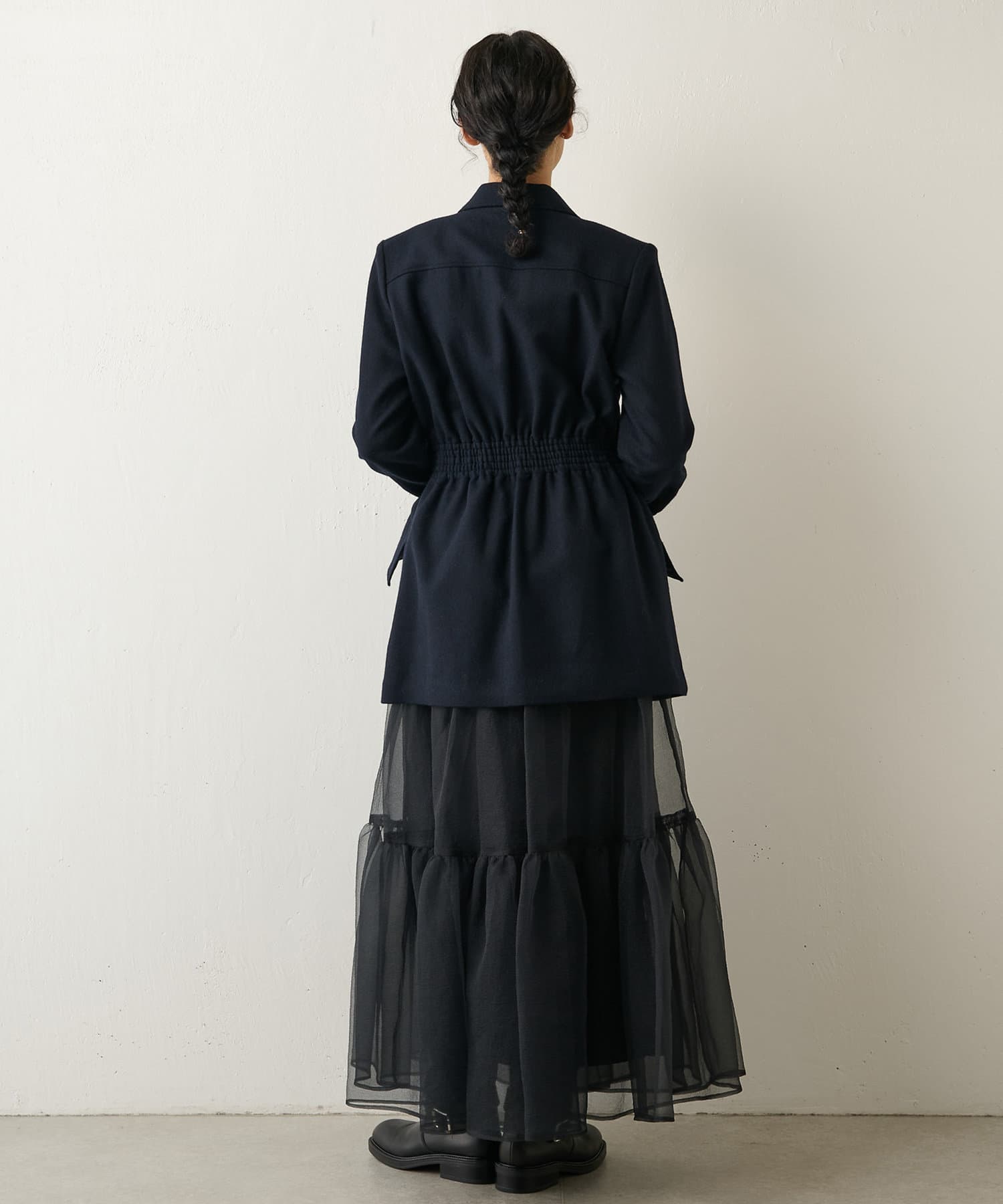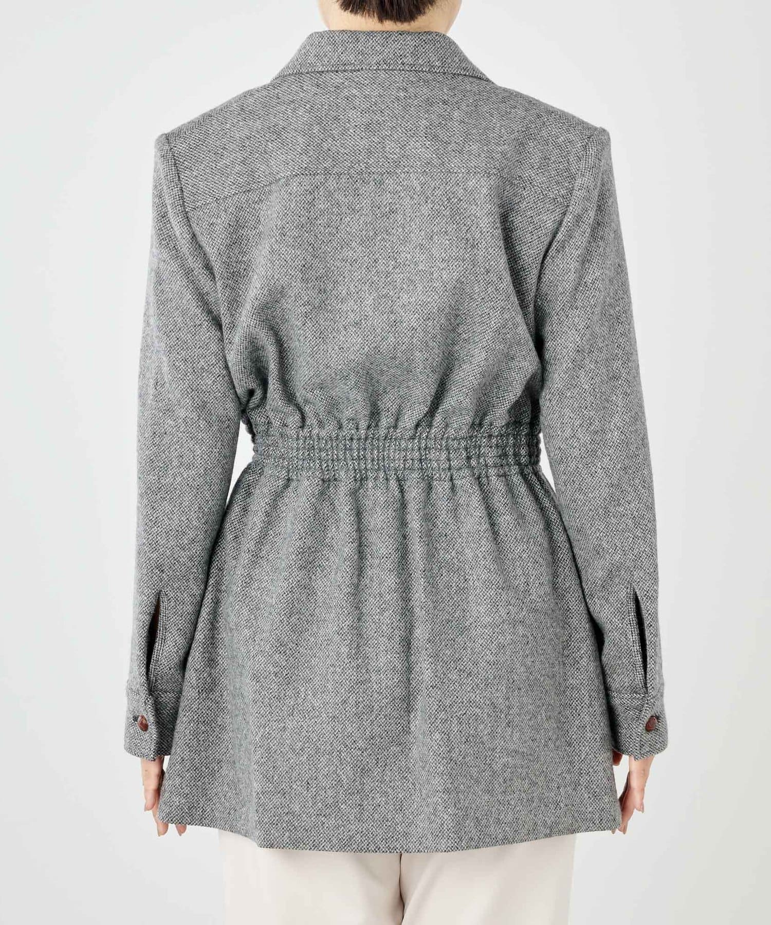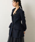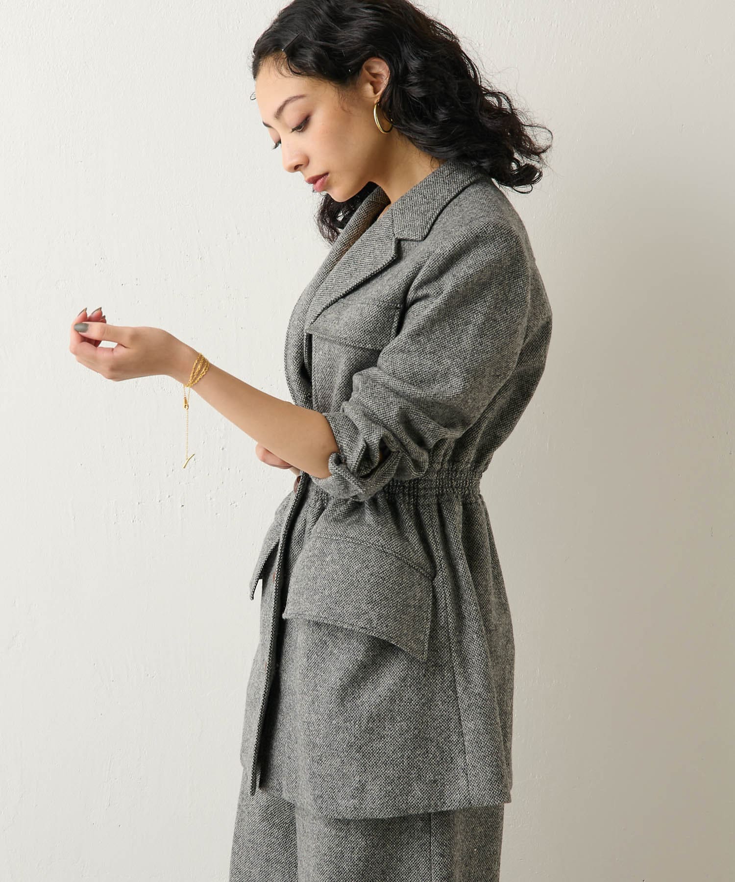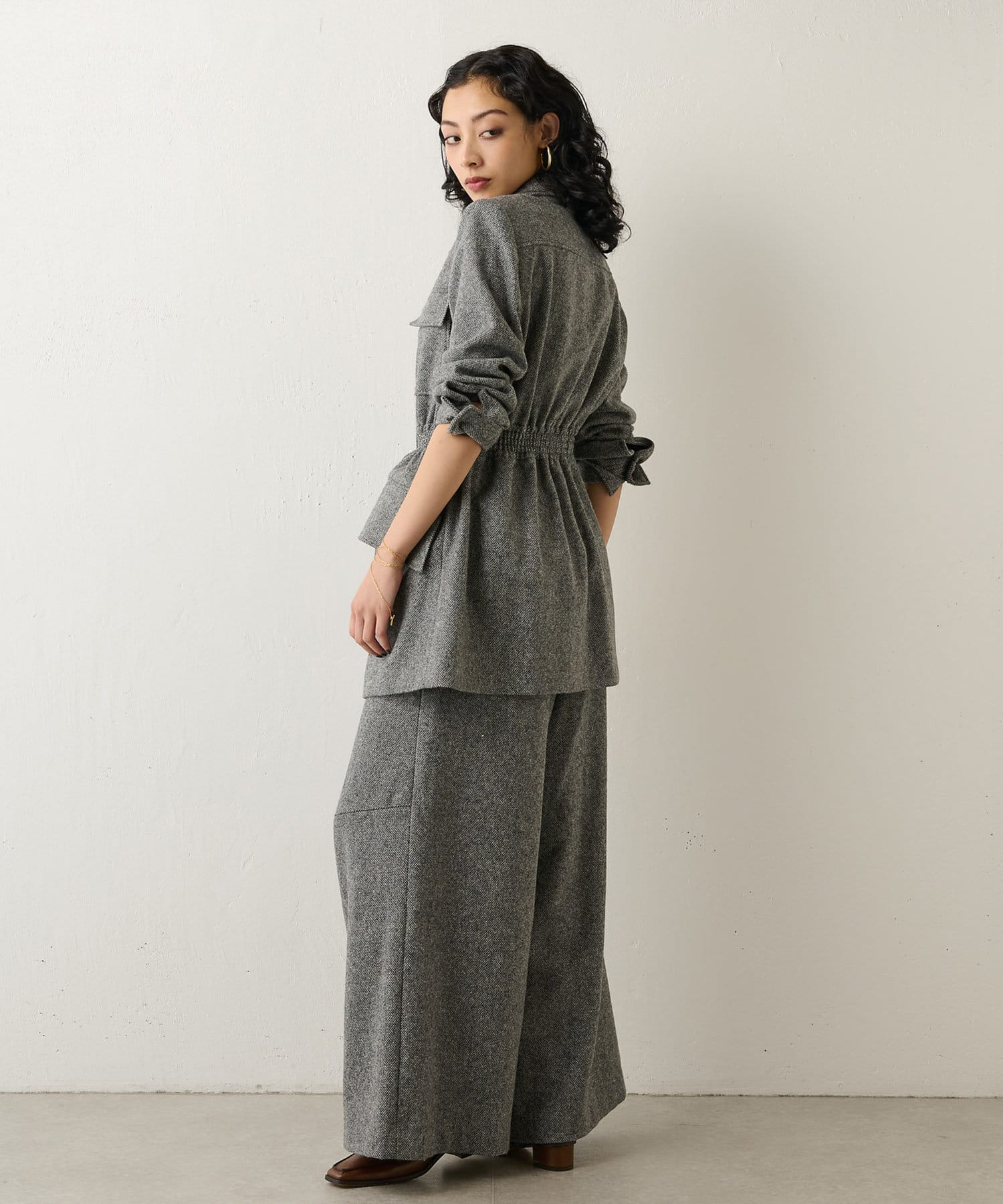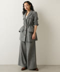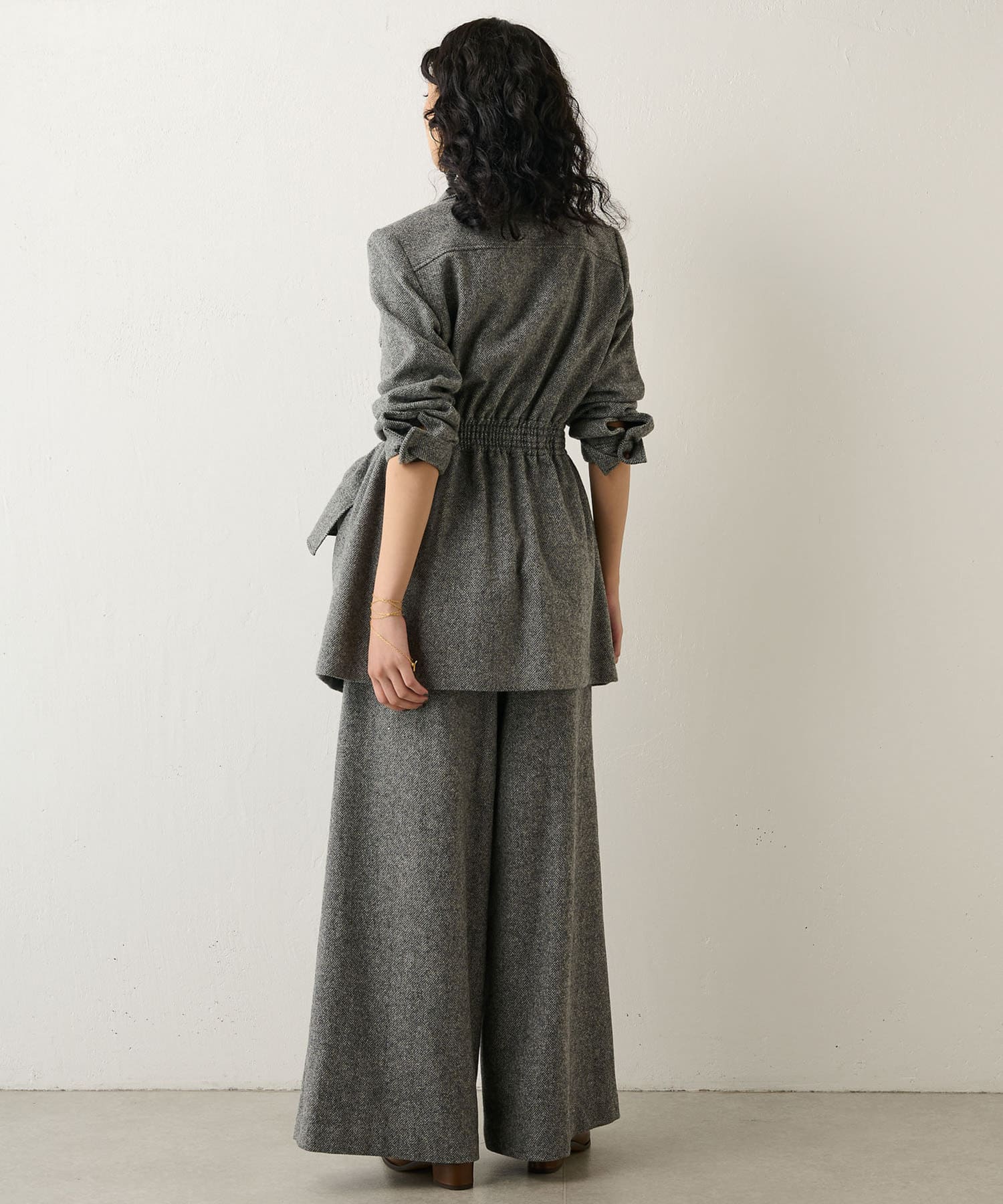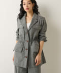 しぼられている部分の窮屈さや違和感はなく、女性らしくすっきり見えるシルエットにしてくれます。同素材のパンツとセットアップもイベントやオフィスシーンにおすすめです。