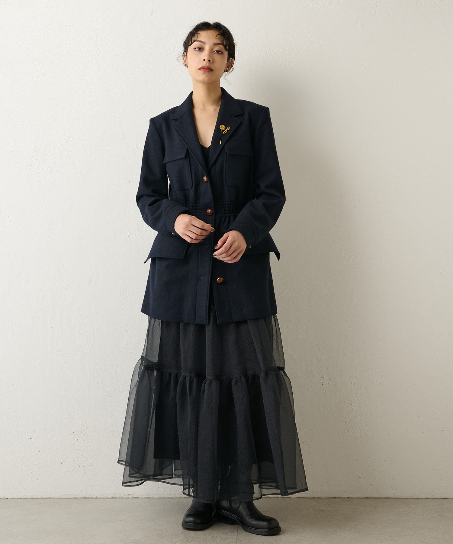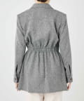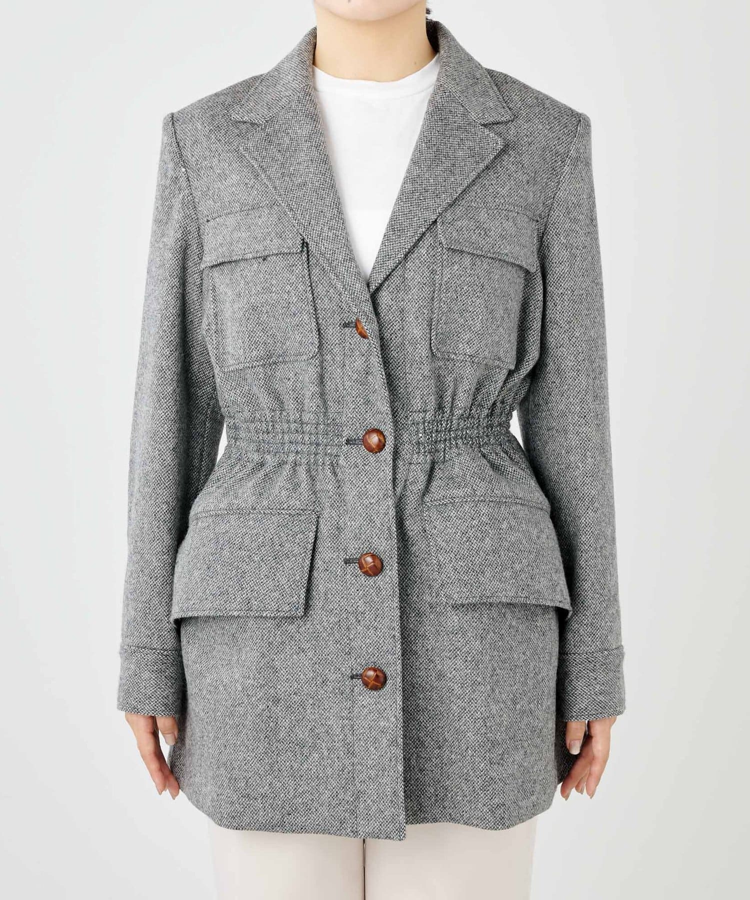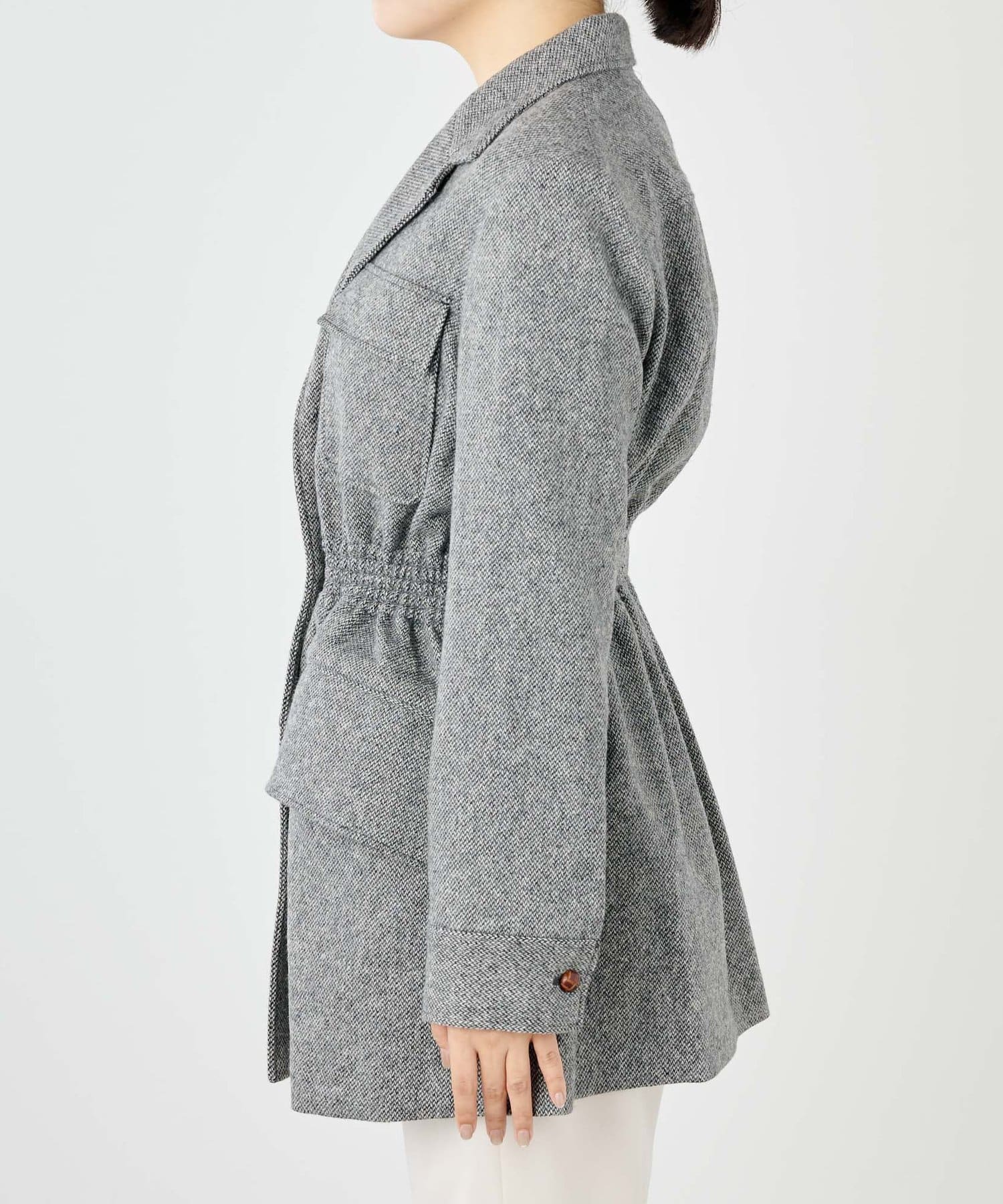 メリハリのあるウールサファリジャケット。ウエストがくびれて見え、スタイルアップ効果も期待できます。しっかりとした上質素材で、品よく大人のこなれ感を楽しめるアイテムです。ボタンやポケットがアクセントになります。