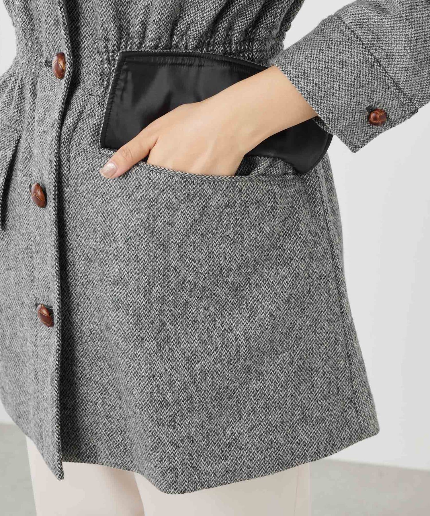 ■配色のレザーボタンがアクセントになったウールジャケット。