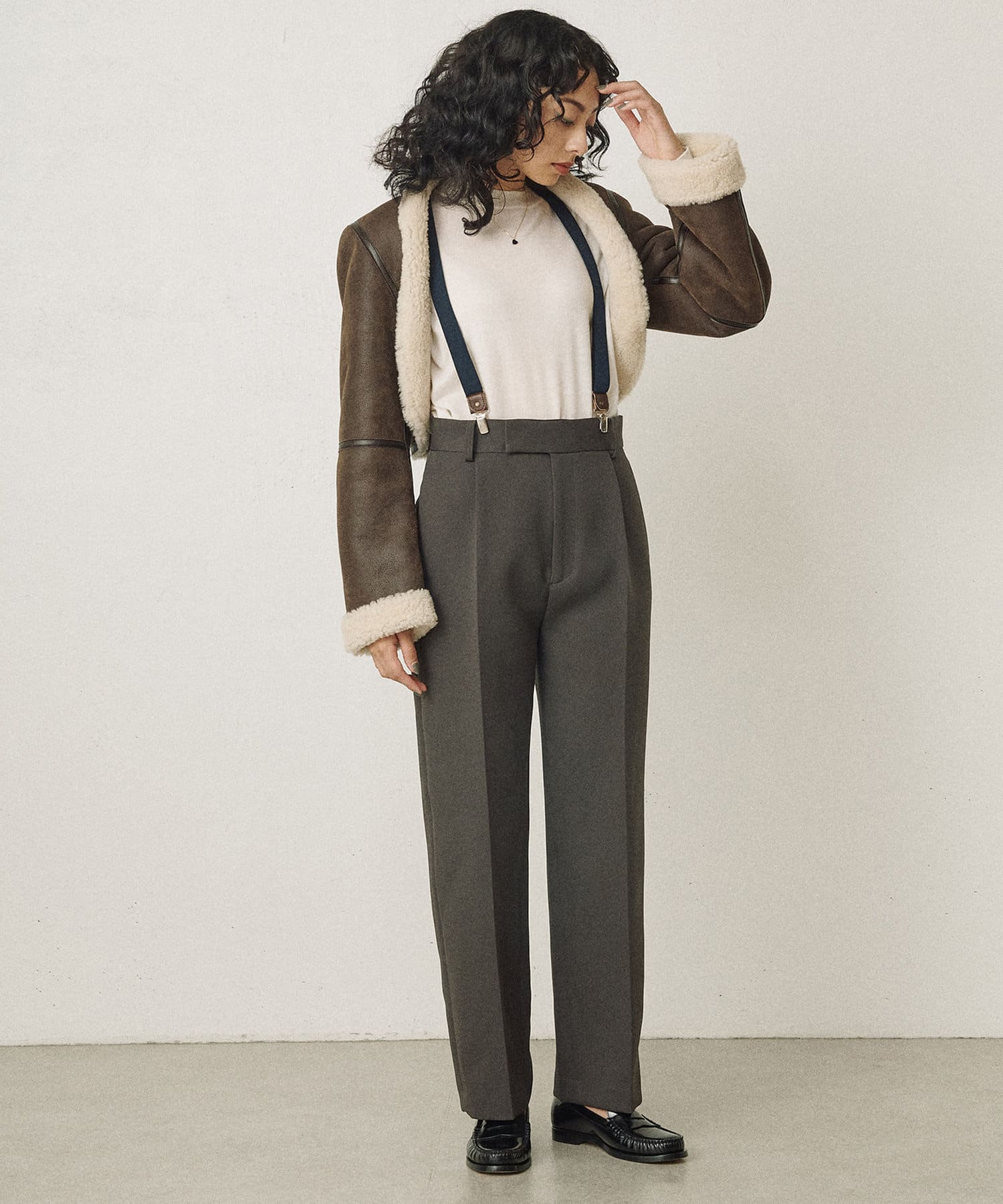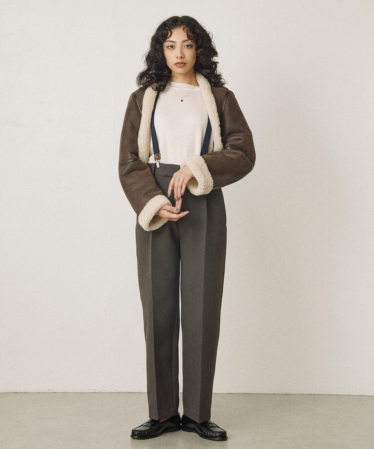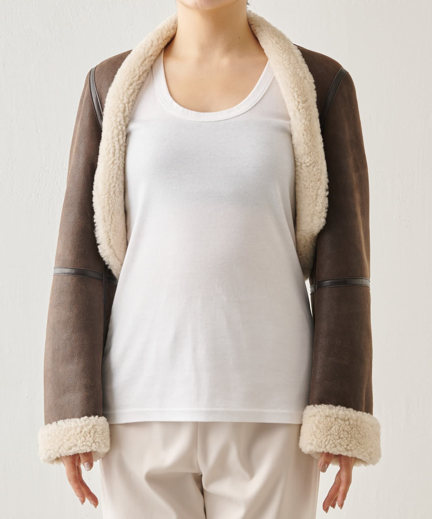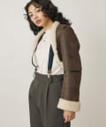 毎シーズン人気のブランド、アンスクリアのムートンジャケットです。ボレロのようなシルエットが新鮮で周りと差のつく一着です。ムートンのボリューム感がありつつ、ショート丈でバランス良く見えます。