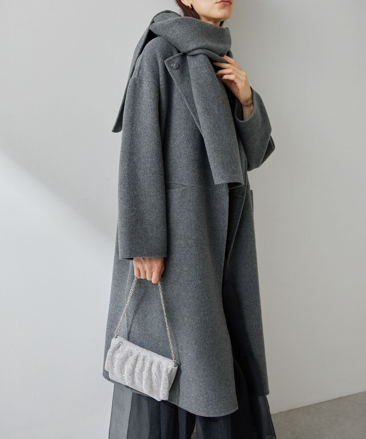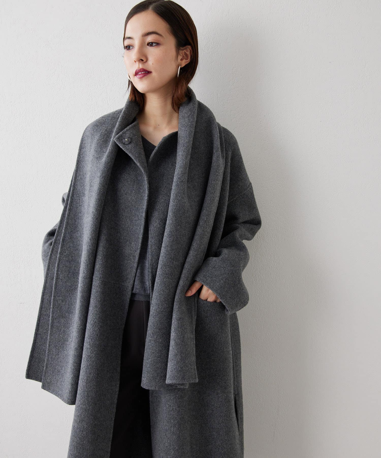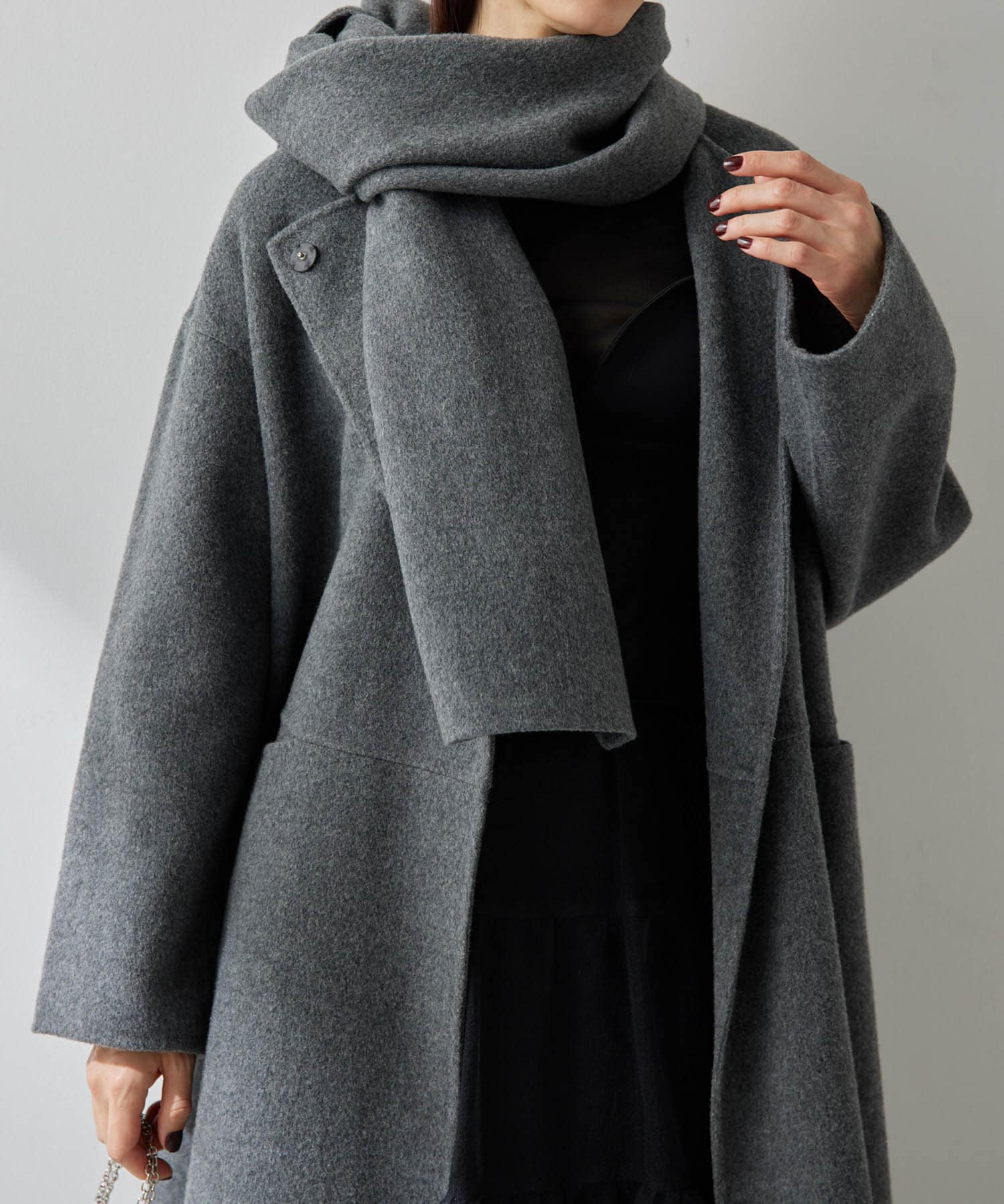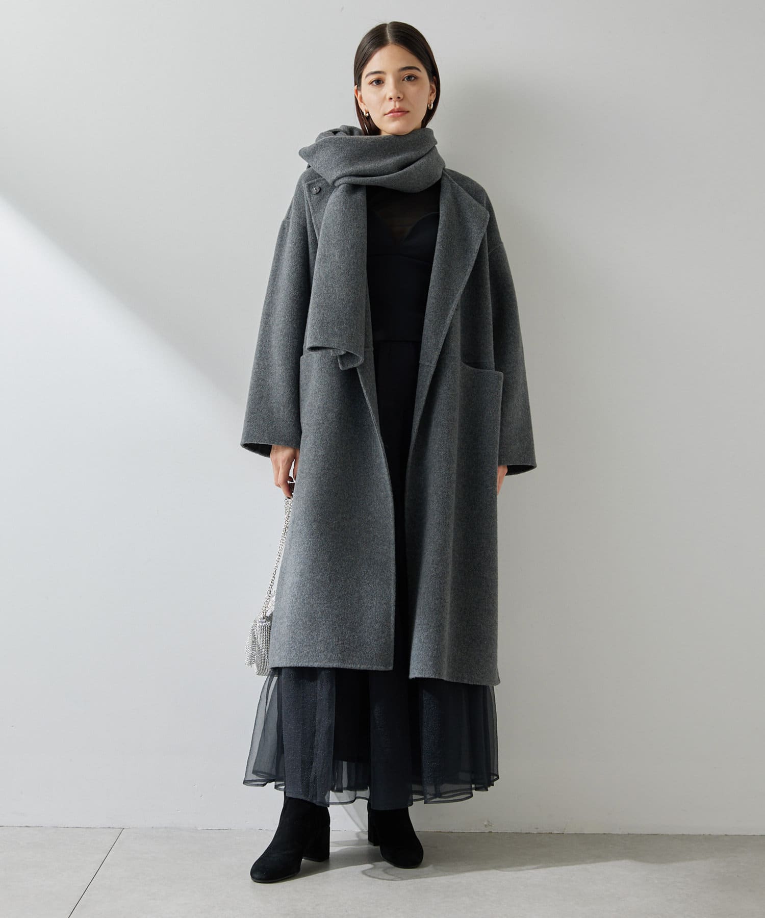 ■コートと同素材のストールがセットになったリバーコート。