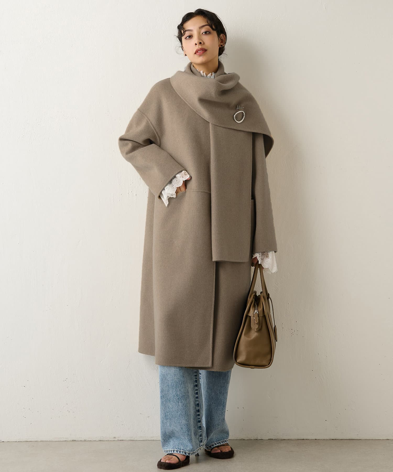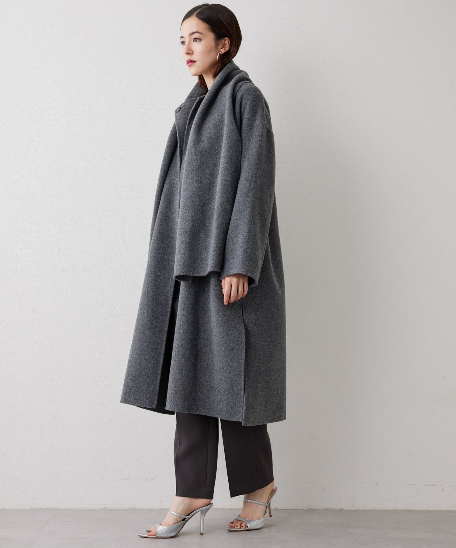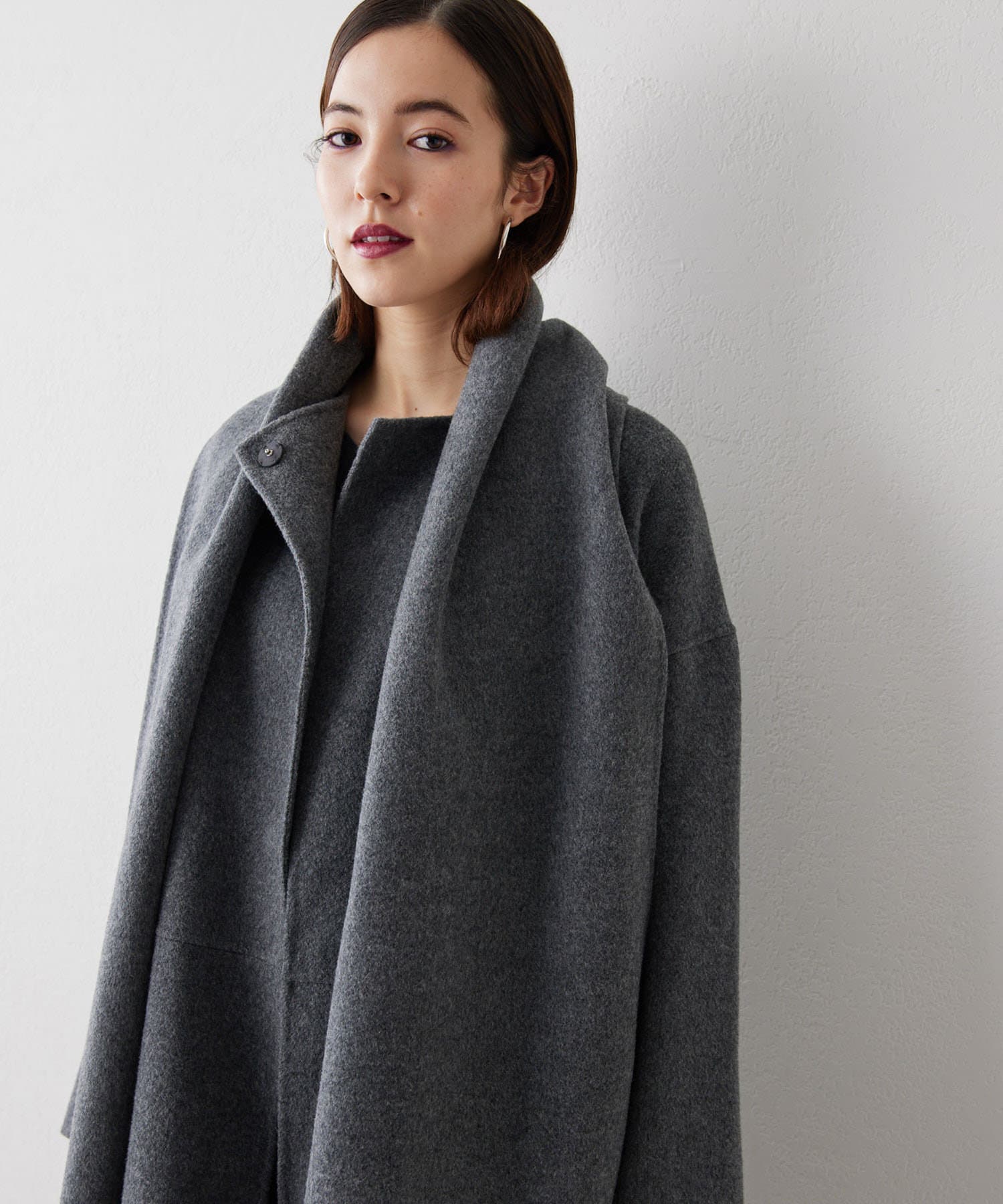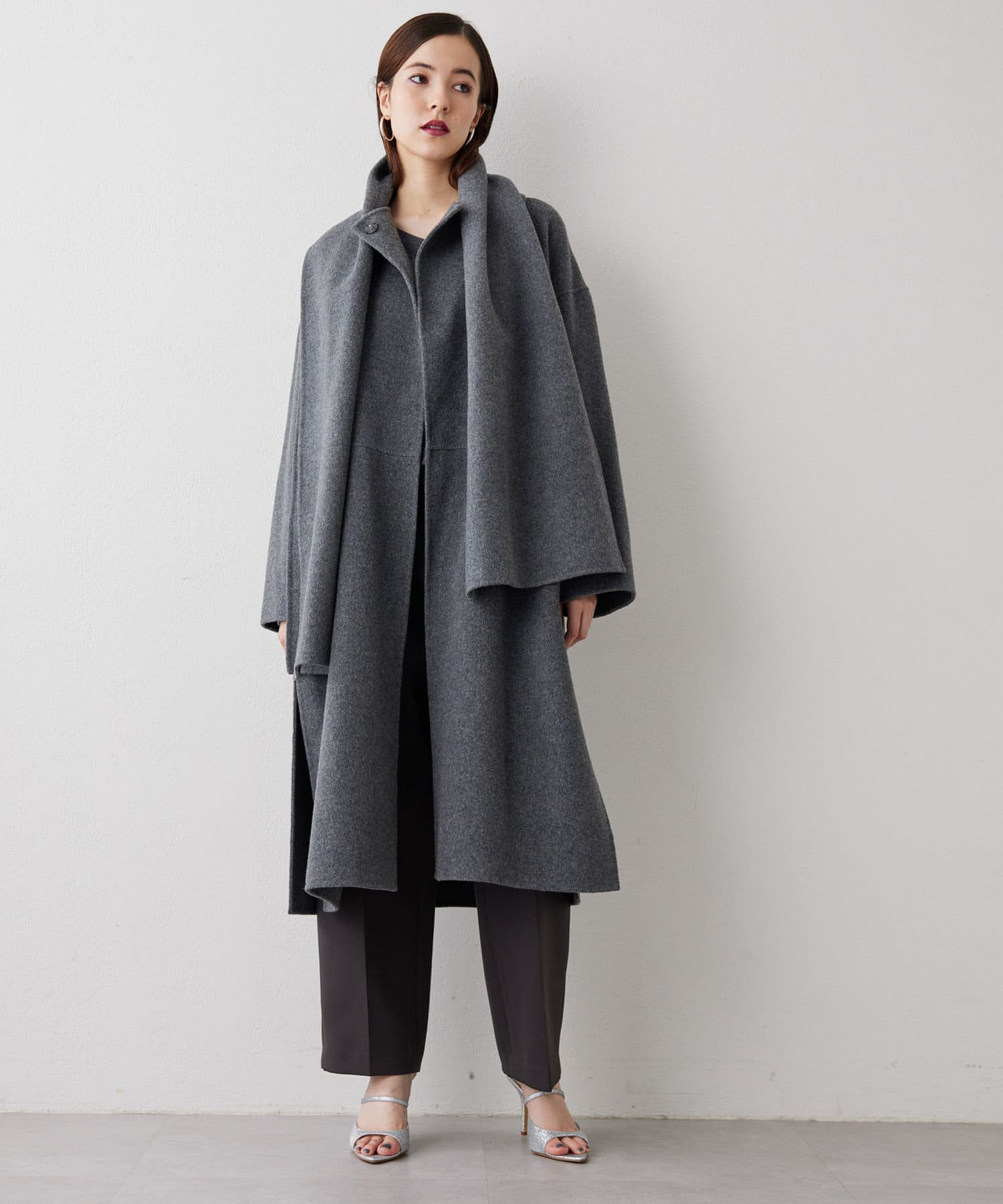 ■コートと同素材のストールがセットになったリバーコート。
