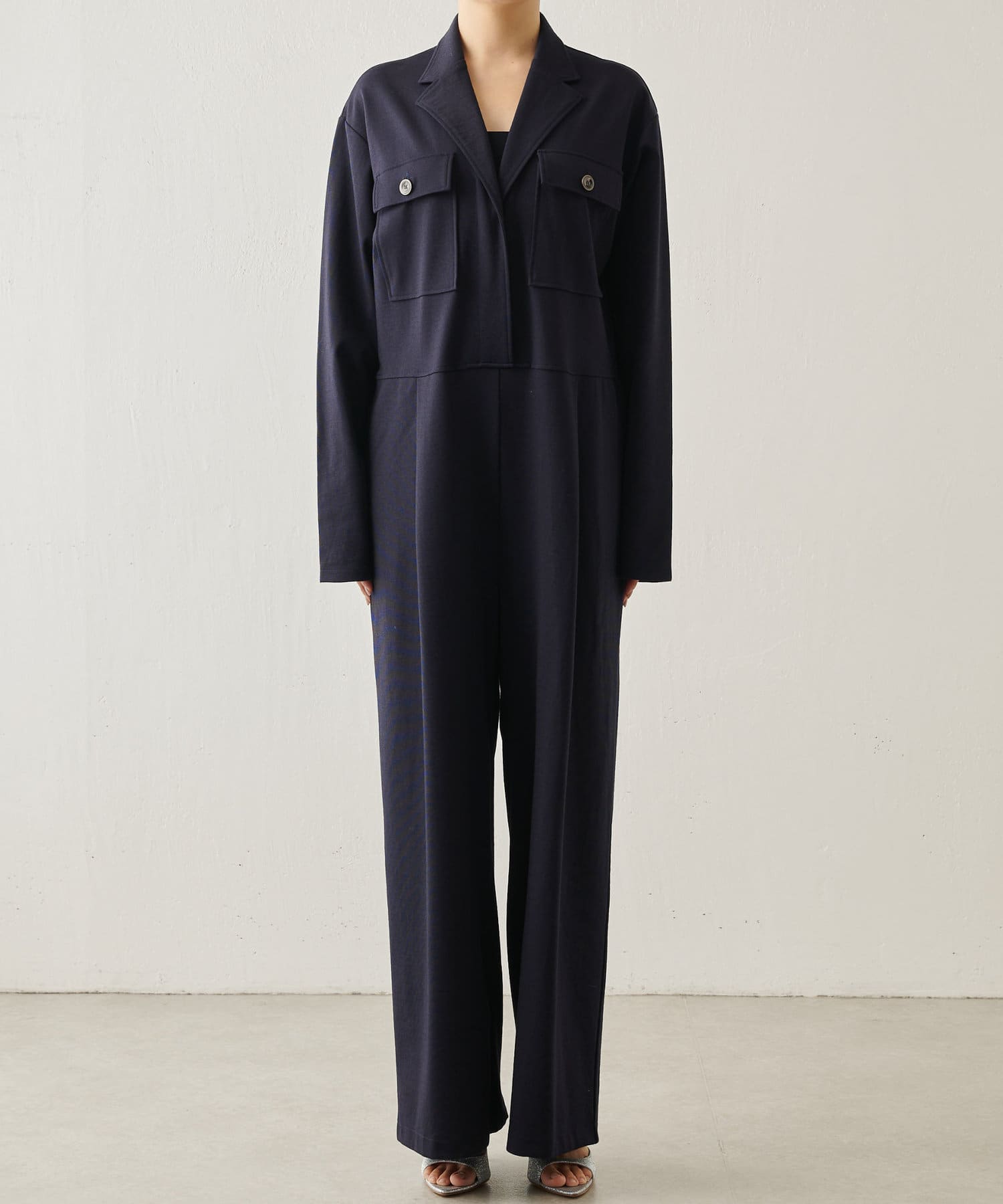 ジャージーのような伸縮性高いオールインワン。162cmの身長で丈はそのまま履けます。前の開きは大きいので薄型体型の方はインナーを入れると安心です。