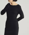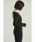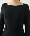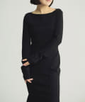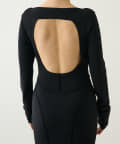 ■首元は鎖骨に沿うモードなボートネックに対して、背中の丸く開いたセンシュアルなデザインもポイント。