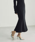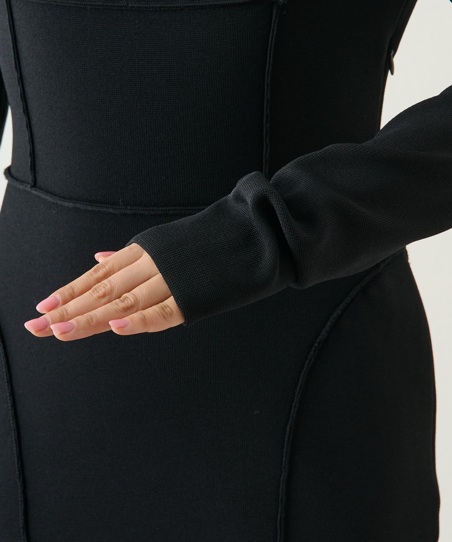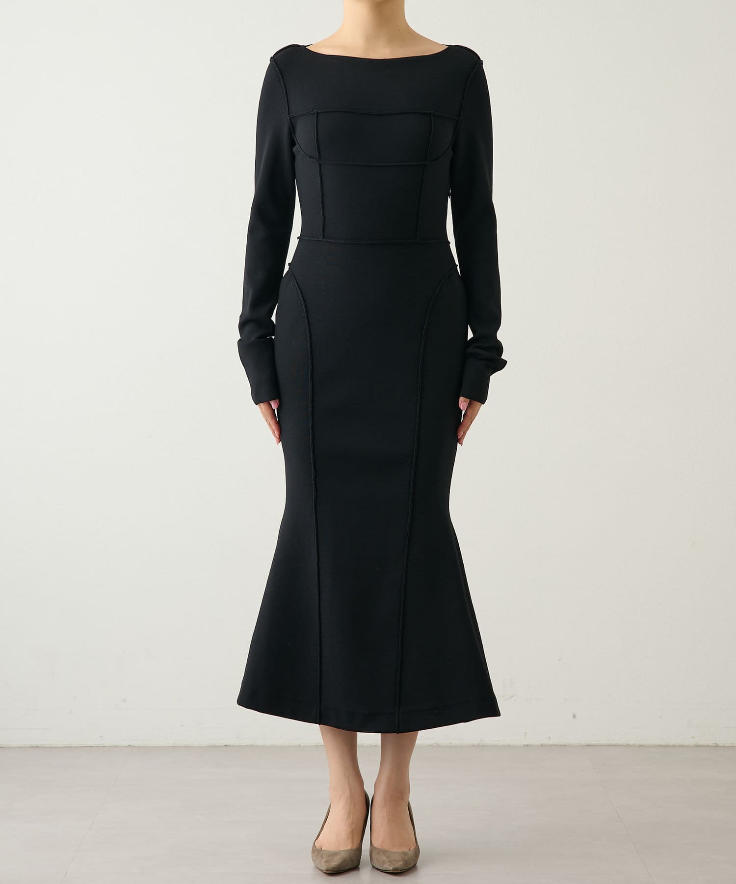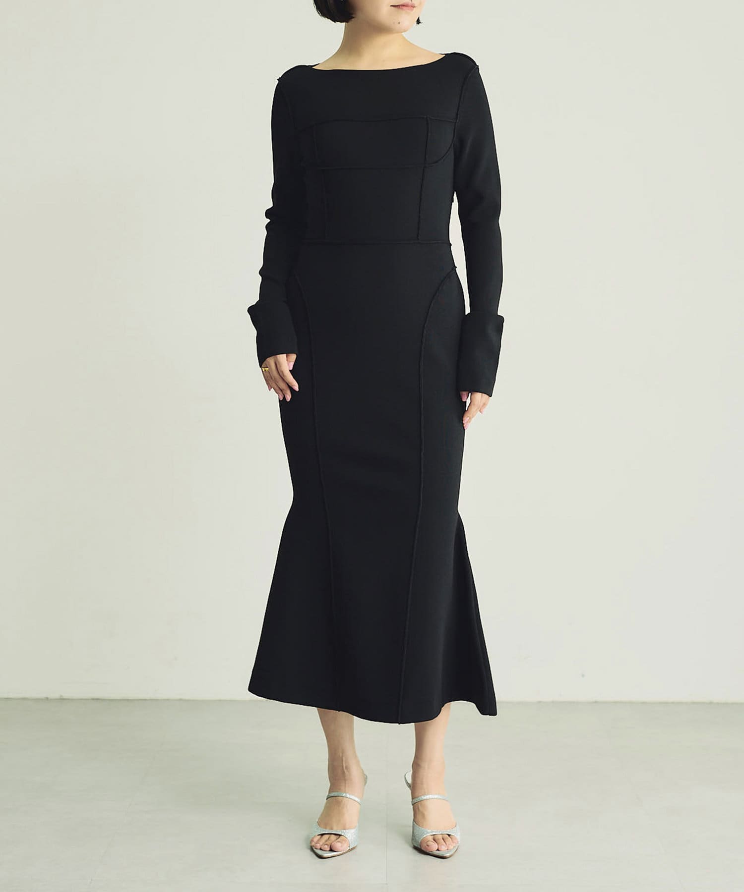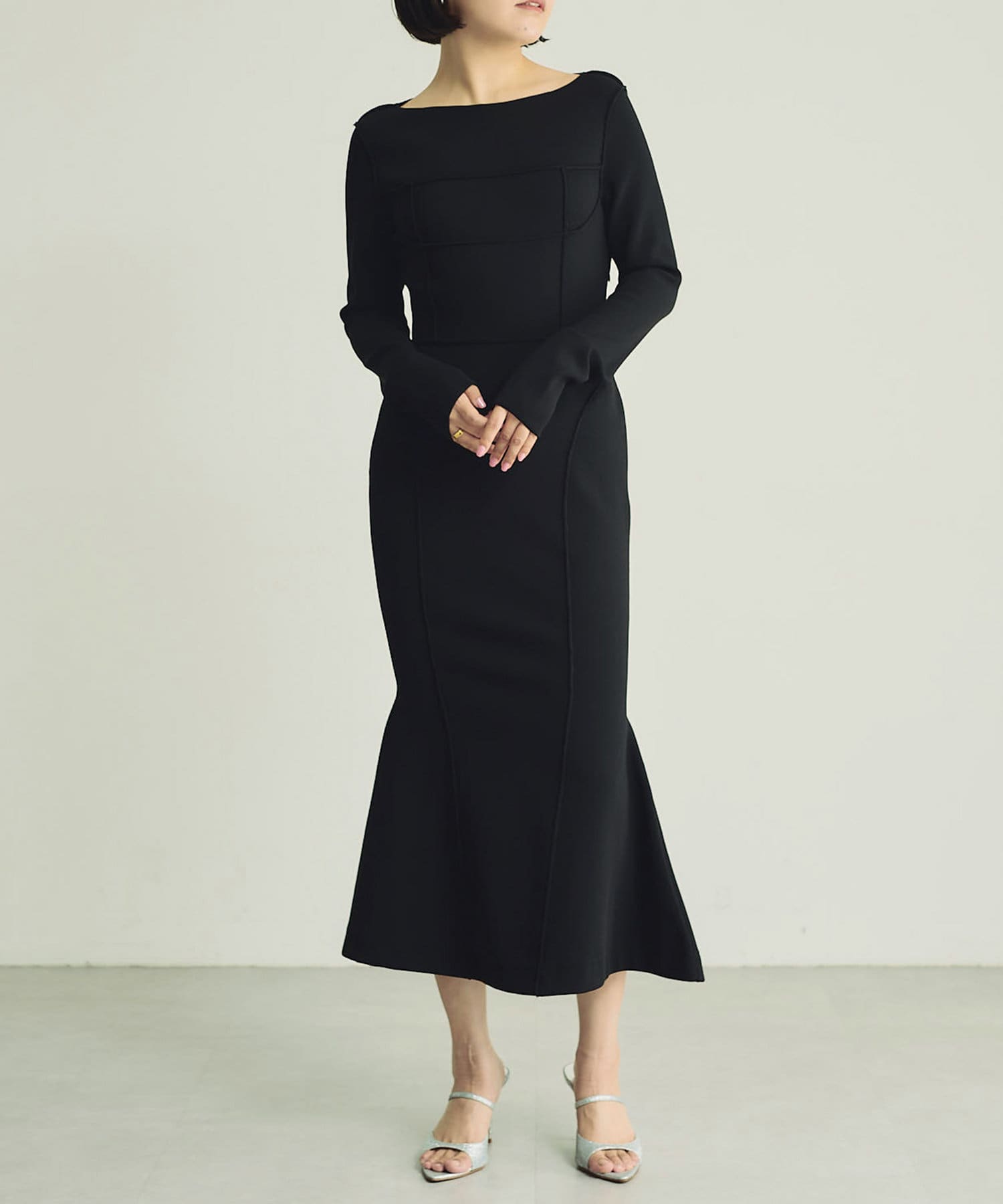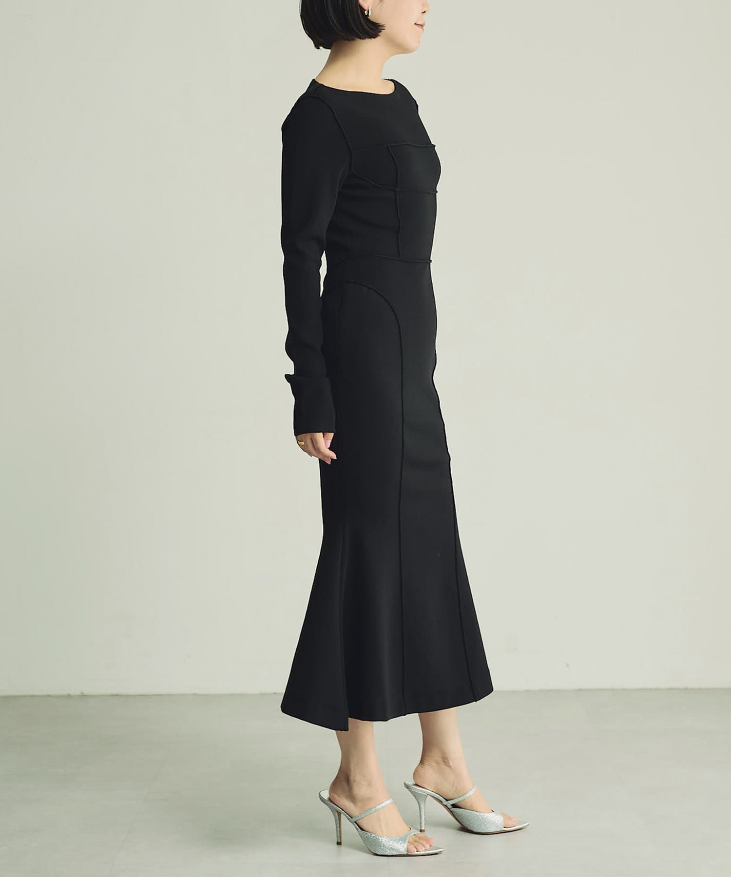 計算された切り替えと張りのあるミラノリブの素材で補正効果のように美しく見せてくれます。スカートはマーメイドですが、歩きやすく、サイドにファスナーがあるので無理なく着脱できます。着るだけで高揚感のあるワンピースです。