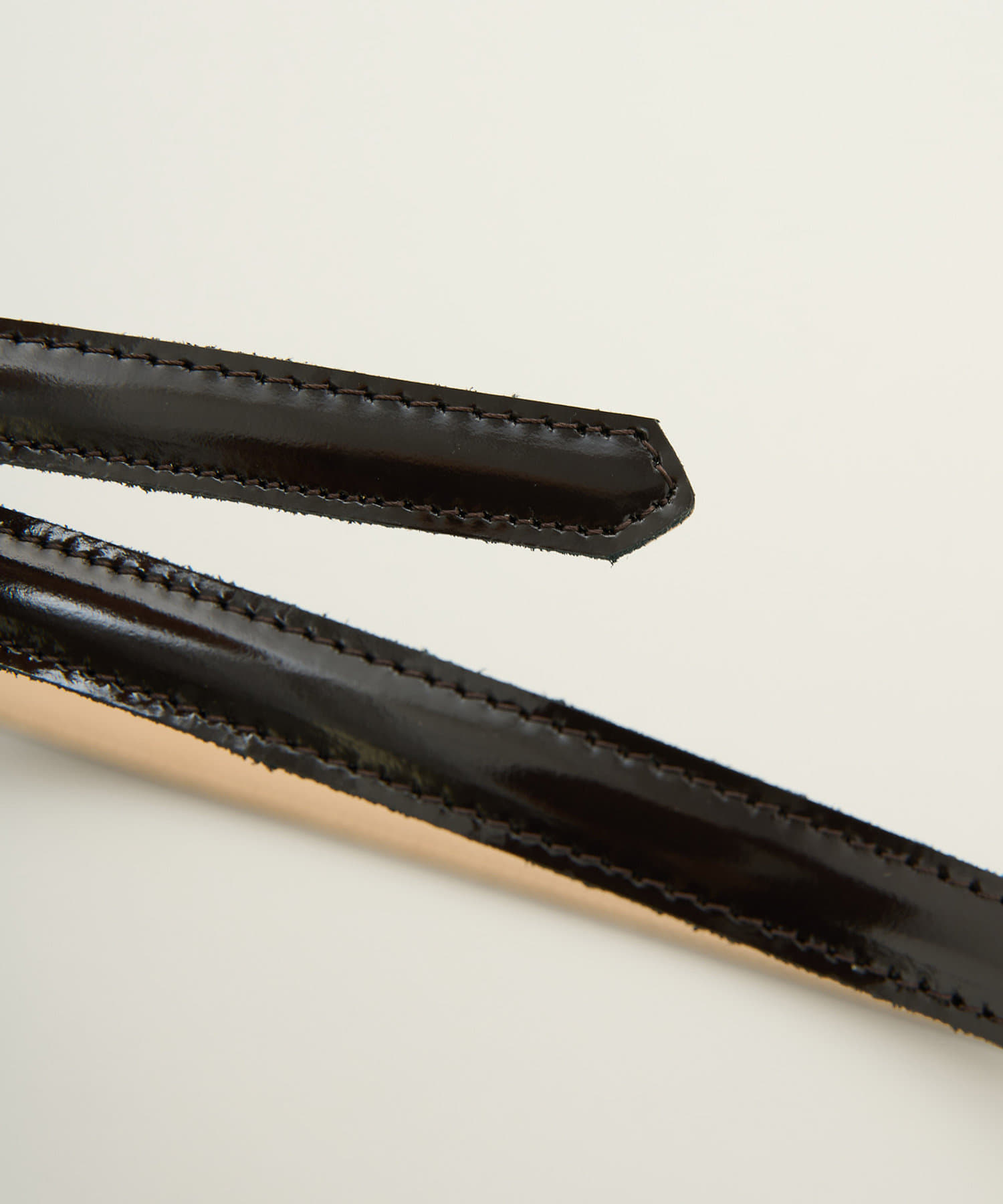 細レザーベルト。ゴールドパーツとエナメルのさり気ない光沢が、コーデで上品なスタイルに格上げしてくれます。長さも長過ぎず、すっきりと纏まります。