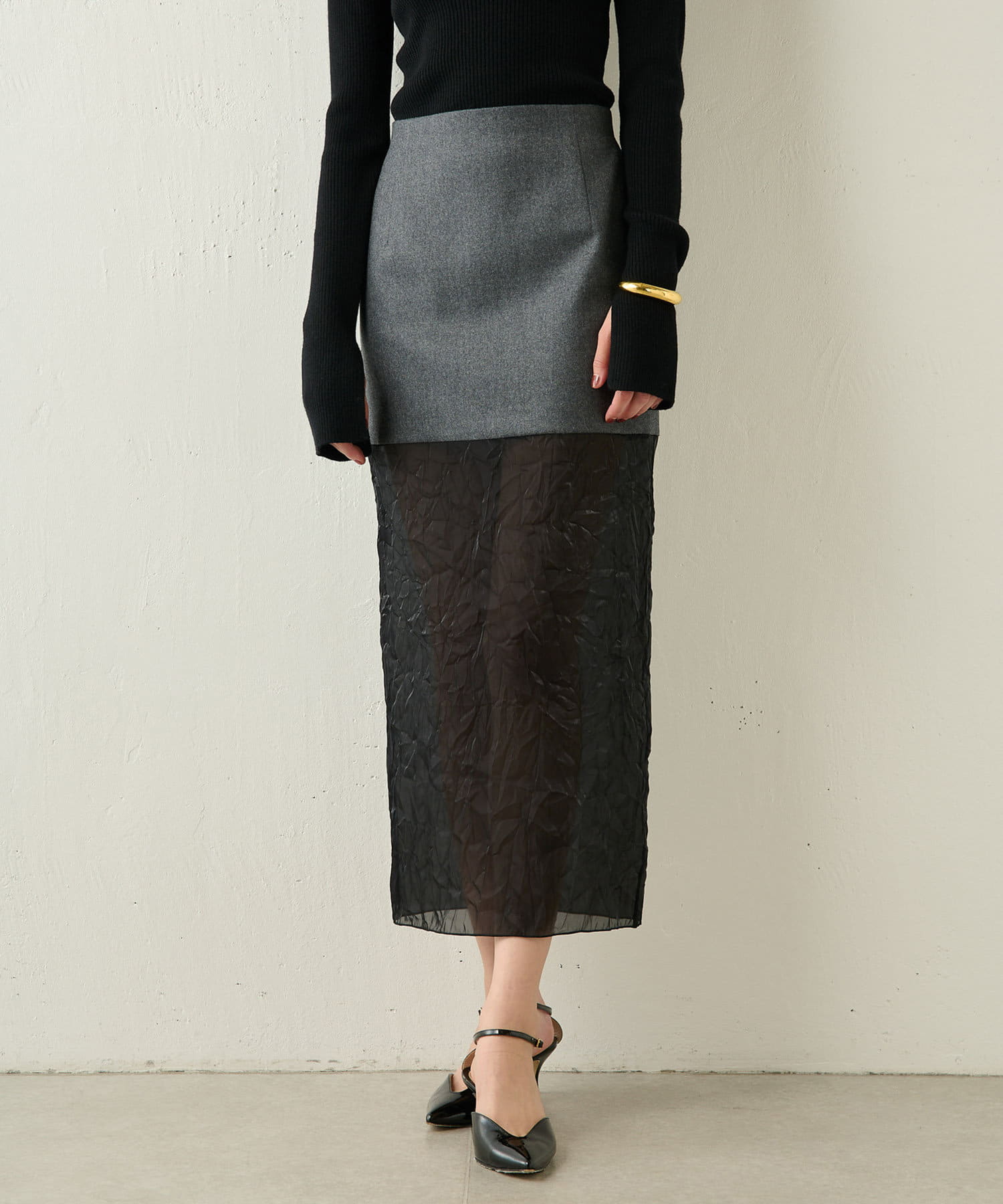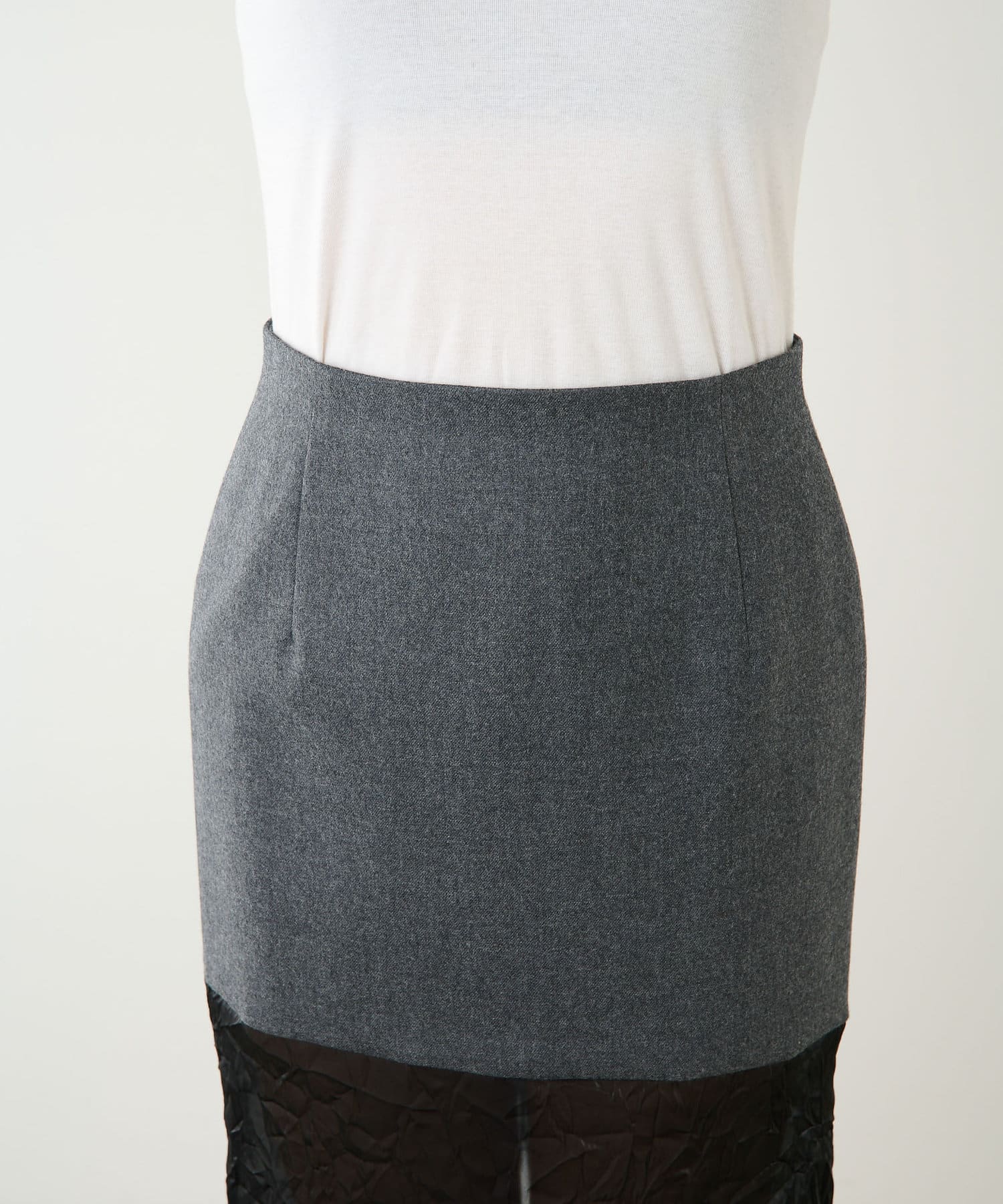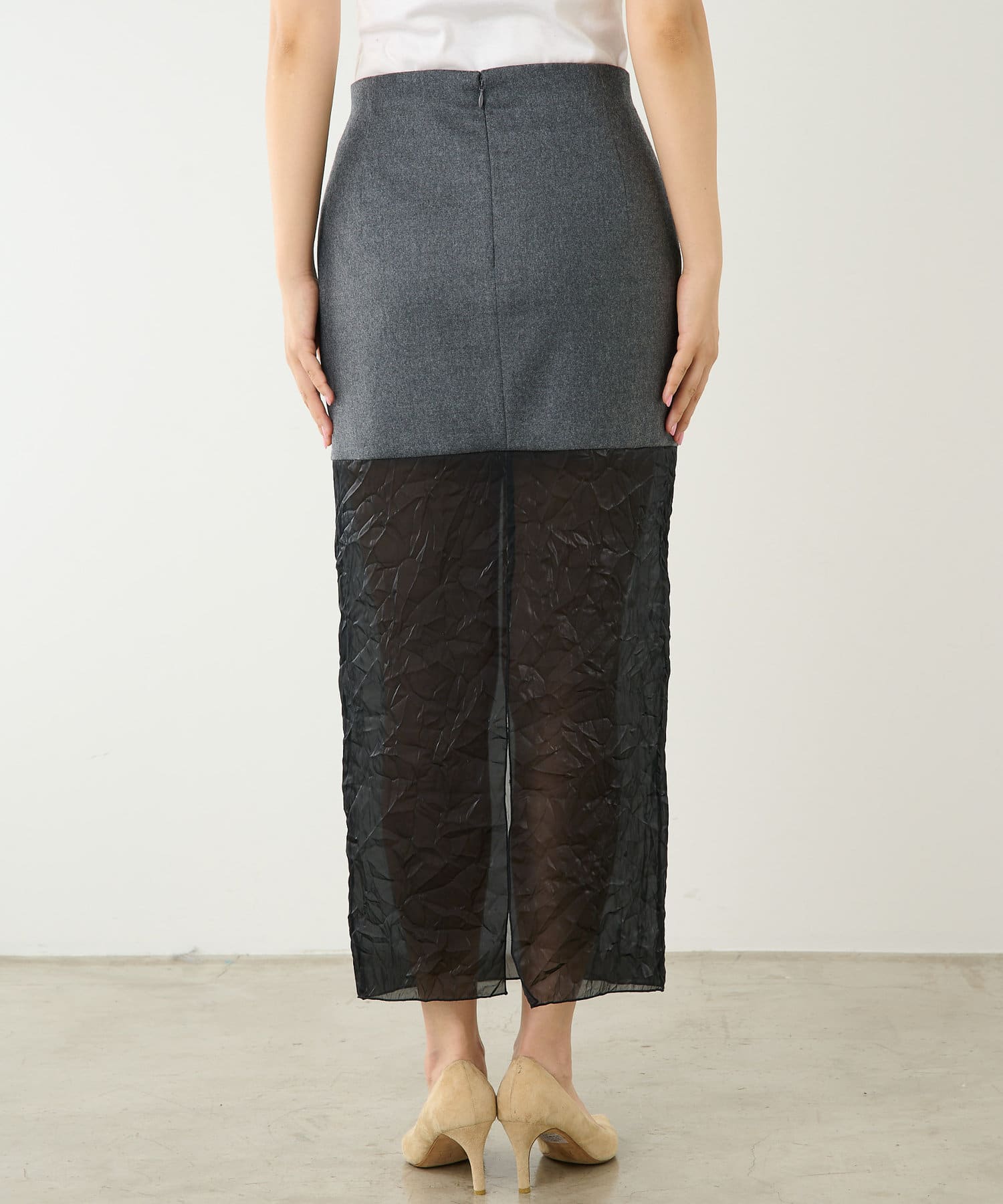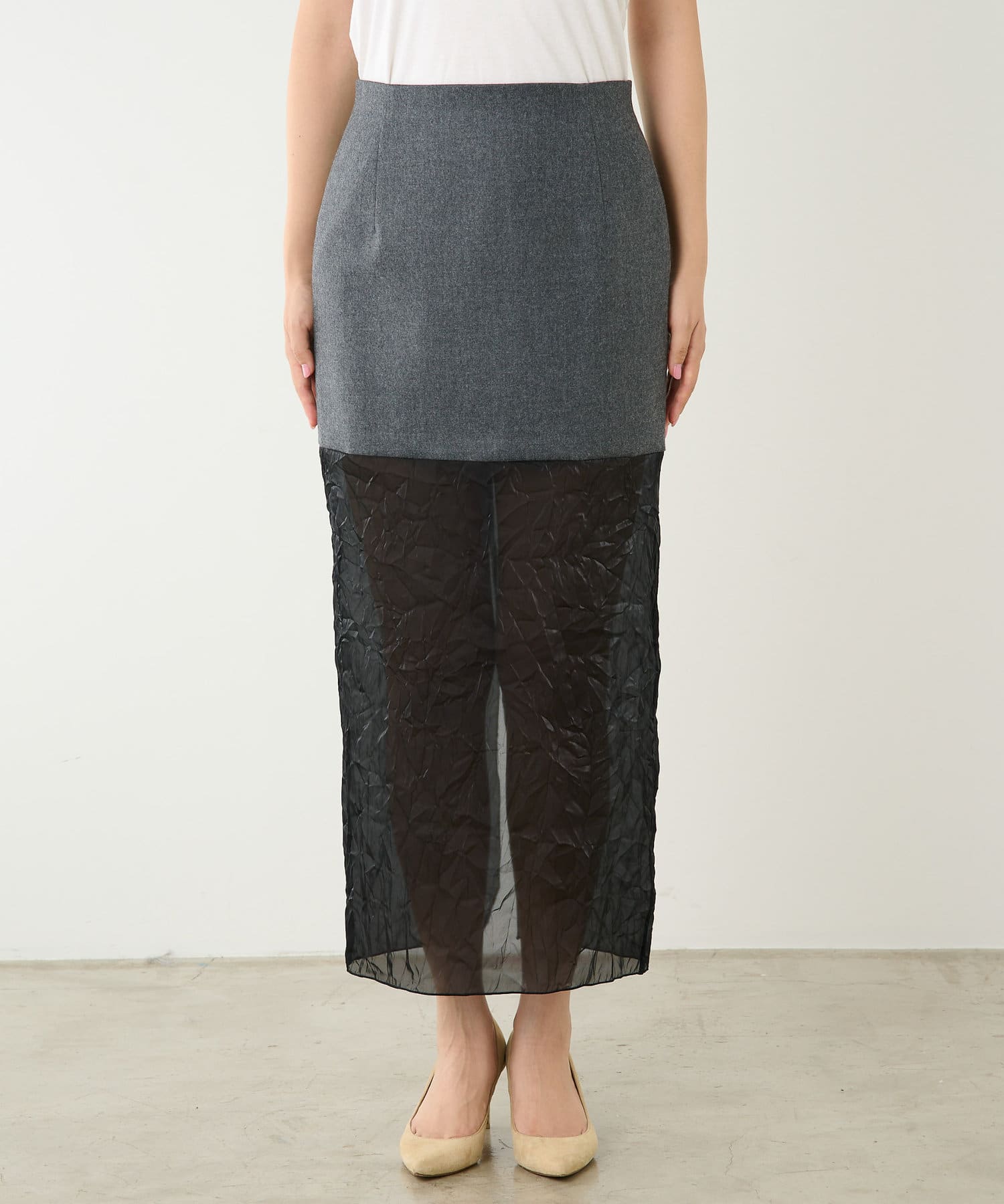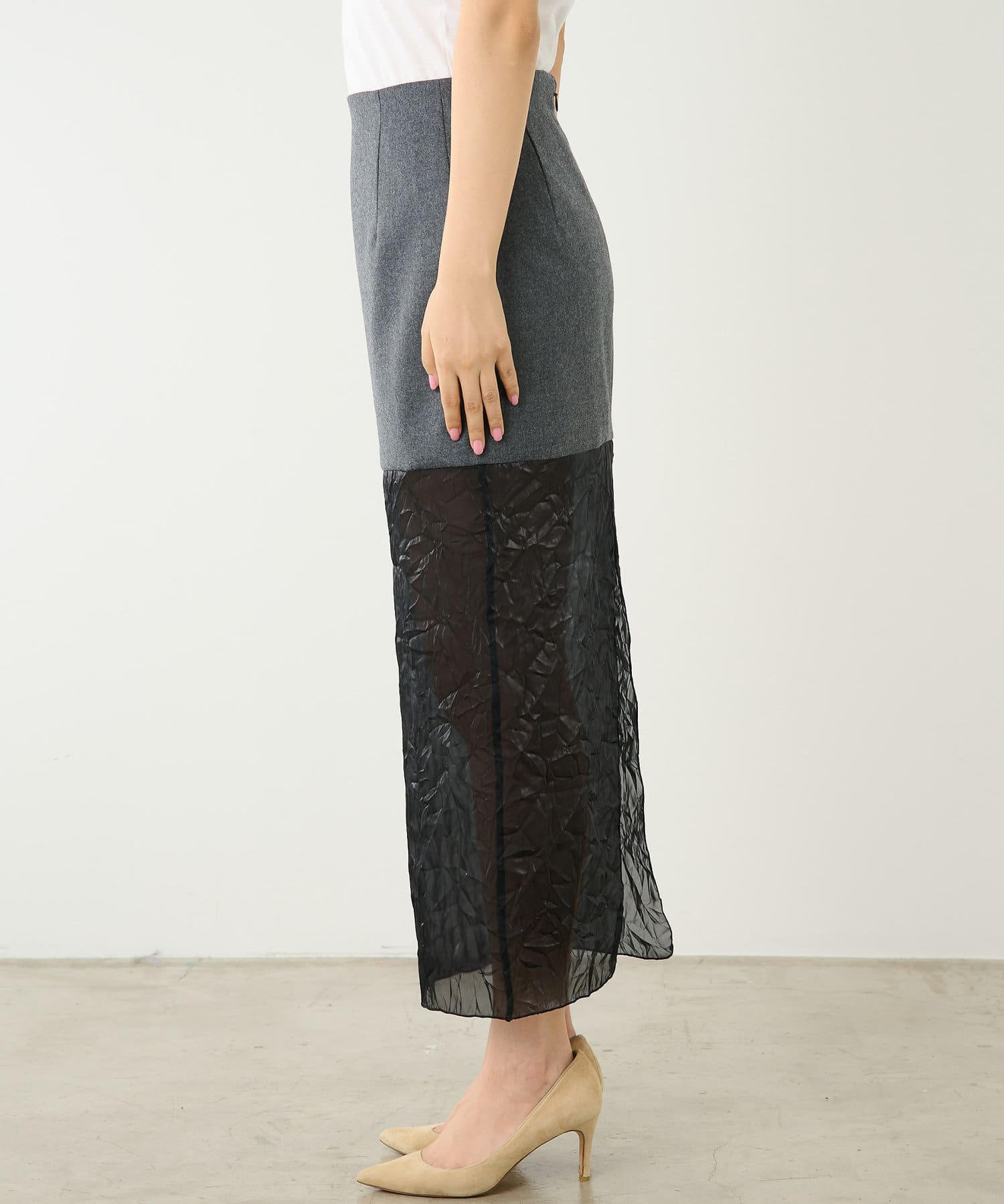 ■シアー素材で切り替えたドッキングデザインが印象的なタイトスカート。