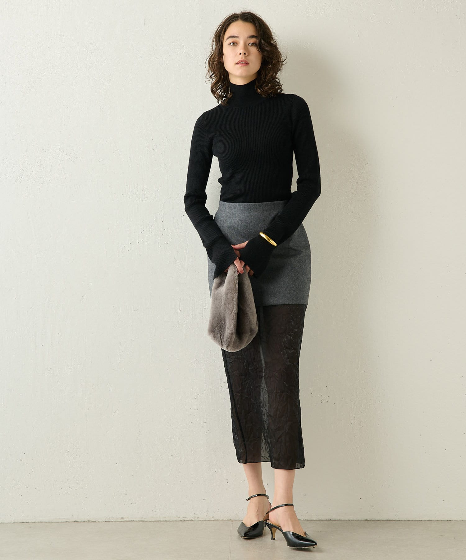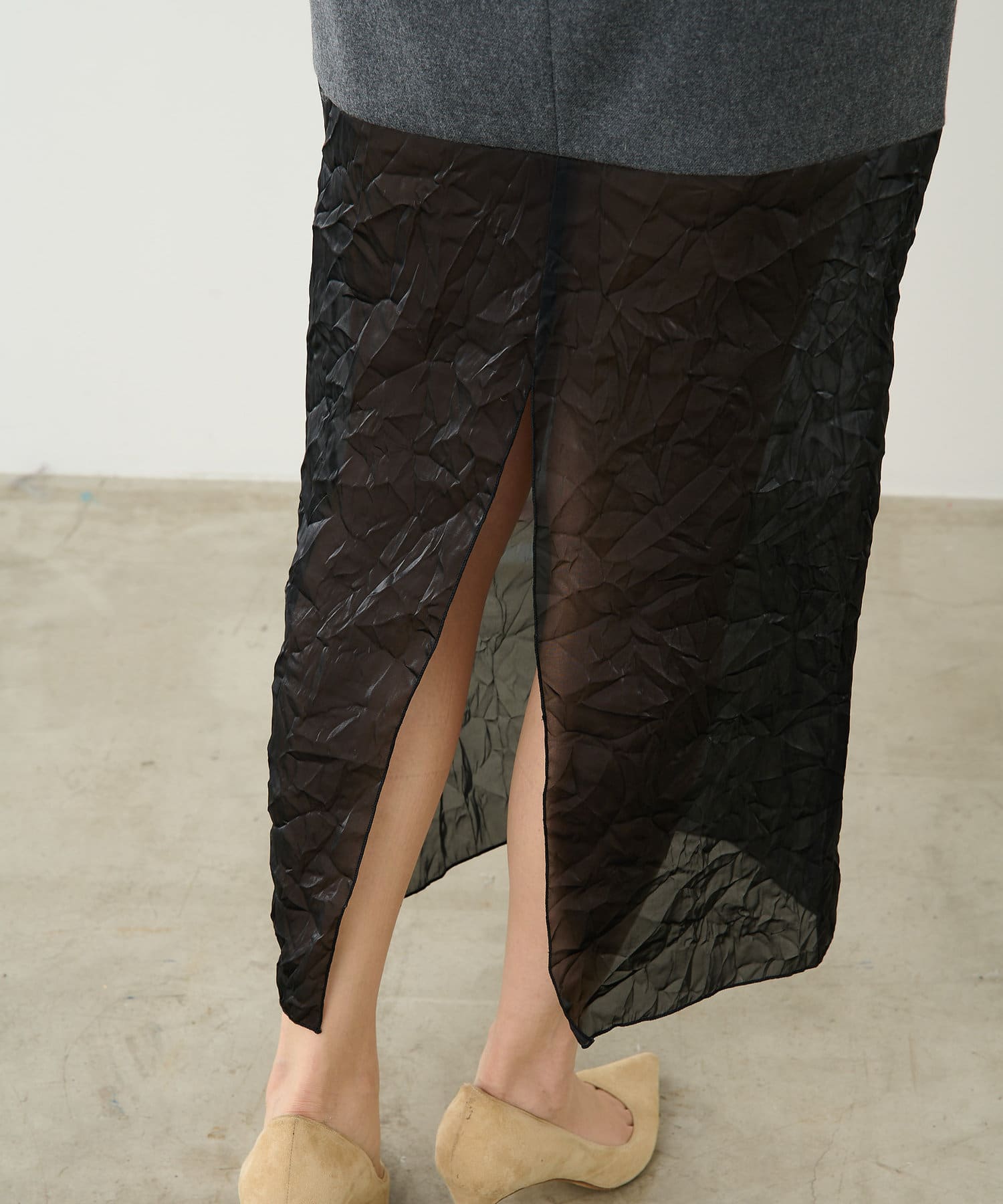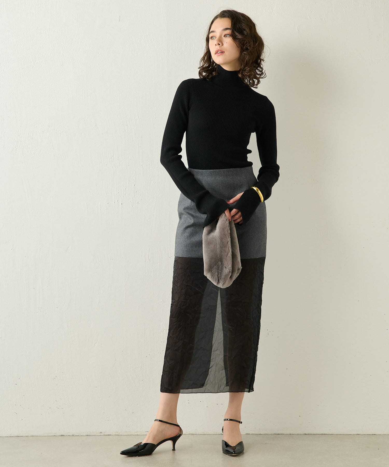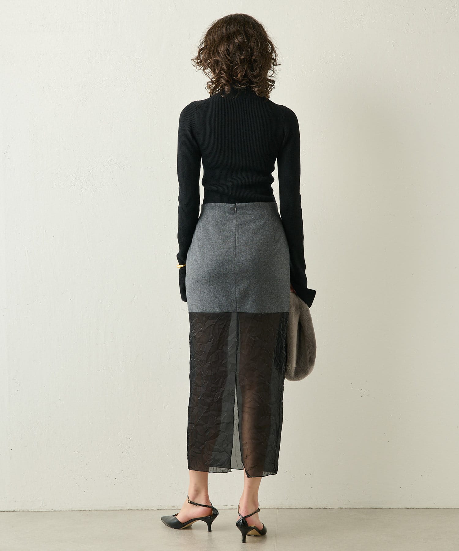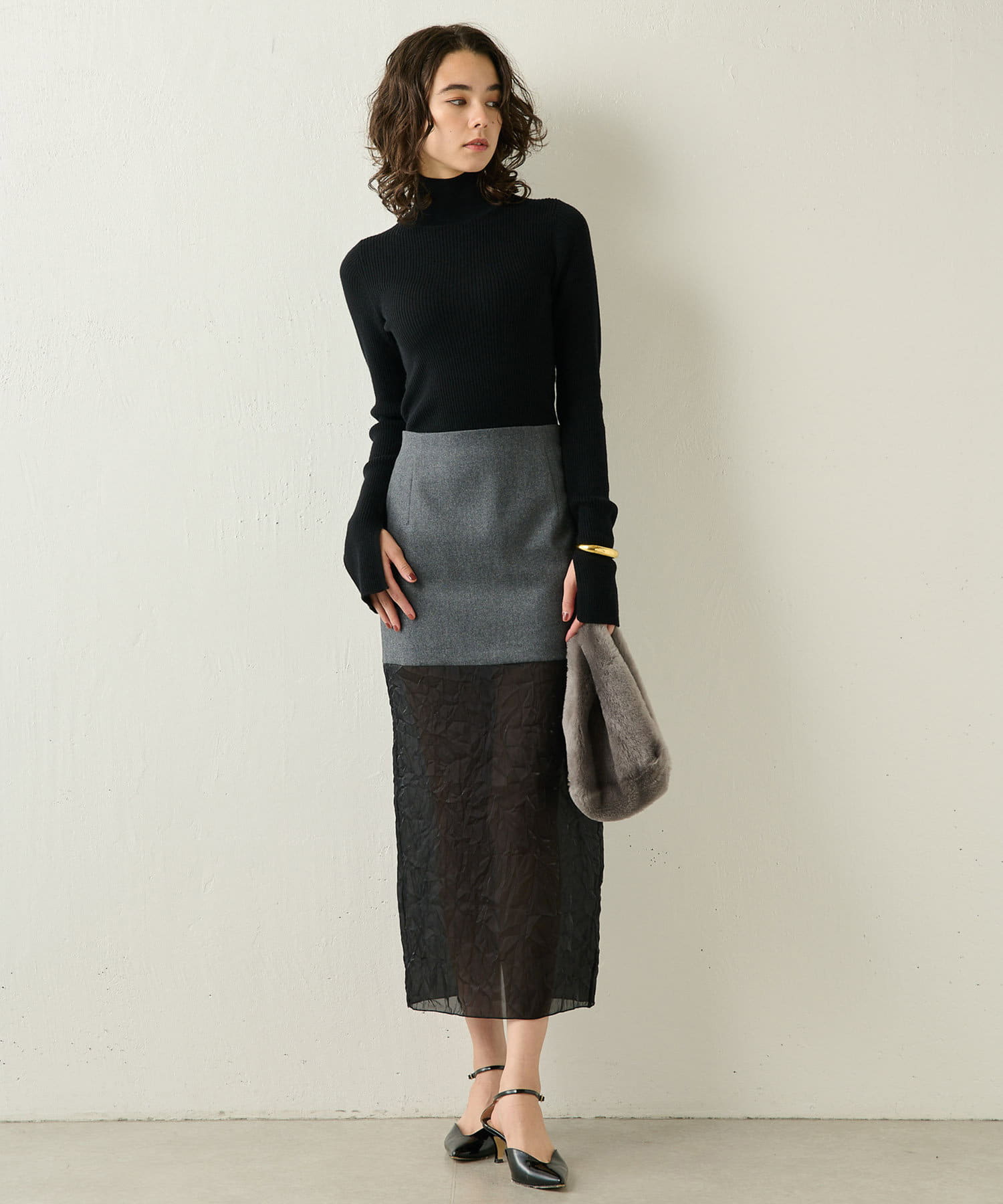 ■シアー素材で切り替えたドッキングデザインが印象的なタイトスカート。