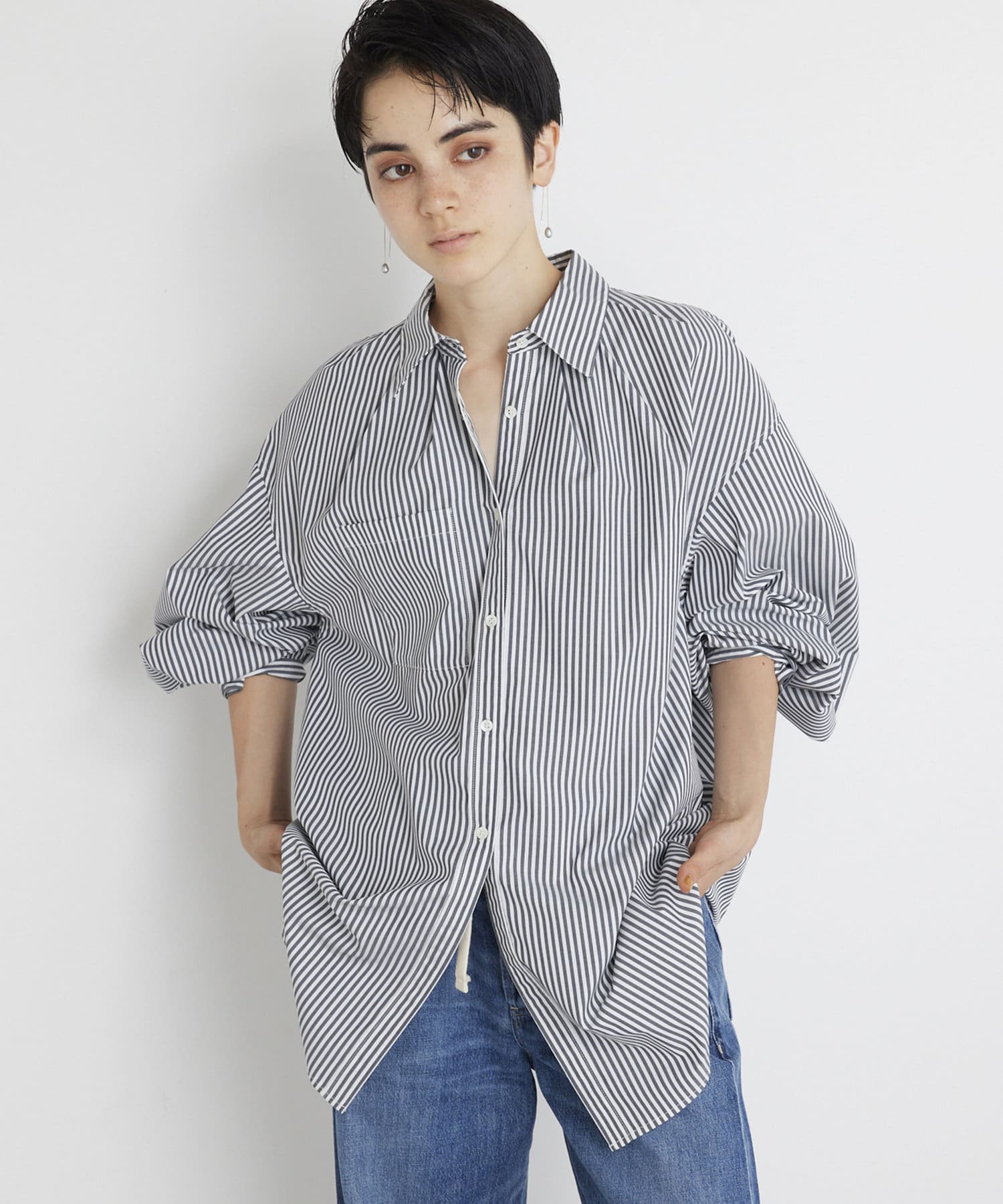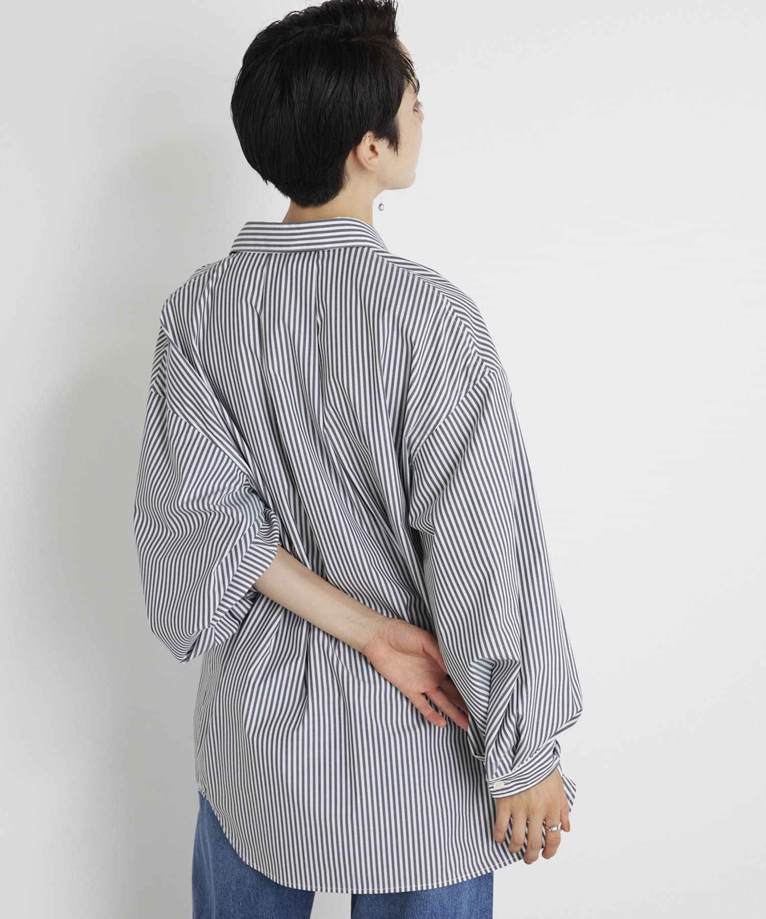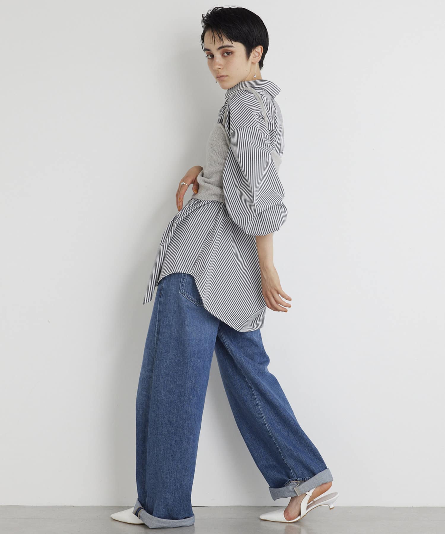 ■ニットやスウェットなどを重ねてもシャツの裾が見えるロング丈で、レイヤードスタイルにもおすすめ。