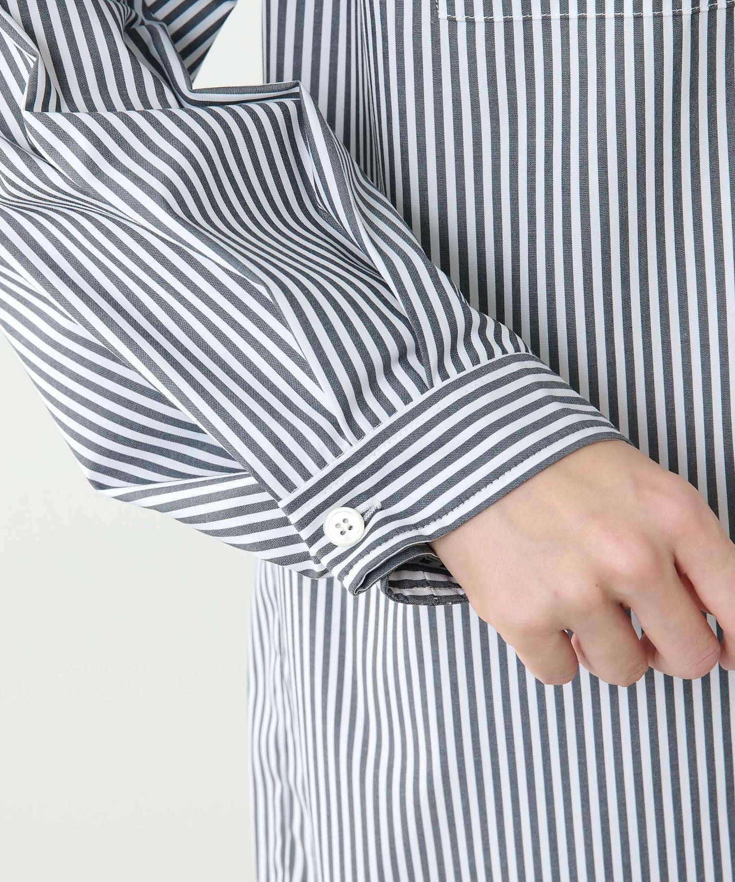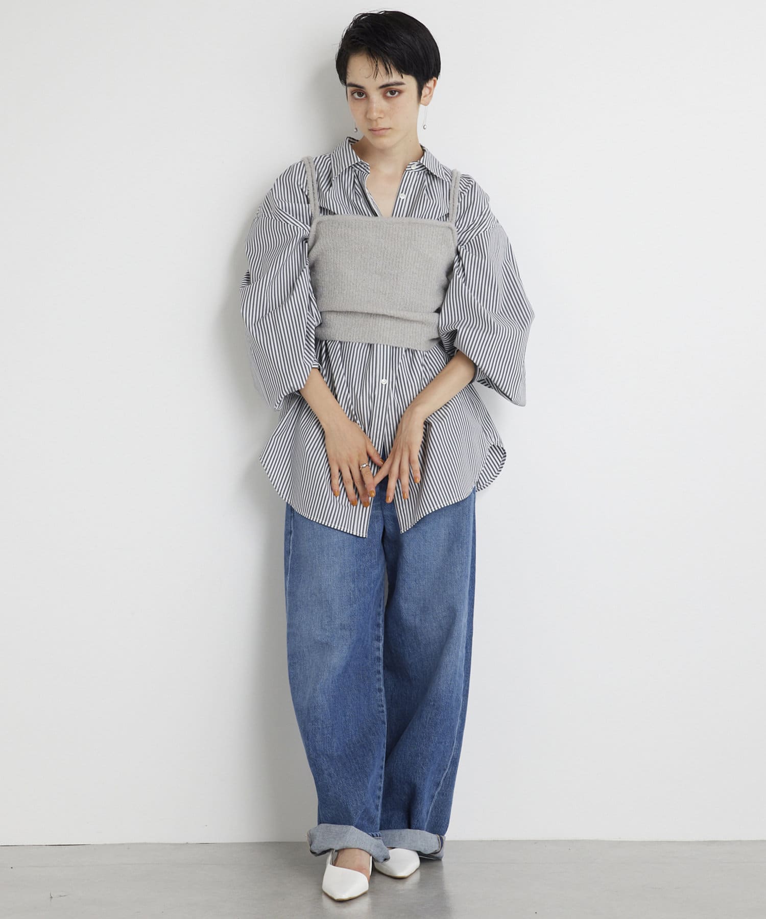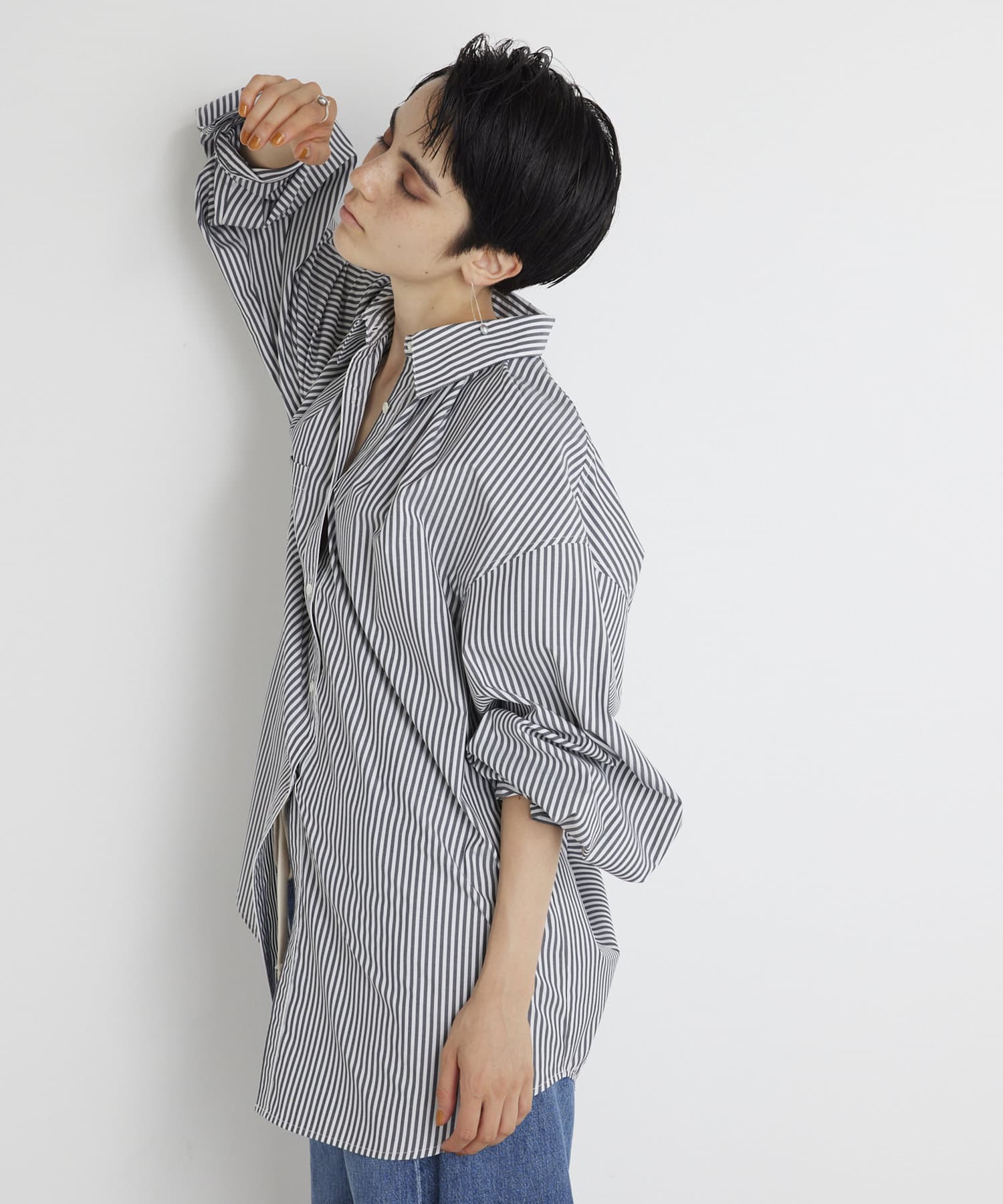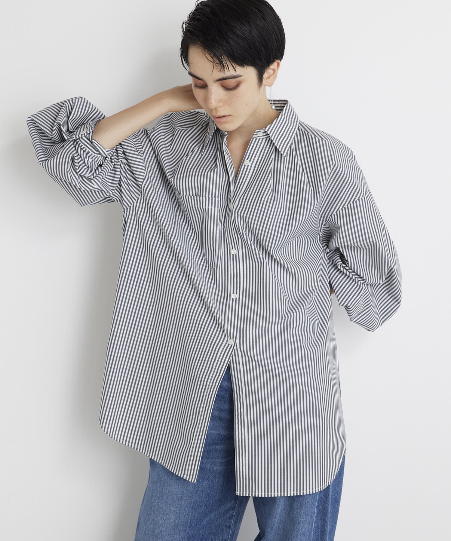 ■ニットやスウェットなどを重ねてもシャツの裾が見えるロング丈で、レイヤードスタイルにもおすすめ。