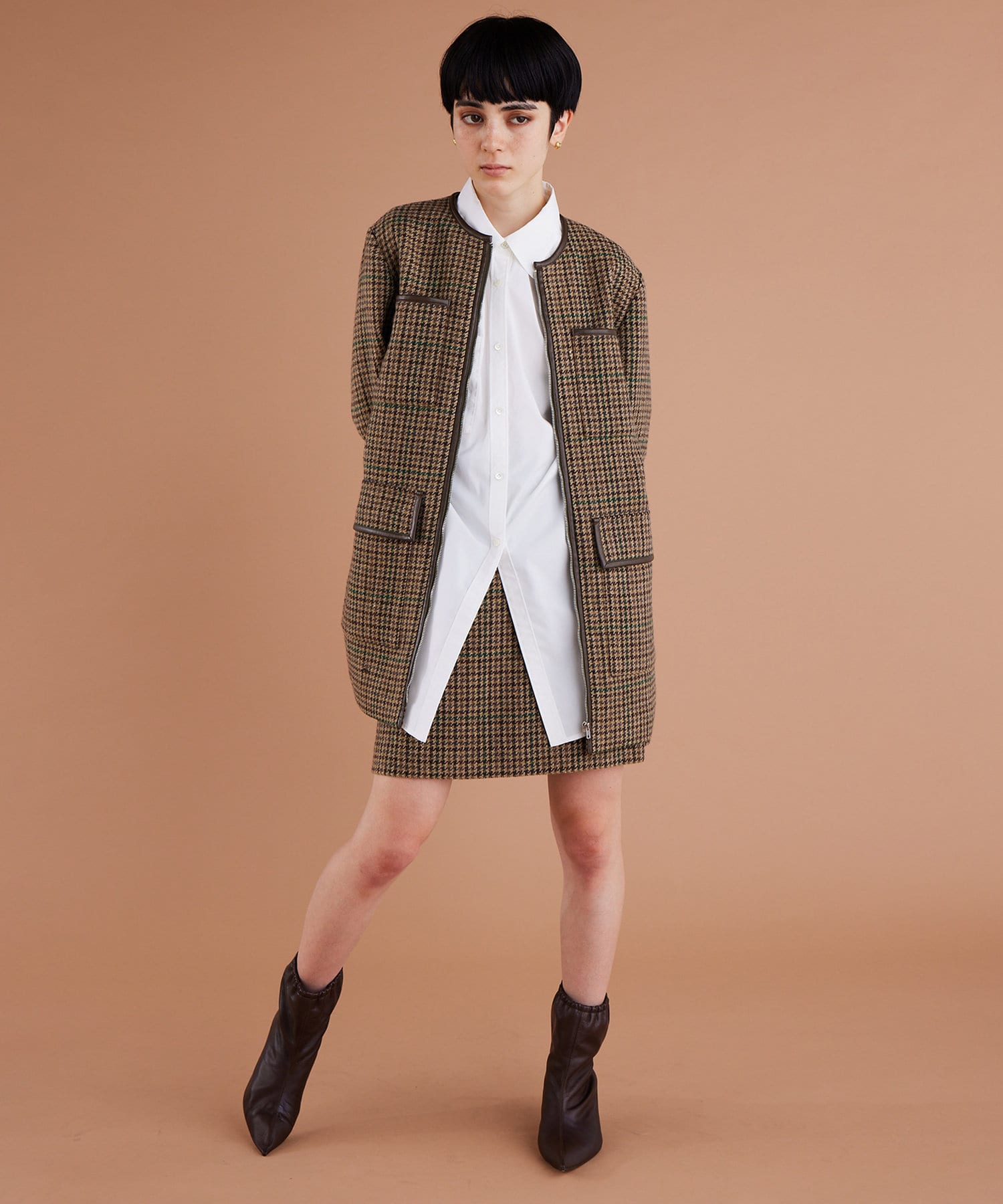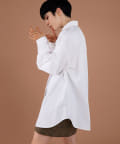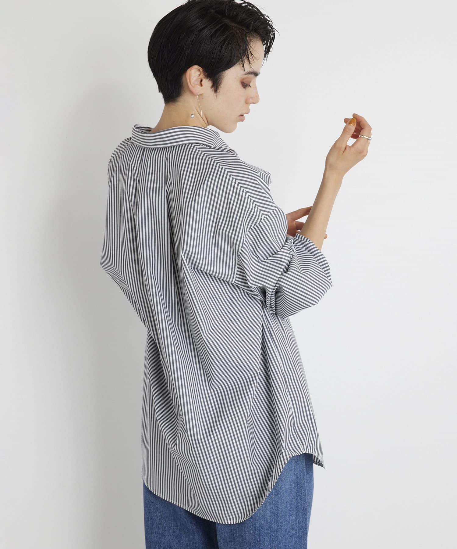 ■ニットやスウェットなどを重ねてもシャツの裾が見えるロング丈で、レイヤードスタイルにもおすすめ。