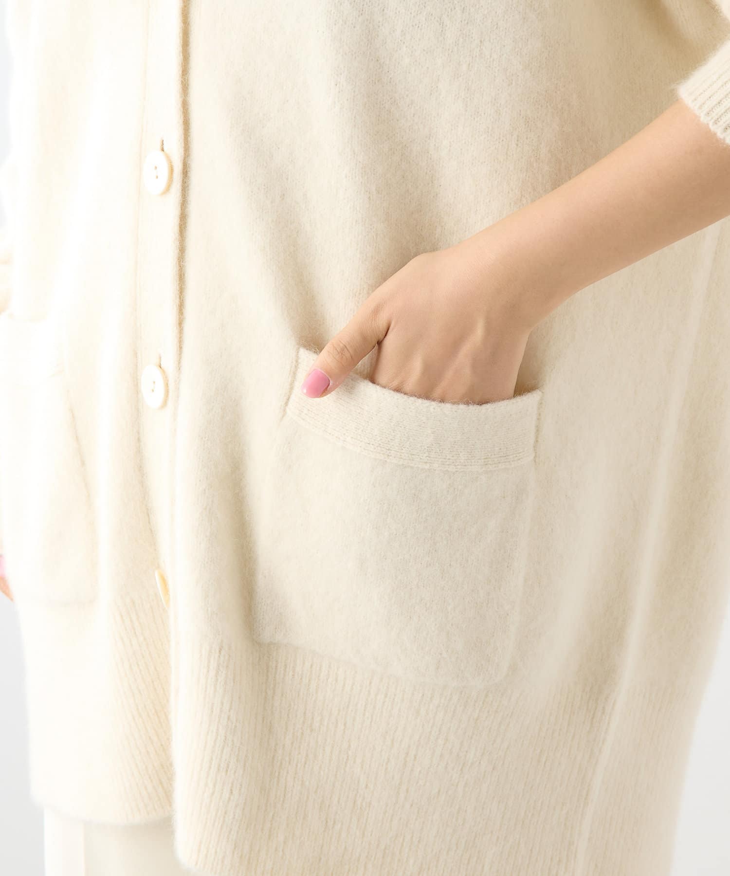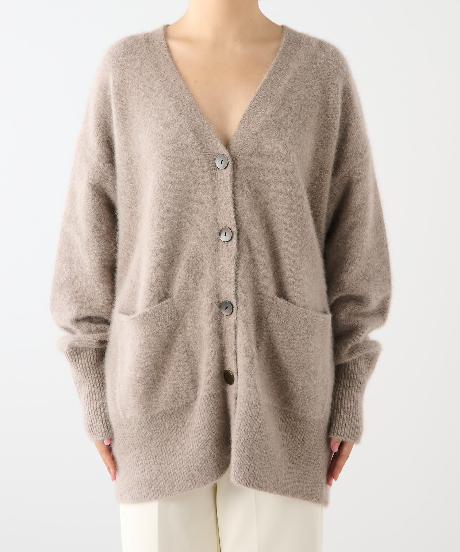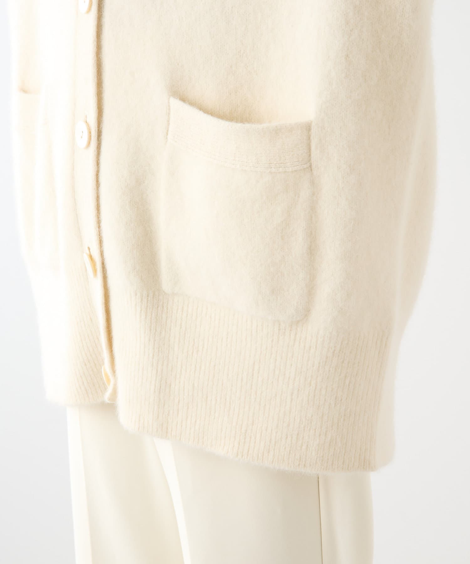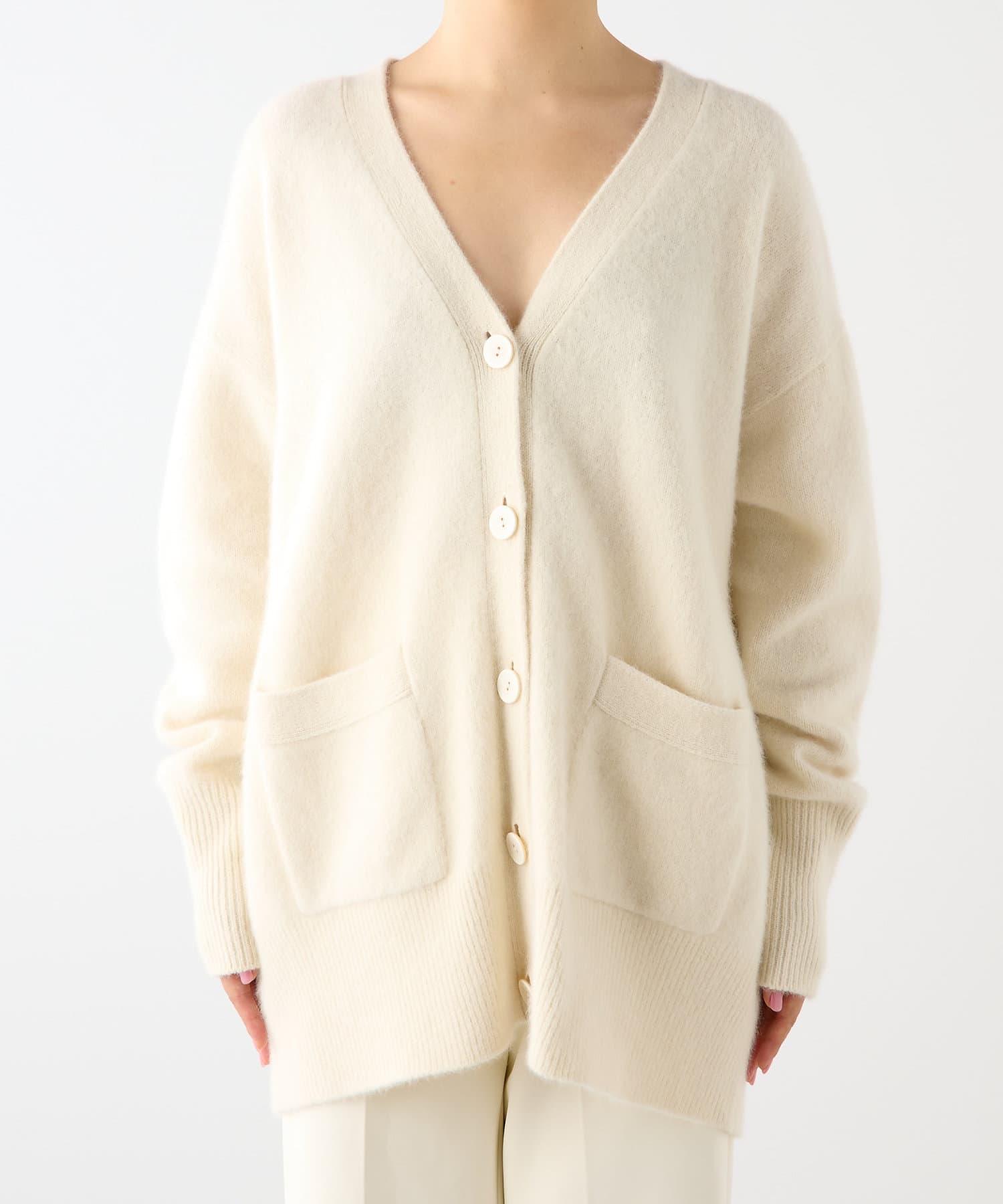 FOXならではの毛足の長さが華やかさを感じられるカーディガン。丈は長めなので、ボトムによっては前だけインするとバランスがとりやすいです。秋冬の羽織として、パッと羽織れる着映える一枚です。