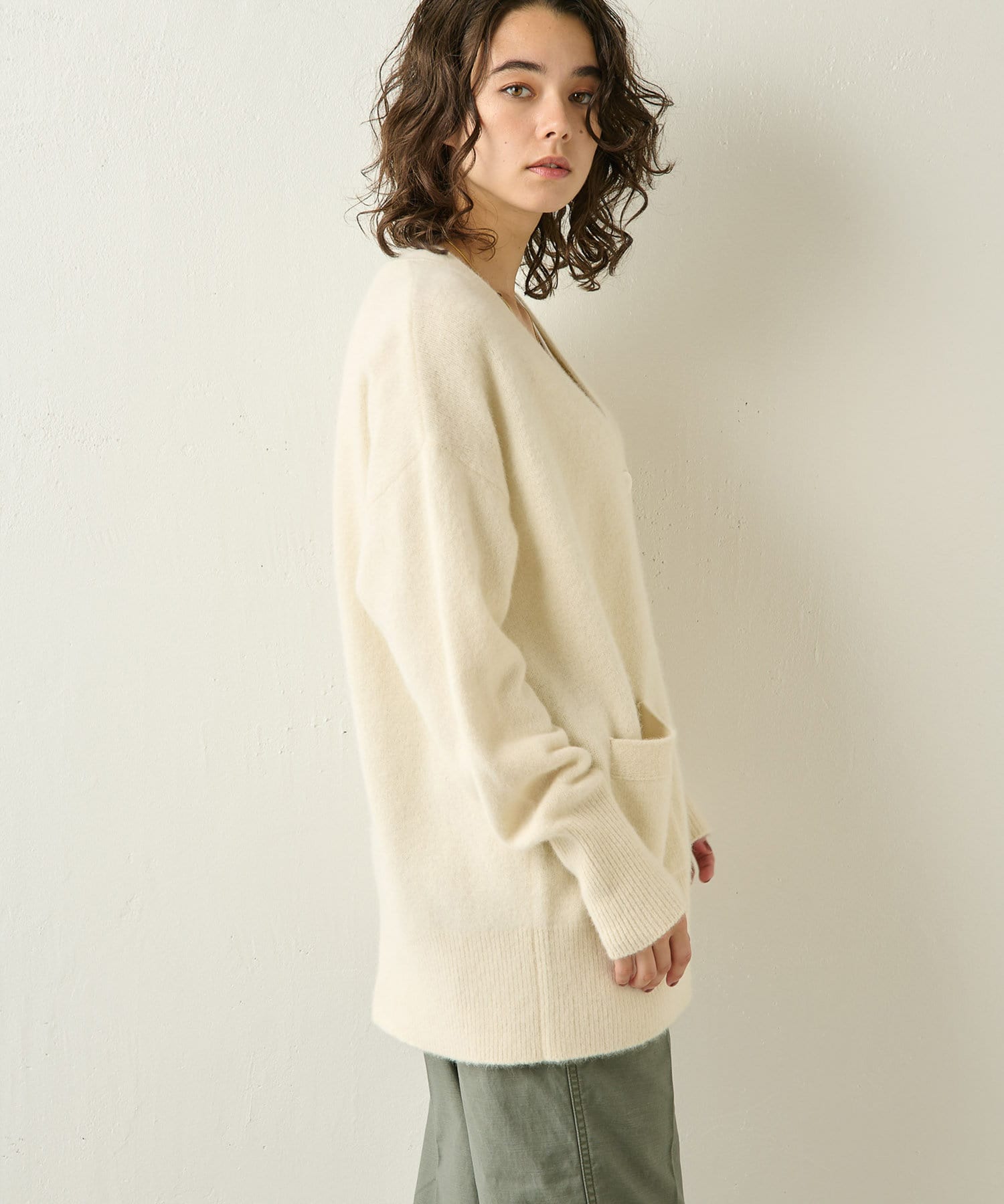 顔周りをすっきり見せるV開き。さらっと羽織りやすい程よいルーズなシルエットです。秋口から長くお召いただけます。思わず触れたくなる、ふわふわな生地で暖かいです◎