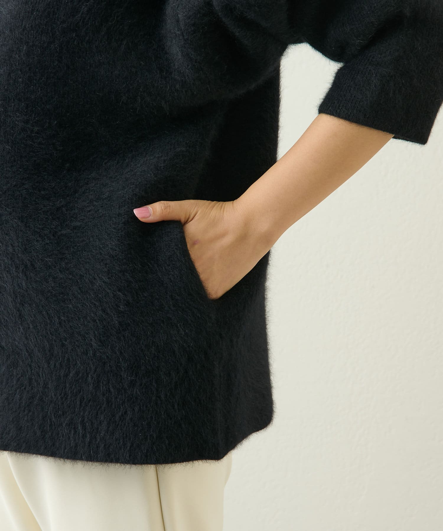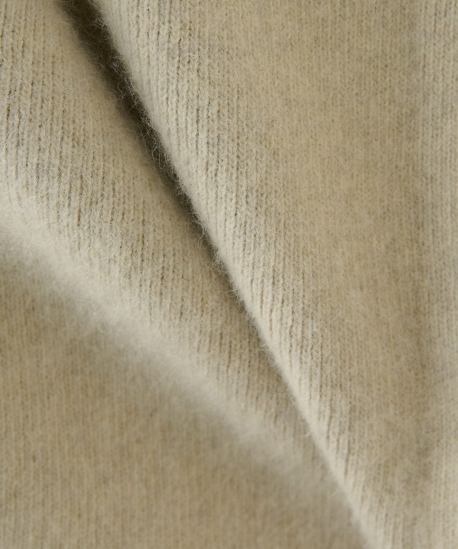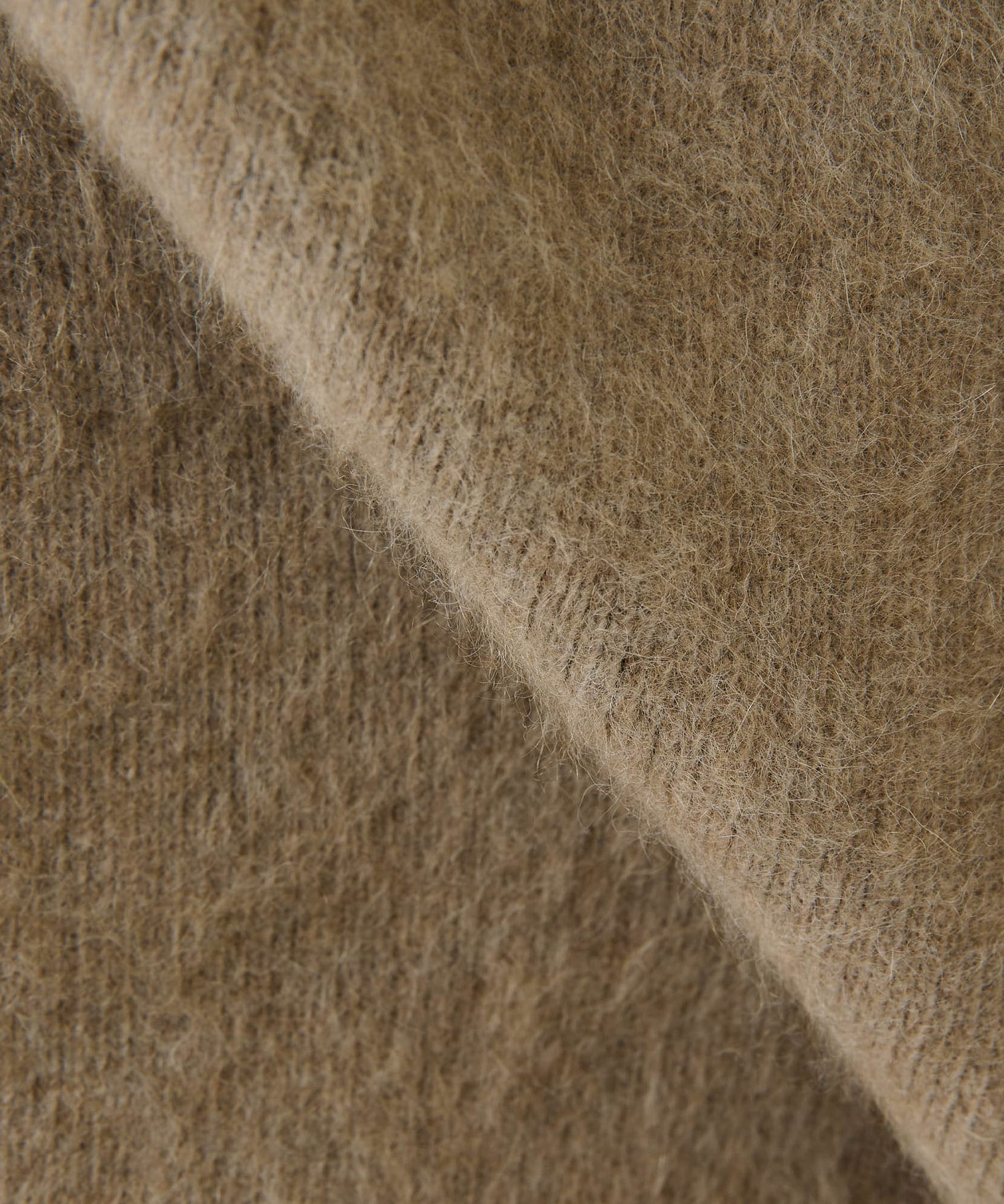 カシミヤのような超極細糸の軽やかでふっくらとしたボリュームのある風合い、素肌に触れてもチクチクしない滑らかな着心地、保温性も抜群のチャイニーズラクーン(タヌキ)を使用した接結素材。
