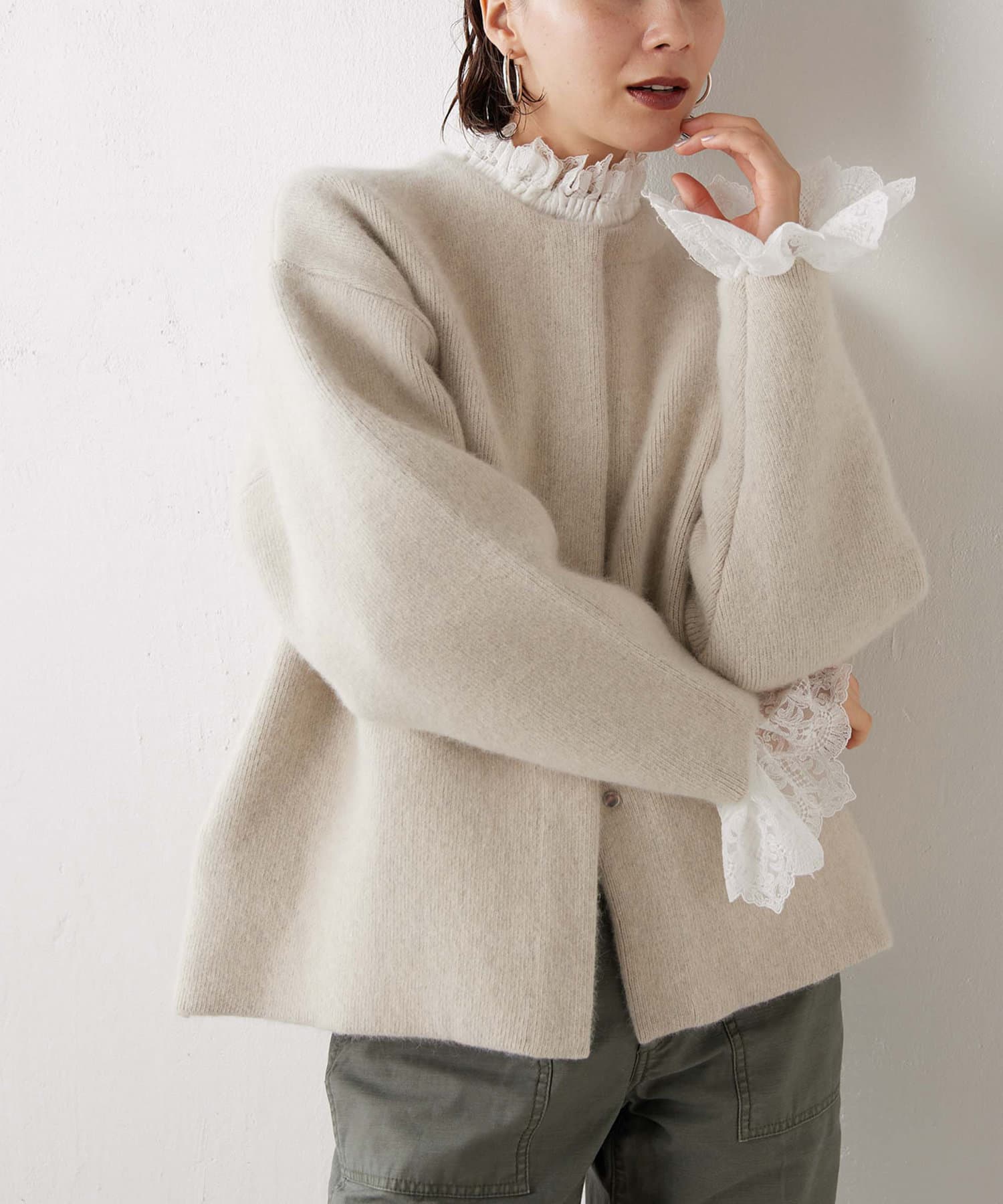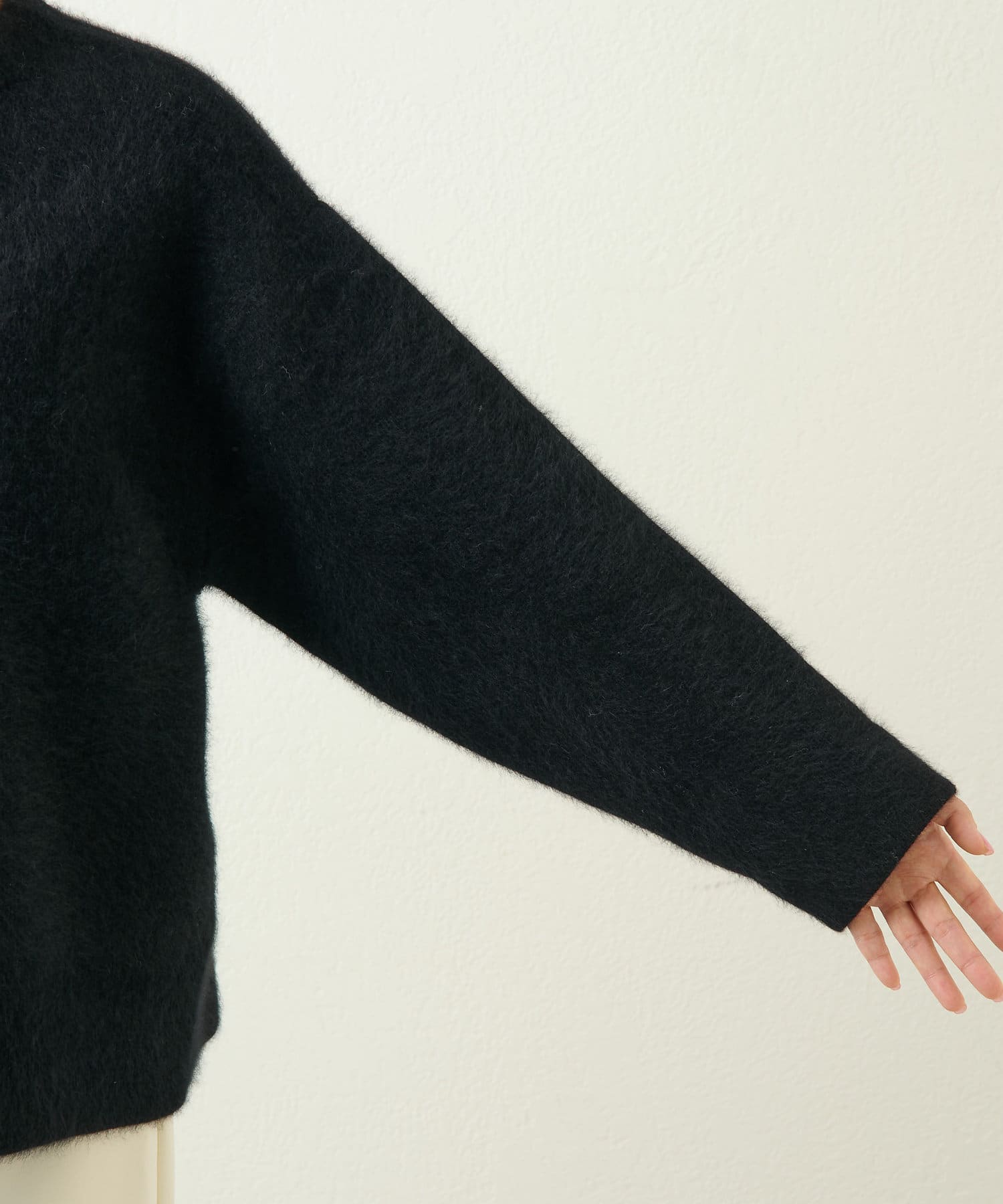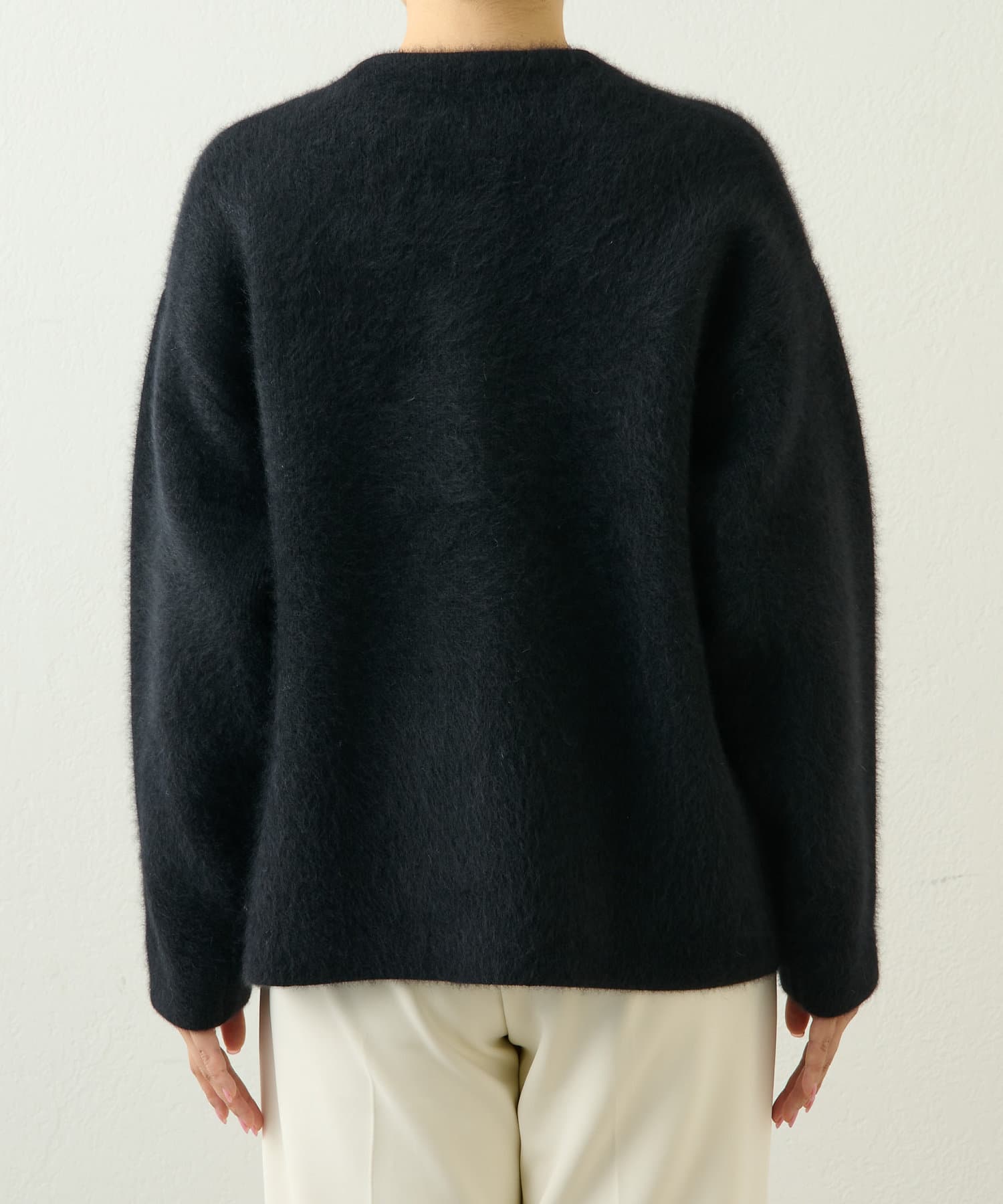 カシミヤのような超極細糸の軽やかでふっくらとしたボリュームのある風合い、素肌に触れてもチクチクしない滑らかな着心地、保温性も抜群のチャイニーズラクーン(タヌキ)を使用した接結素材。