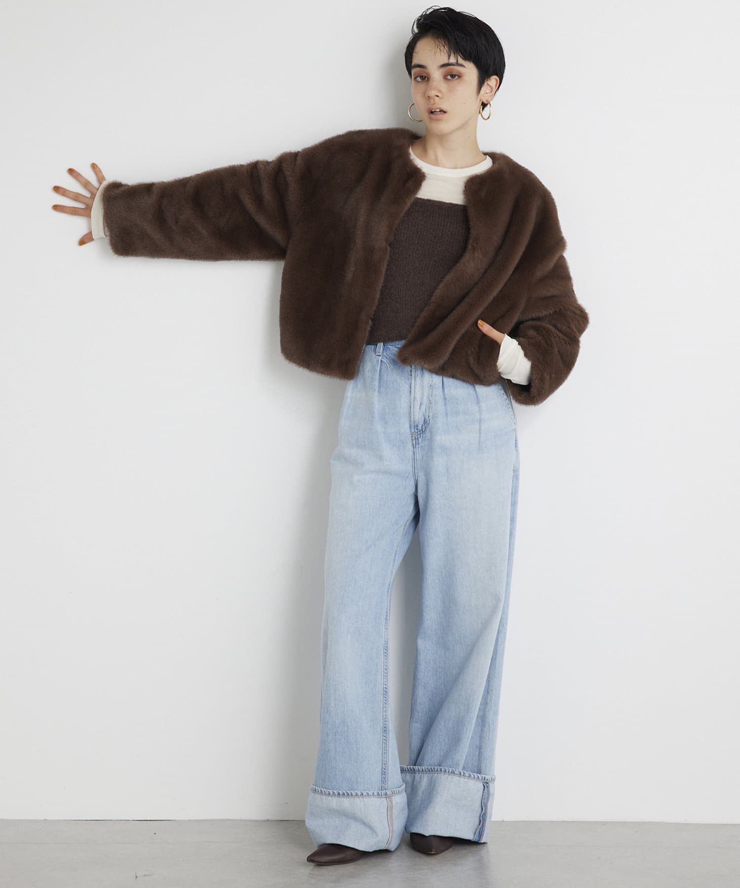 ■ゴージャスになりがちなファーアウターを、ショート丈にする事で少しカジュアルさをプラスし、柔らかなカラーで着こなしやすいアイテムに。