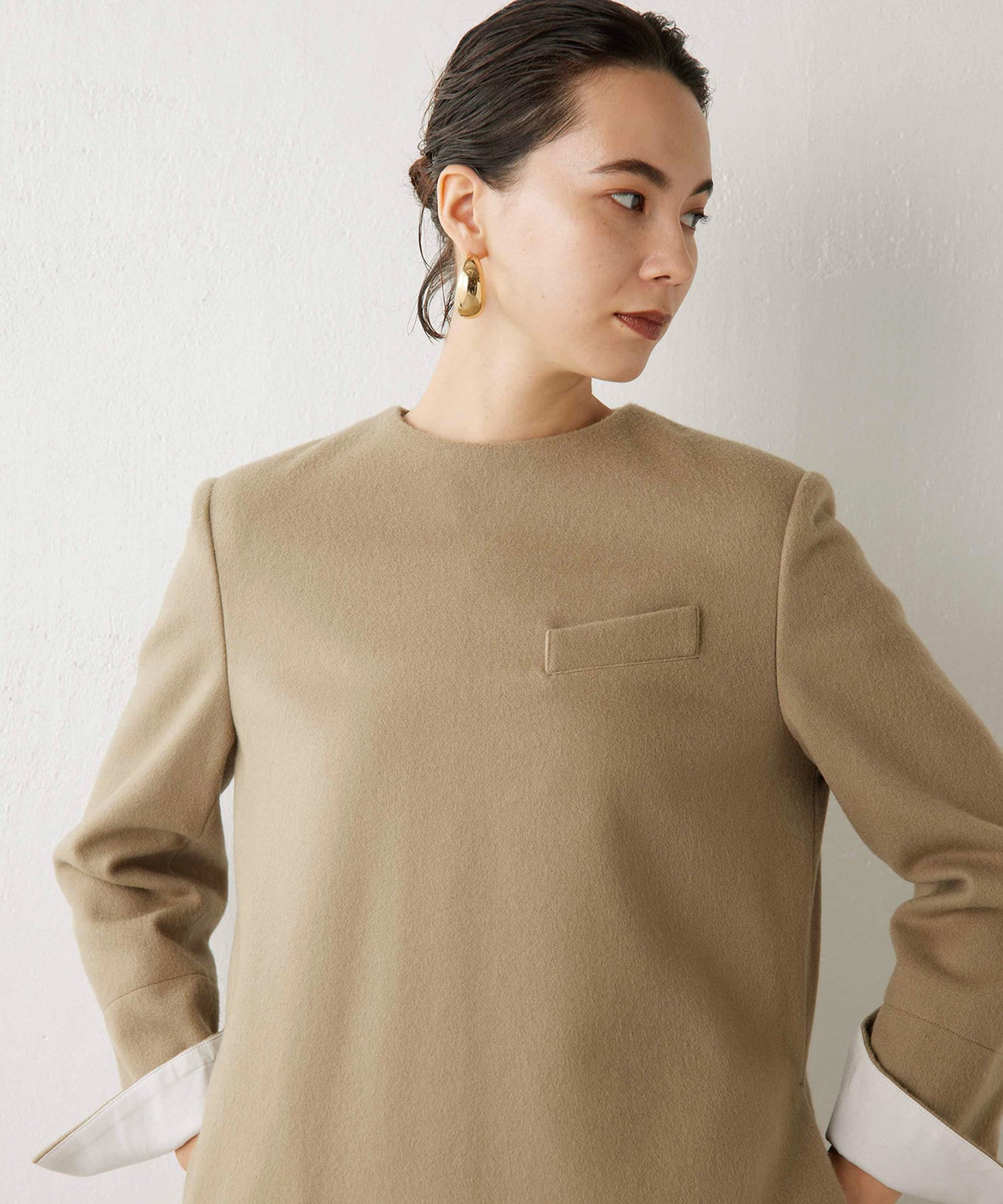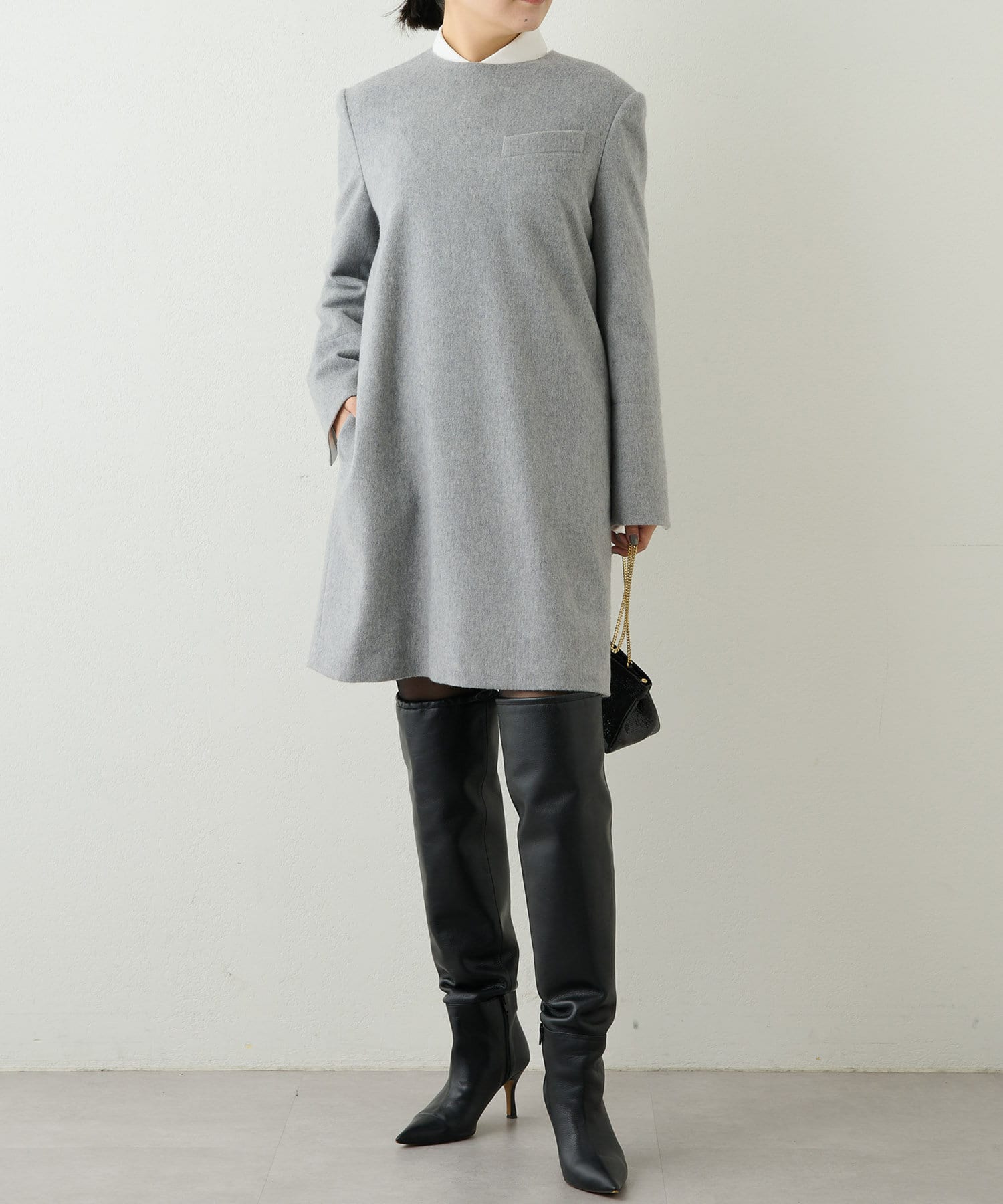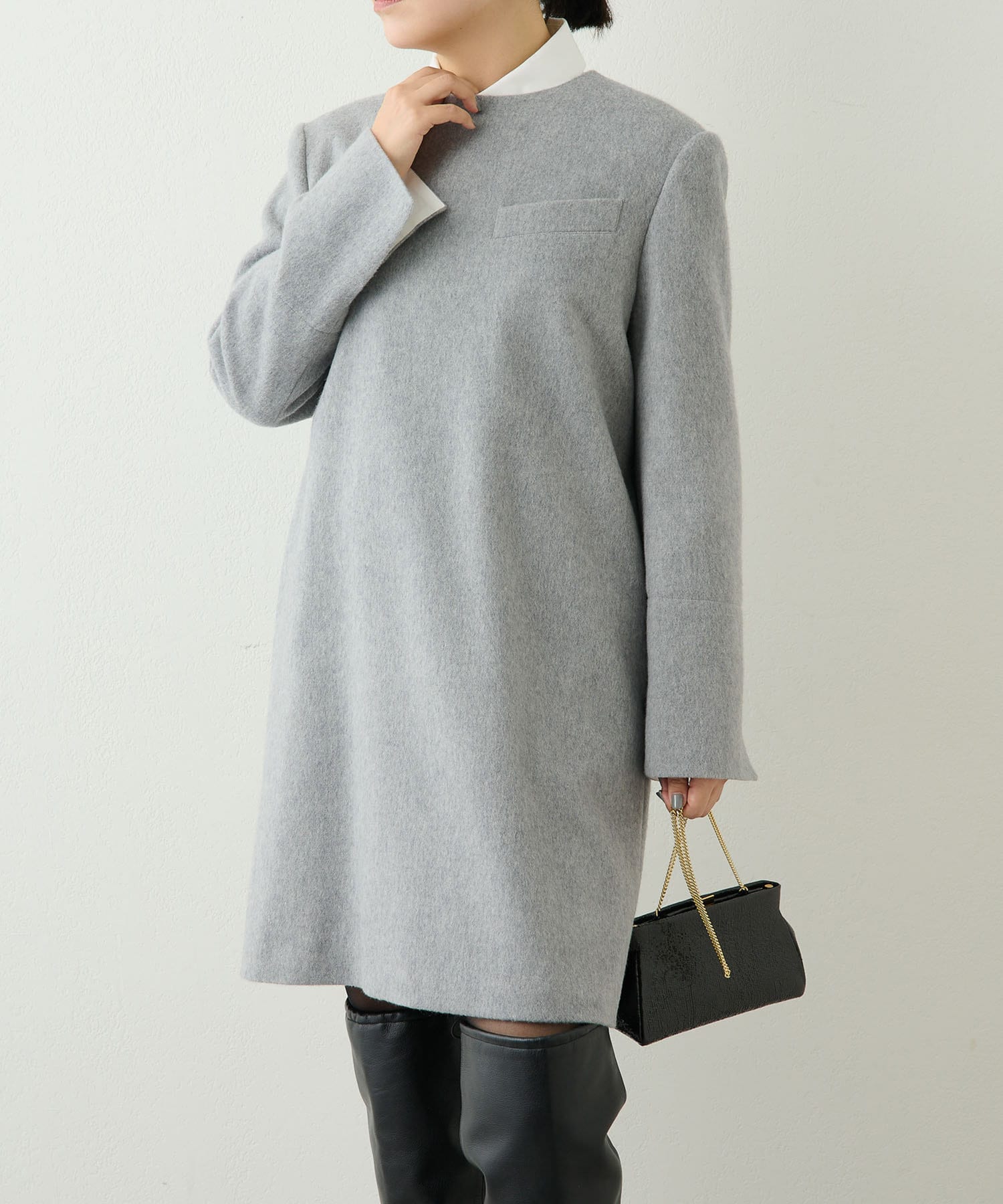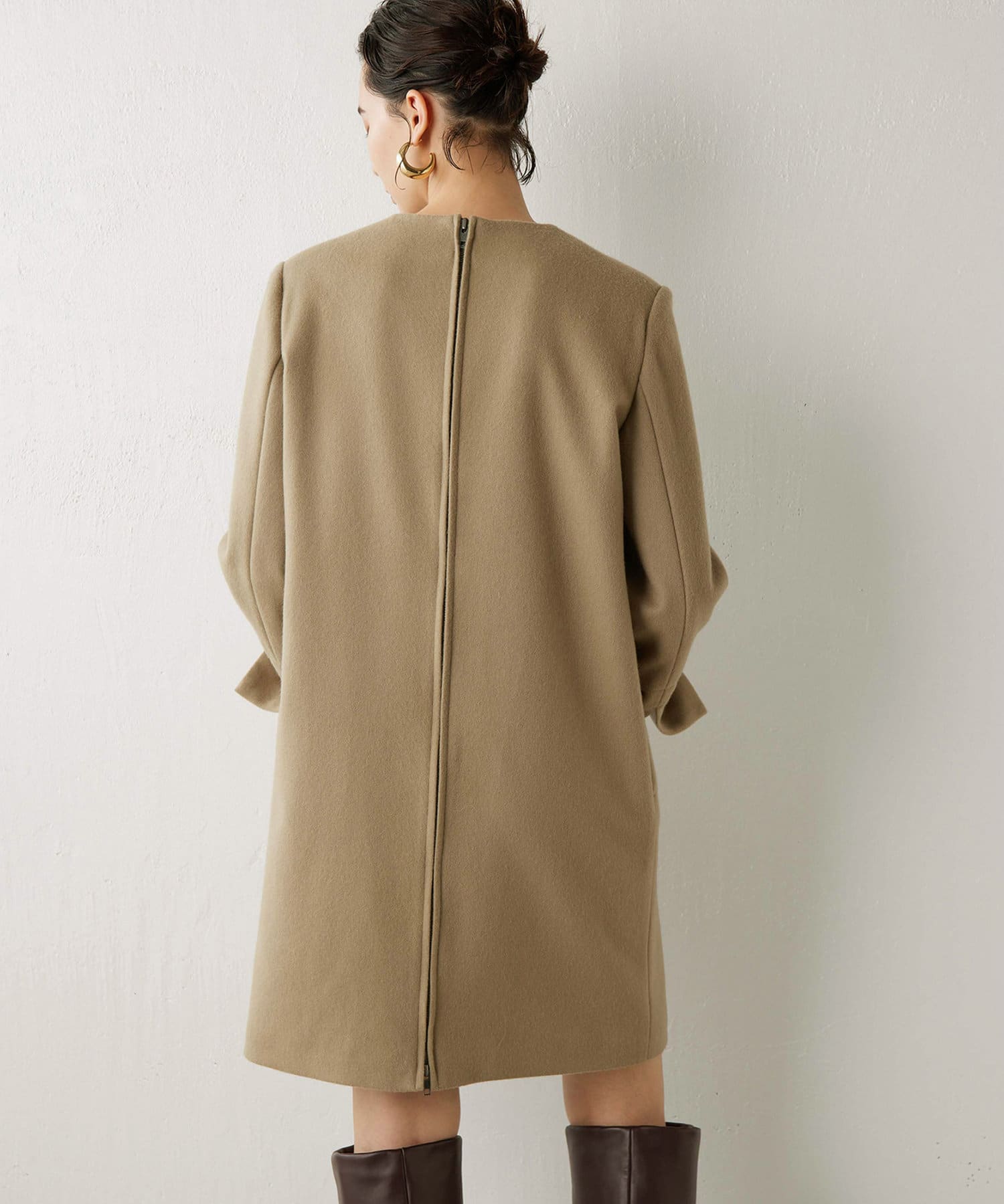 首から肩にかけてのラインがとても綺麗で、とてもスッキリ見えます。程よく厚みのある素材で、裏地もついているので冬も暖かく着られます。156cmで膝上丈でした。