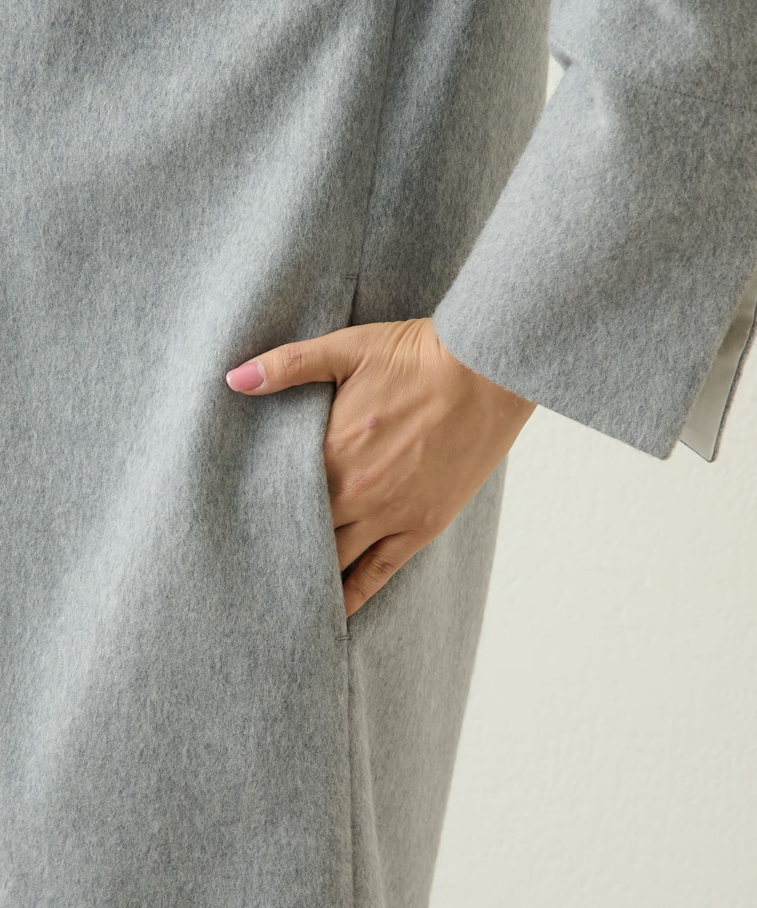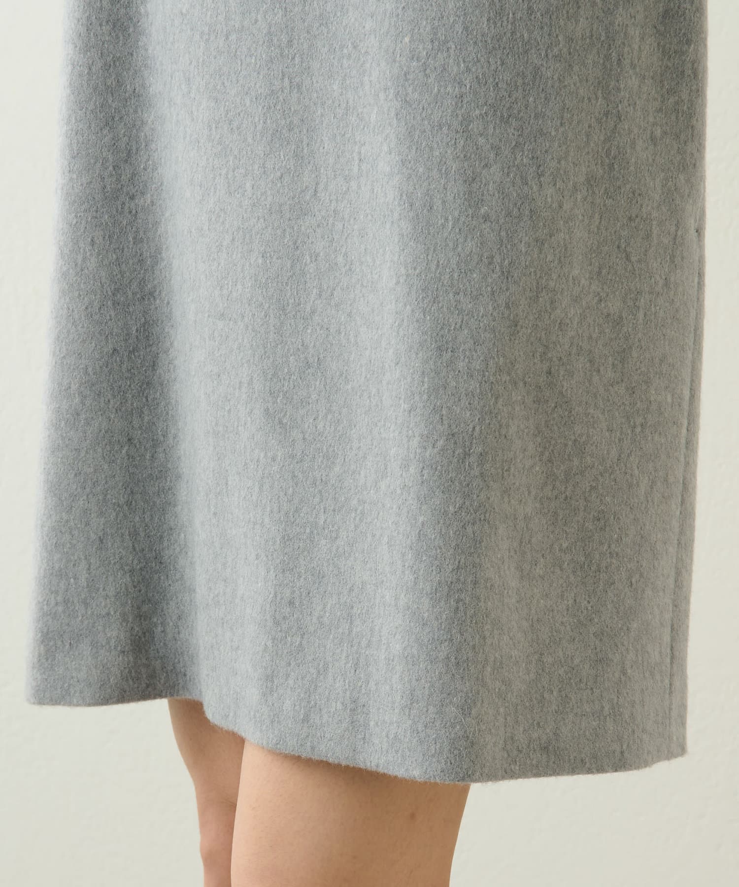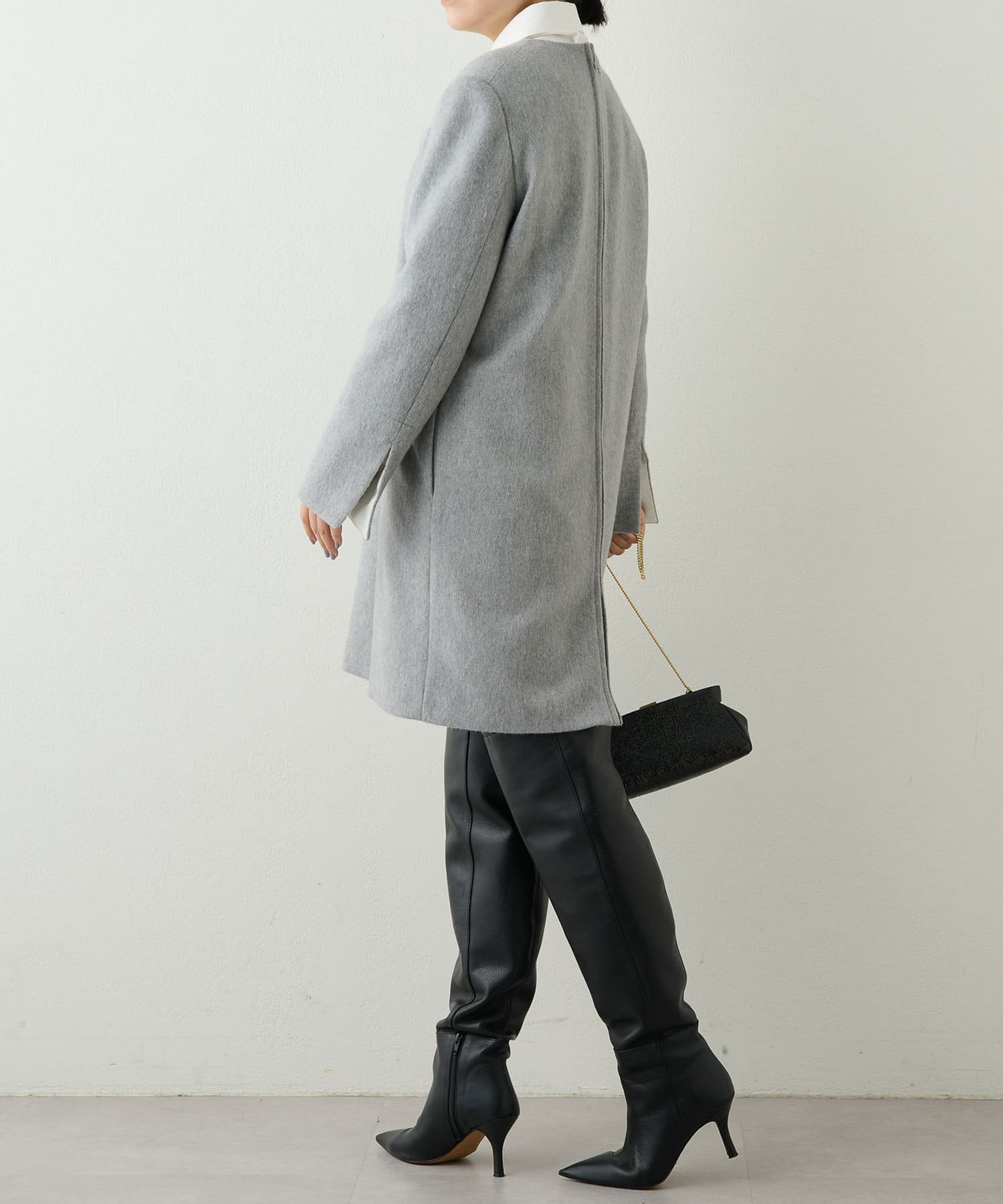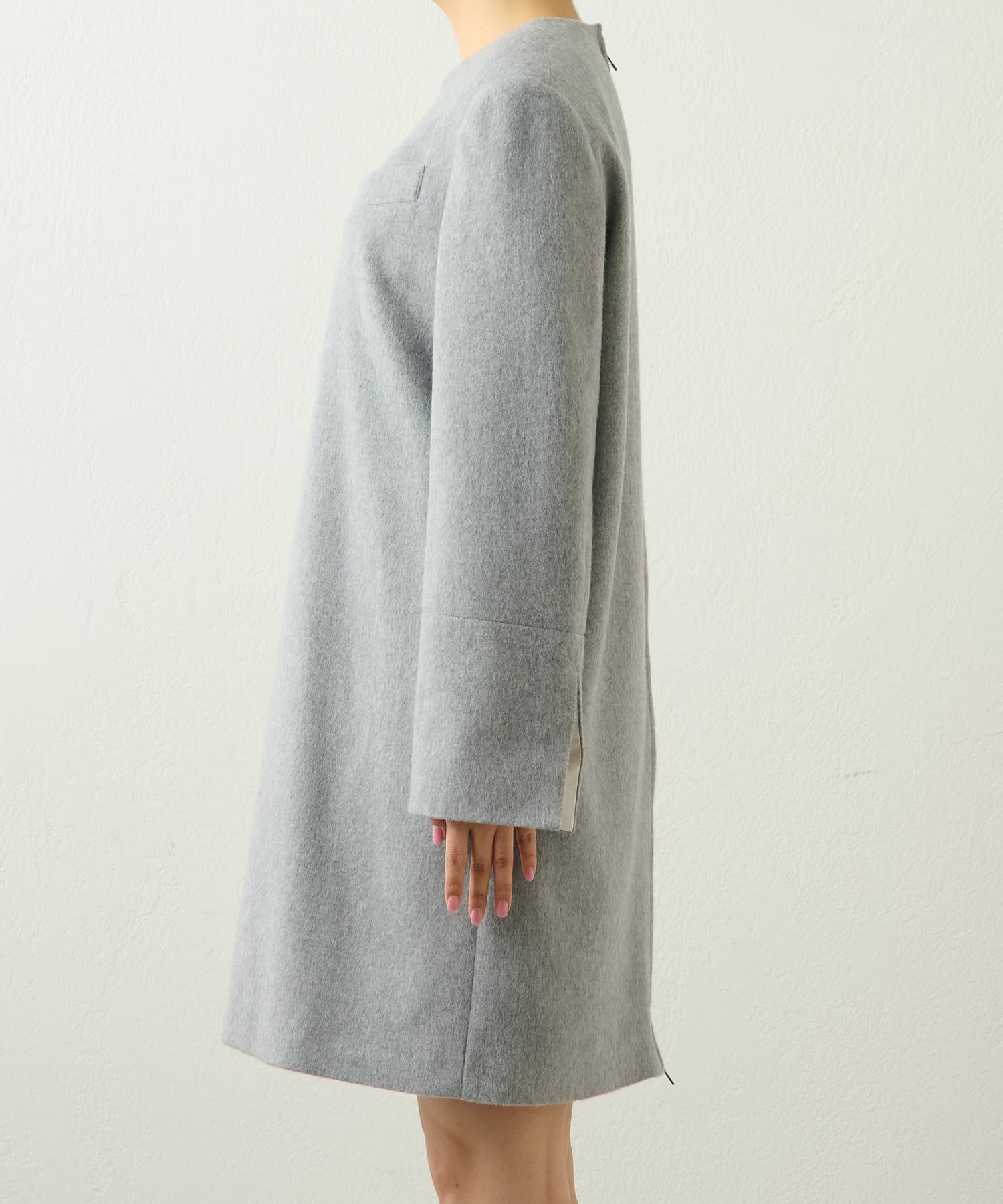 首から肩にかけてのラインがとても綺麗で、とてもスッキリ見えます。程よく厚みのある素材で、裏地もついているので冬も暖かく着られます。156cmで膝上丈でした。