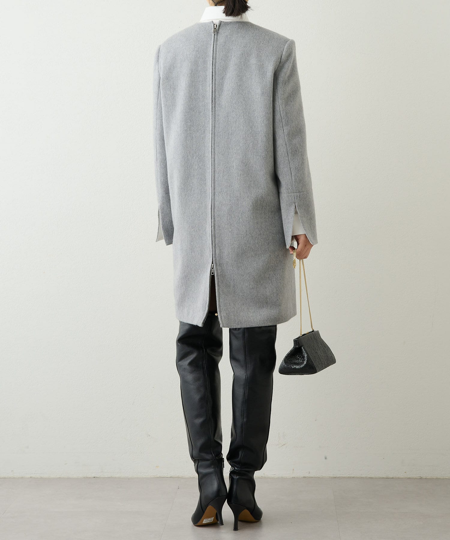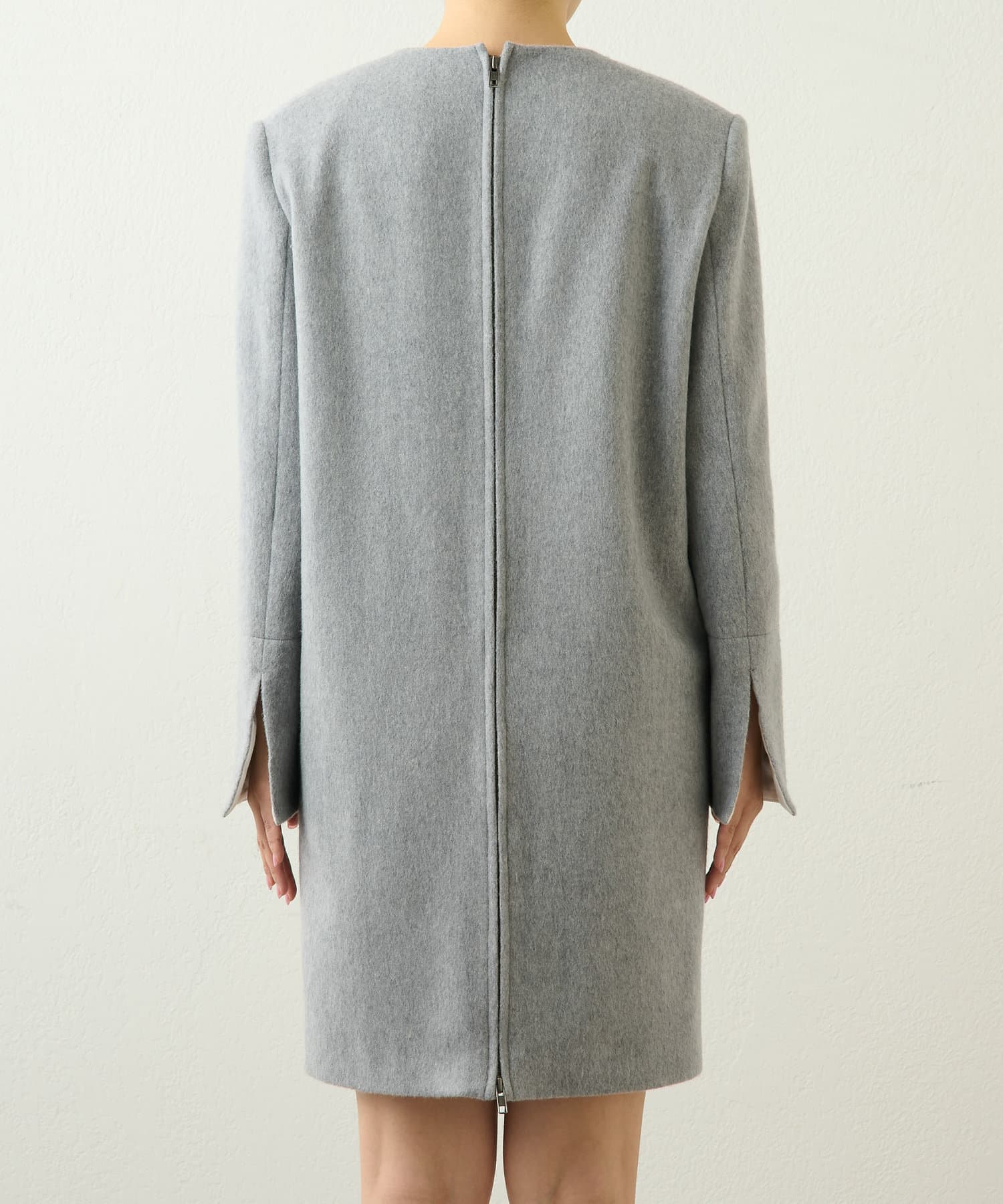 ■ワンピースとしてはもちろん、ボトムを合わせて後ろの逆開可能なジップを開けてスリットのように楽しむのも◎。