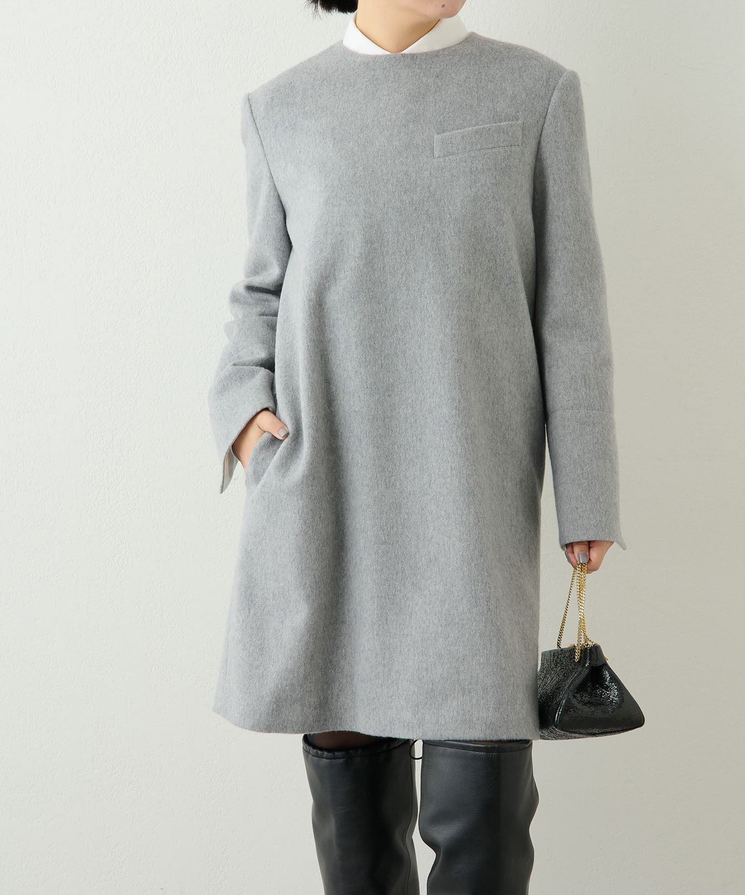 ■重衣料に使用する素材を敢えてワンピースに落とし込んだ、見た目のインパクトと温かさがポイント。