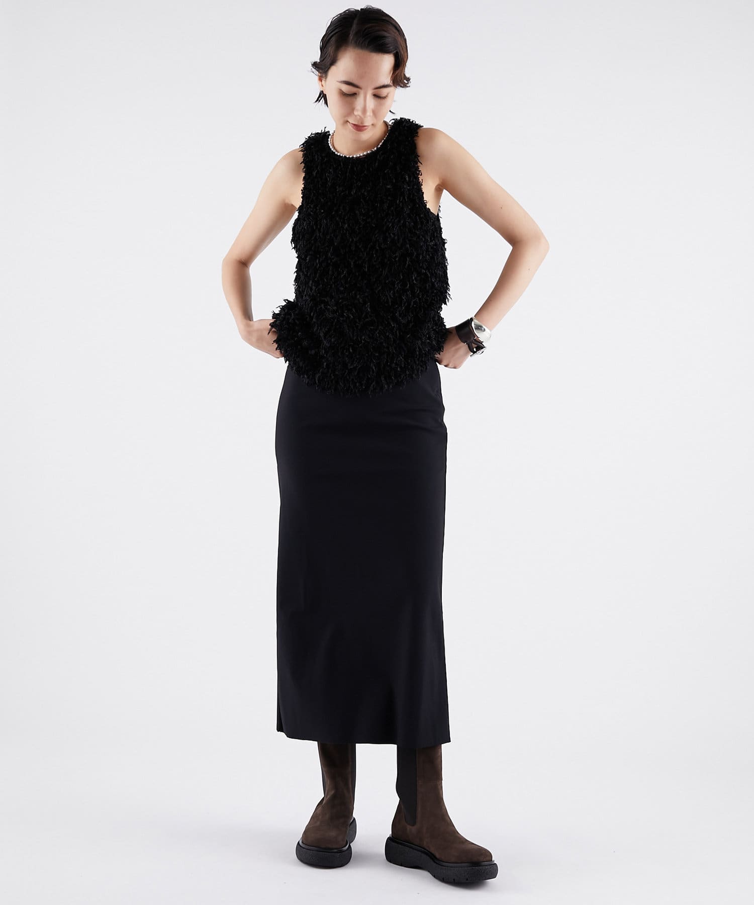 ■筒周りはすっきりとしたシルエットで、カジュアルながらもメリハリ感のあるスタイリングに。