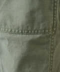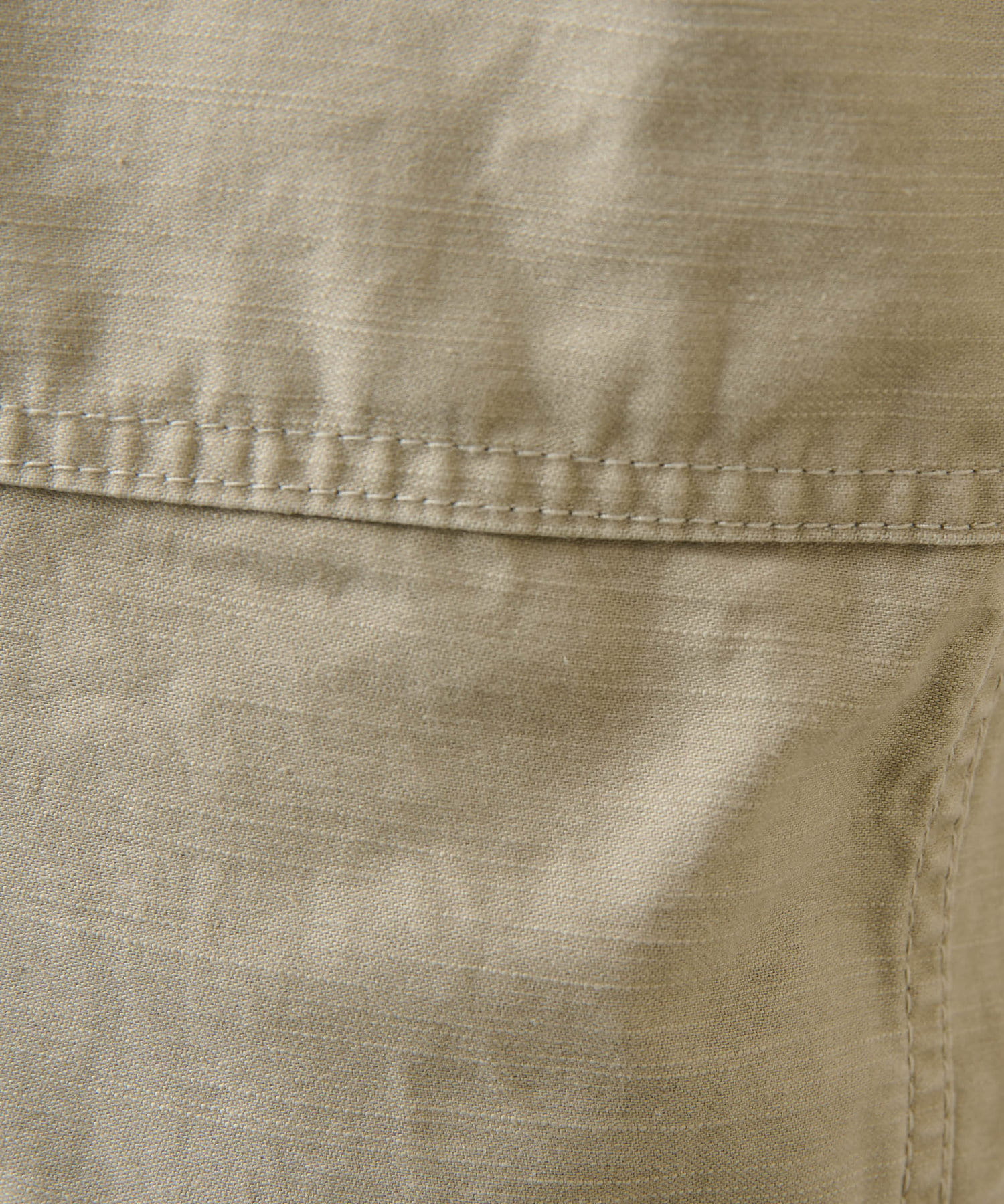 ヨコ糸にムラ糸を使用する事によりスラブ感が強調され、サテンを裏使いすることでミリタリー感を前面に出した生地。