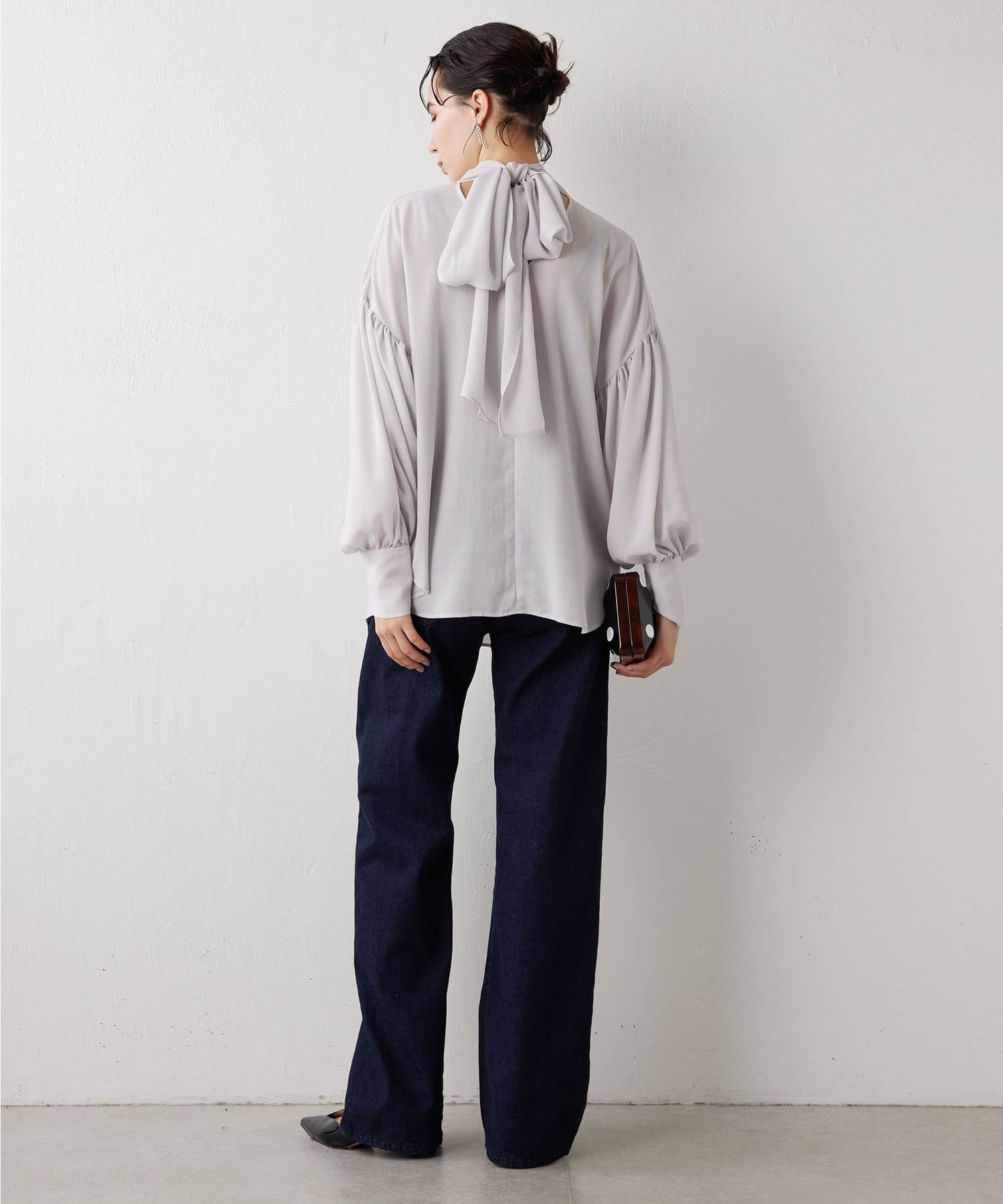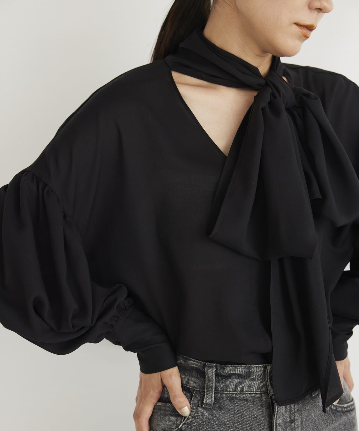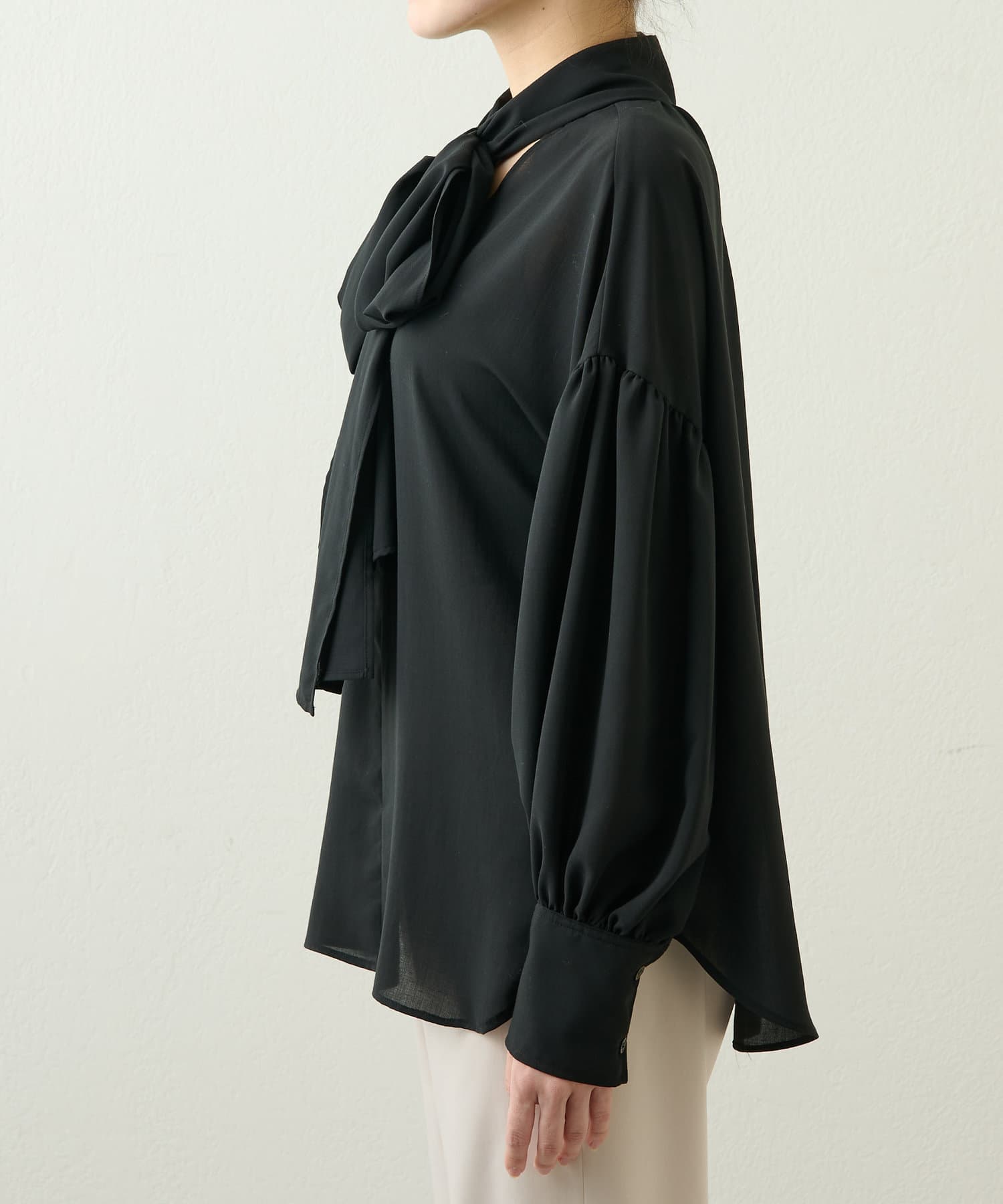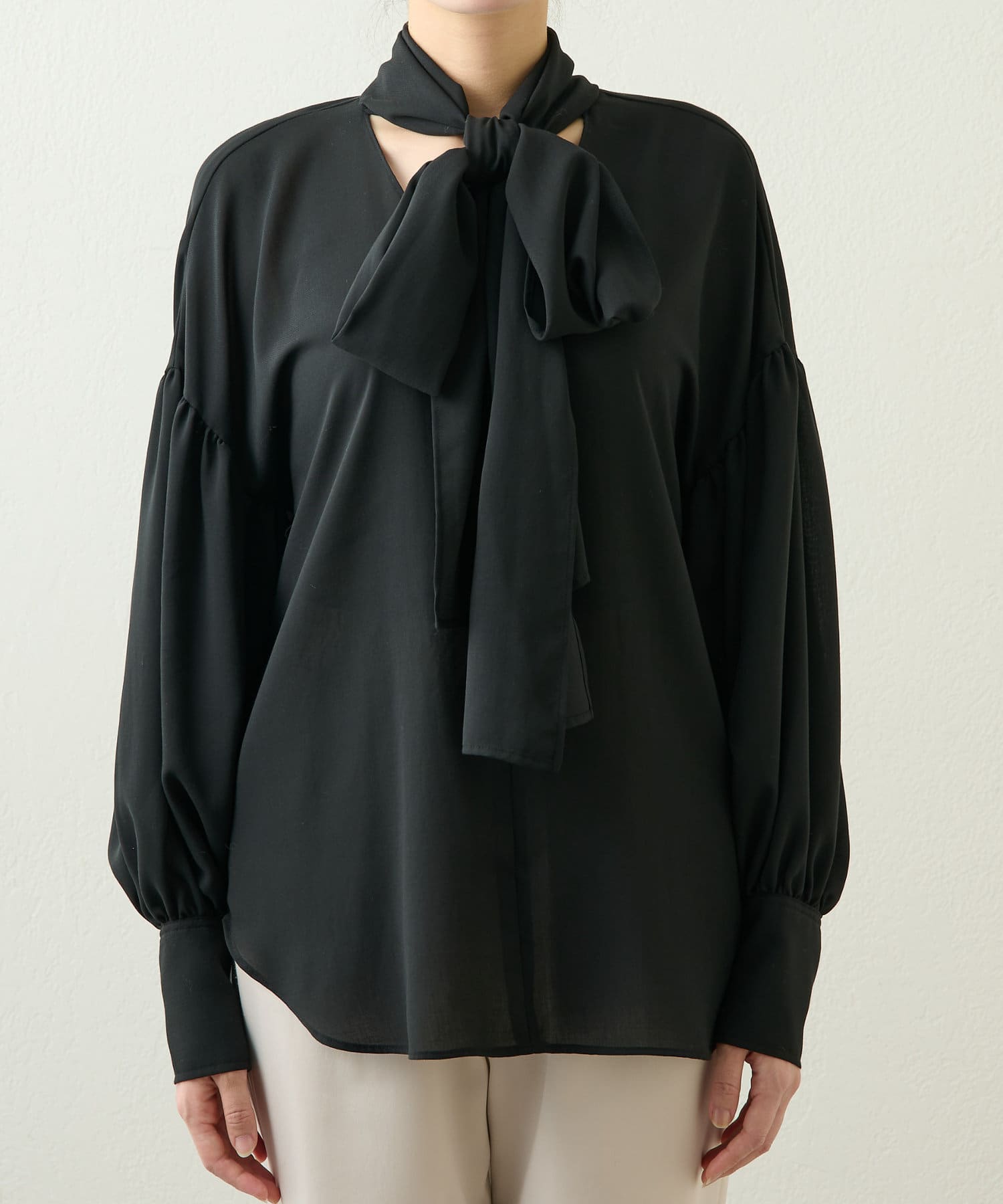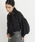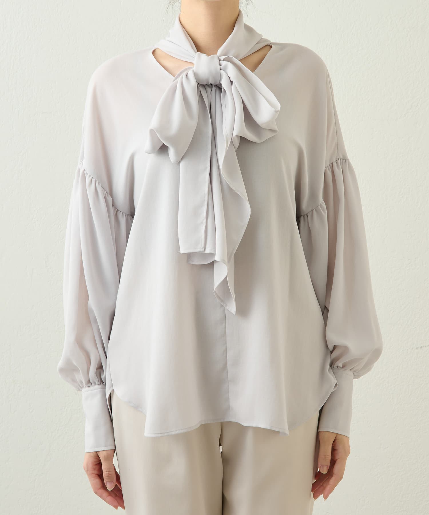 ■ボリューム感のあるギャザースリーブとボウタイが印象的なブラウス。