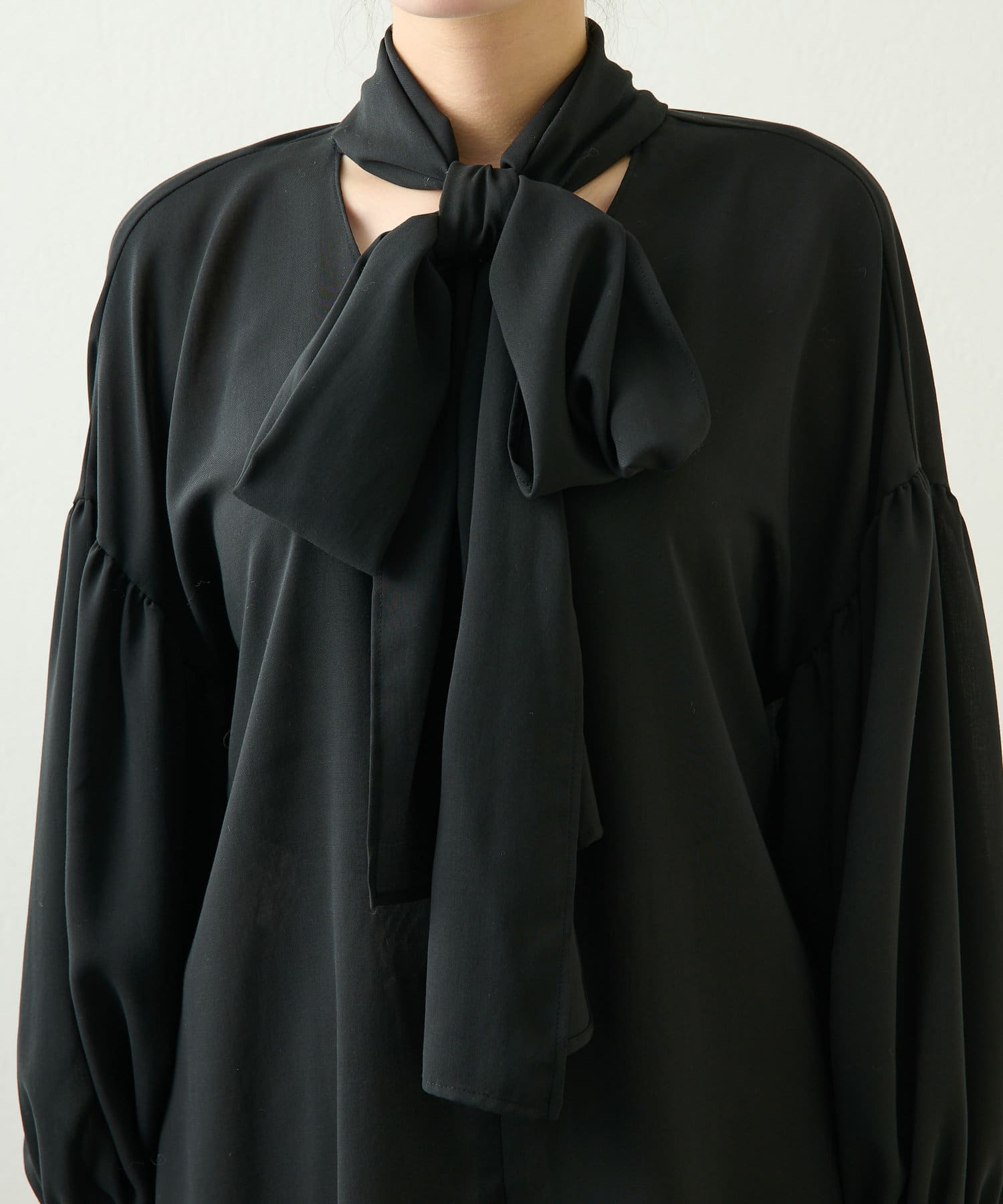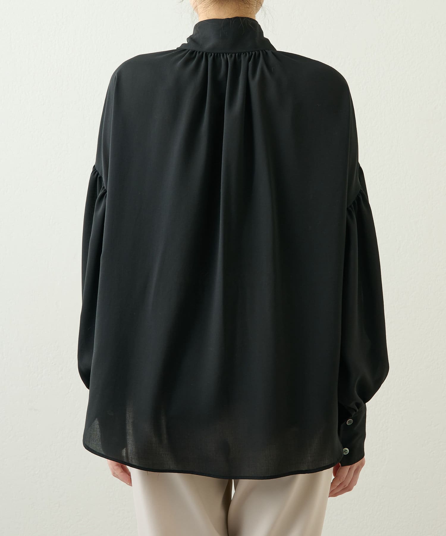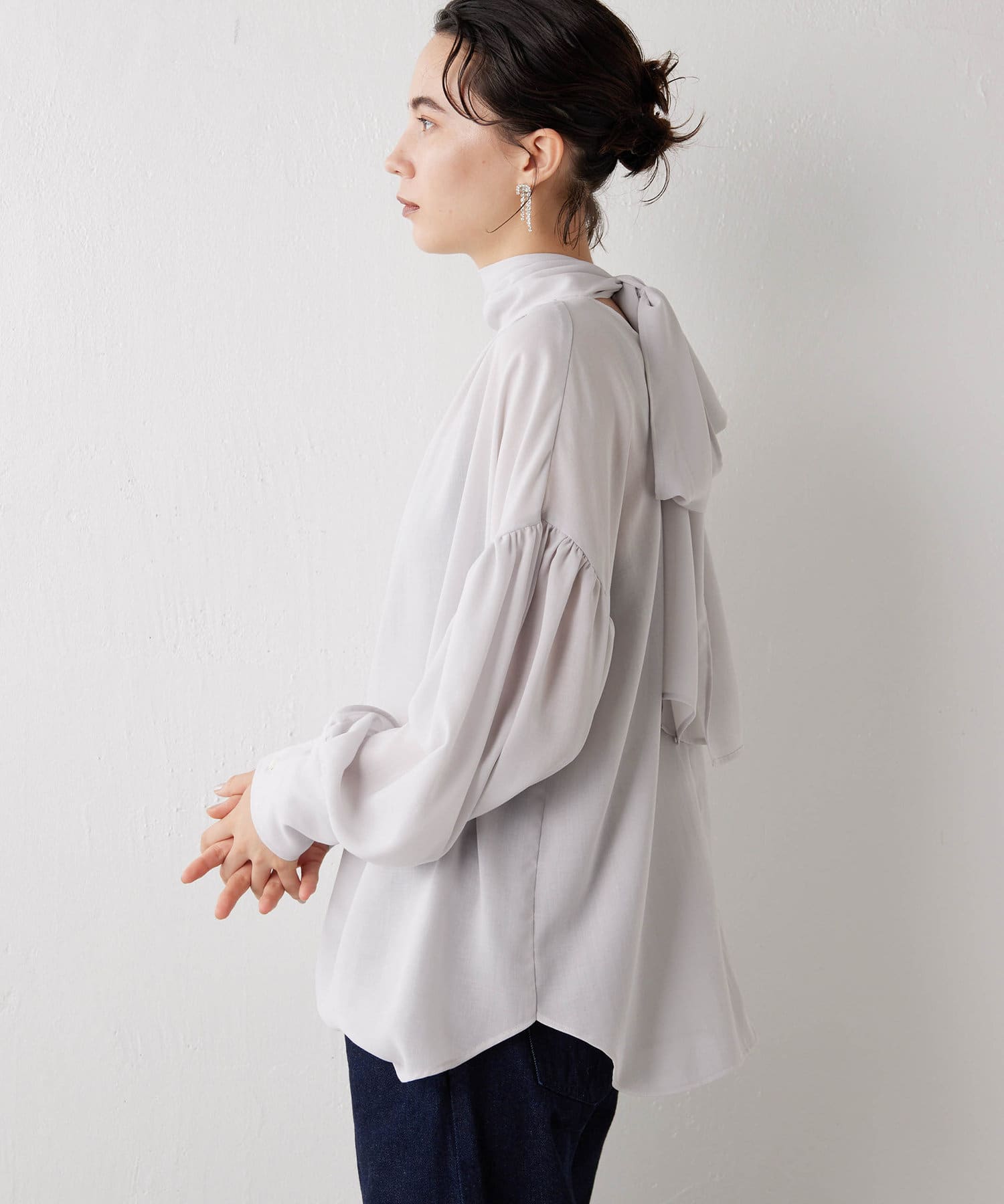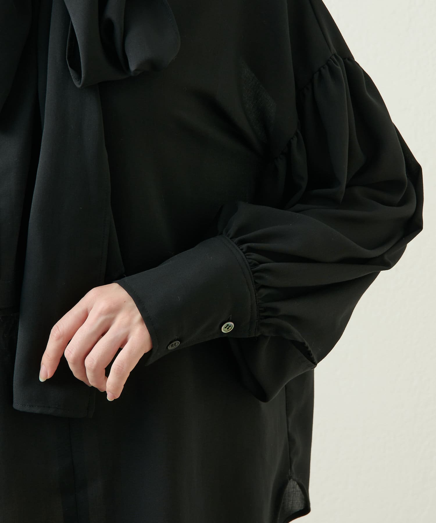 ■ボリューム感のあるギャザースリーブとボウタイが印象的なブラウス。