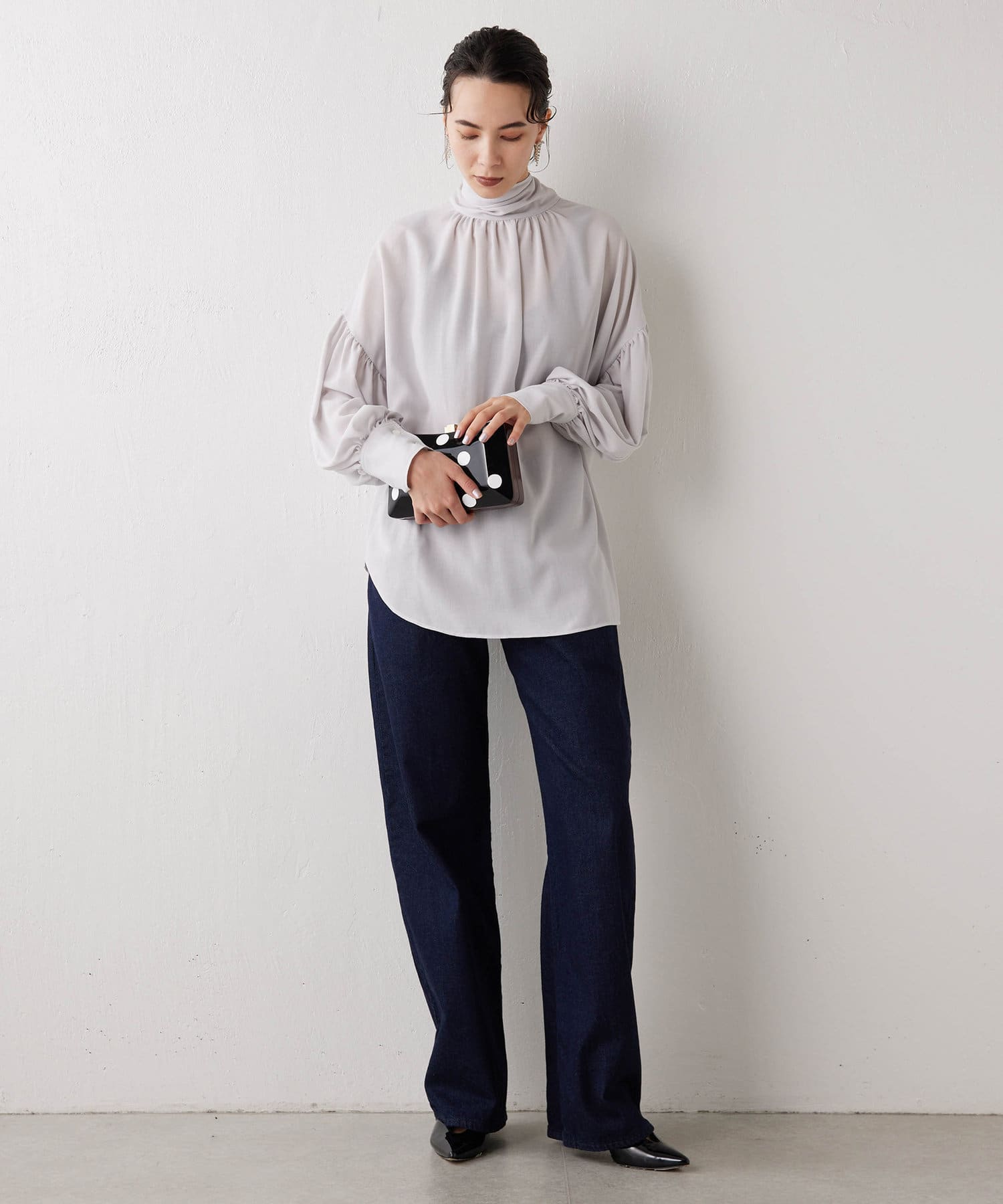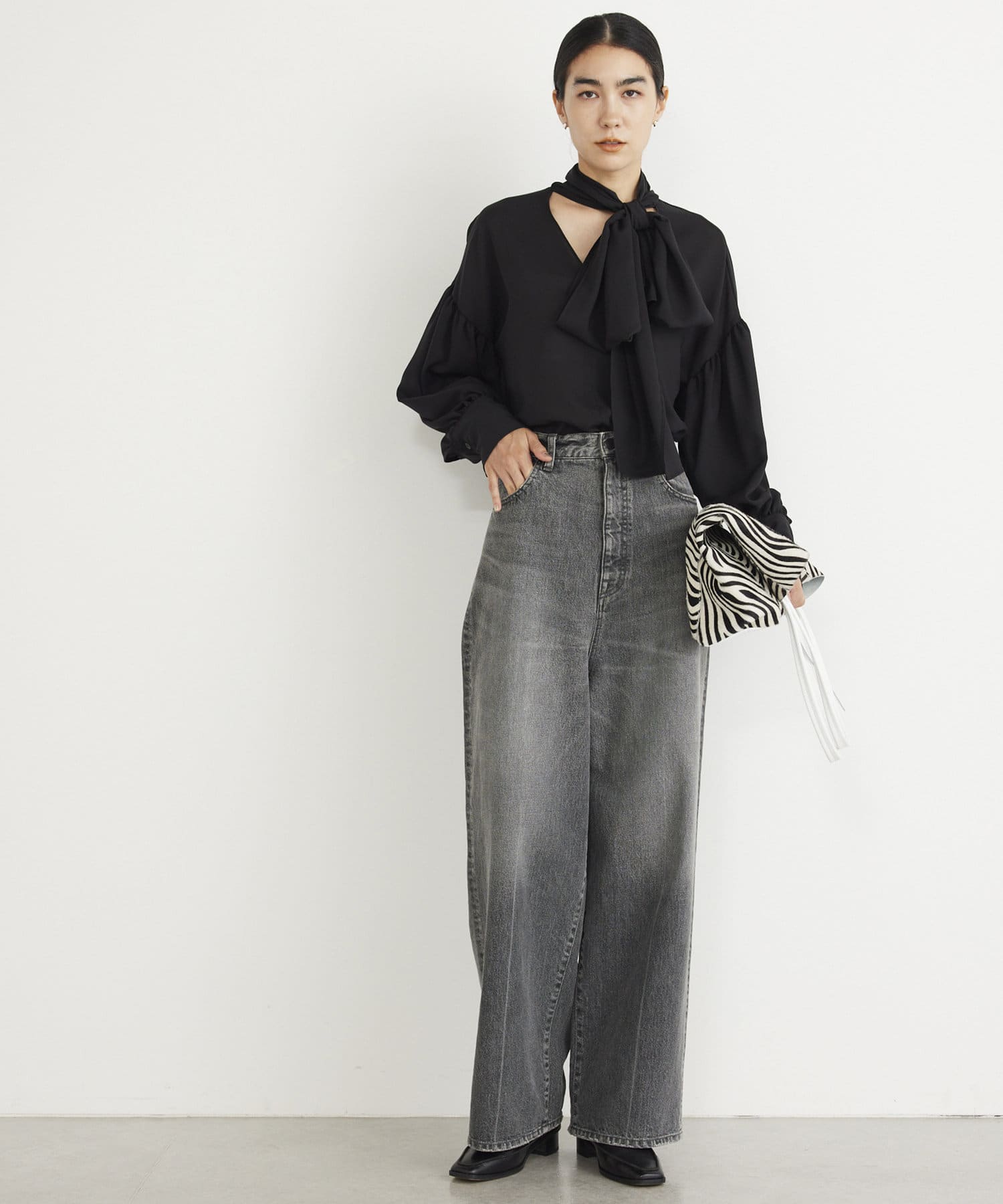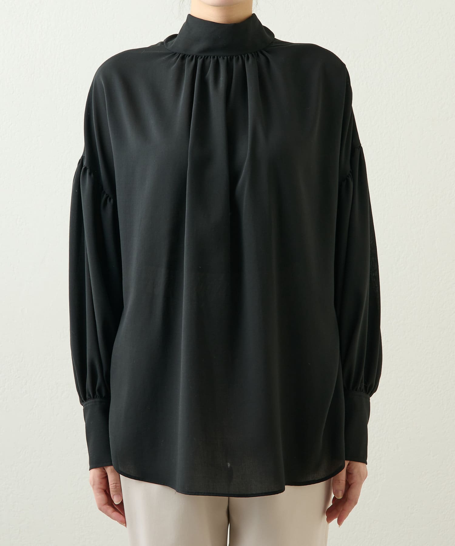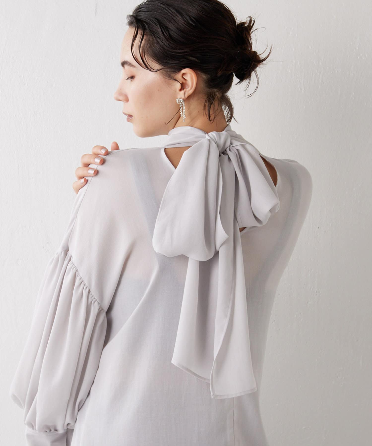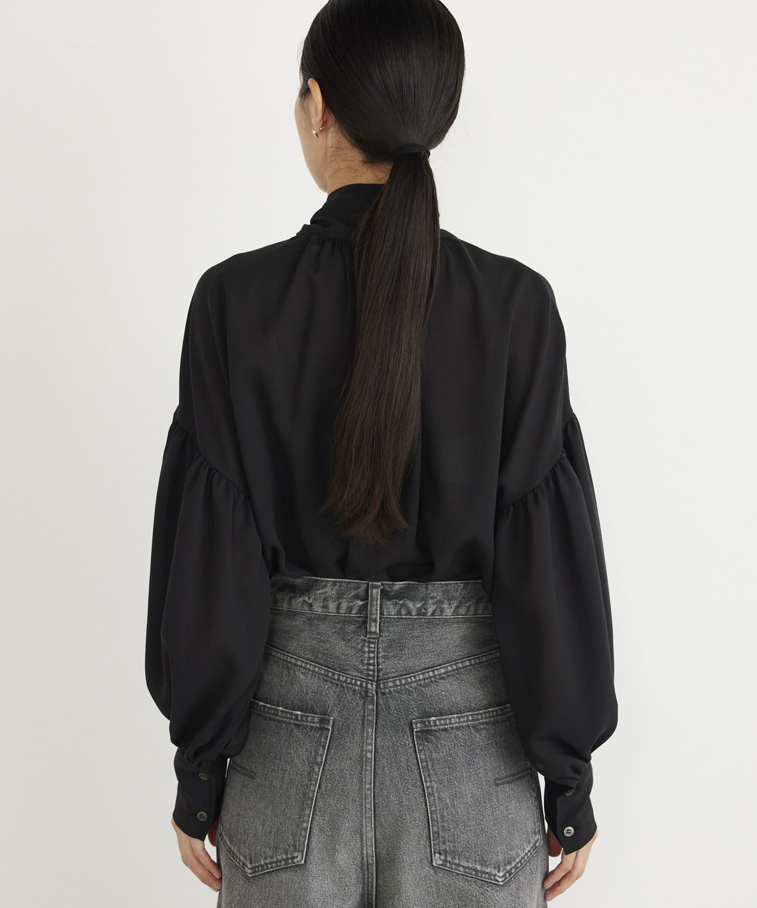■ボリューム感のあるギャザースリーブとボウタイが印象的なブラウス。