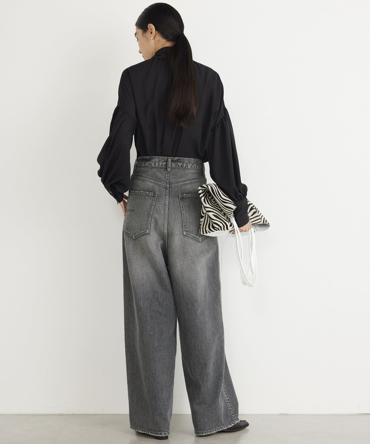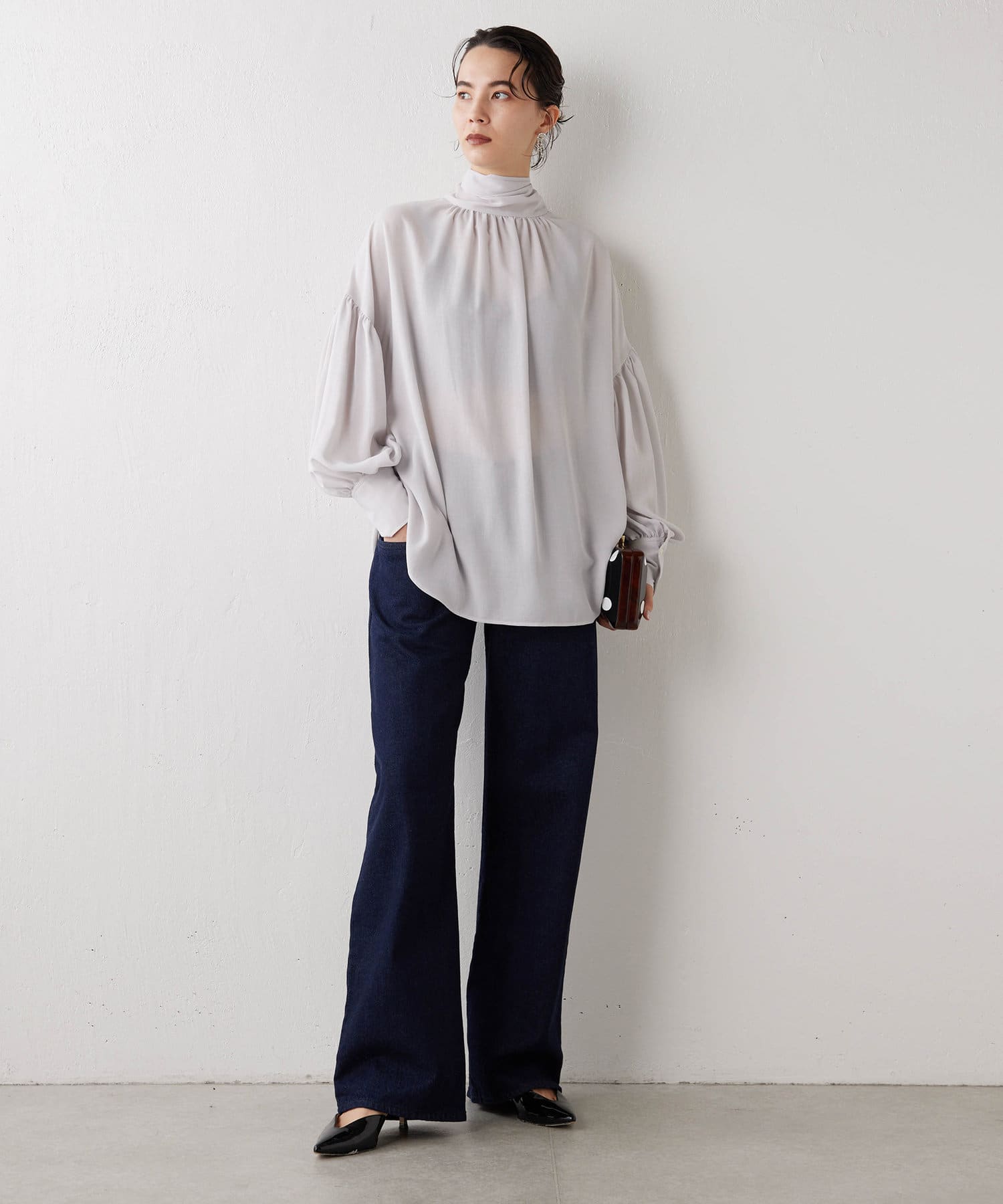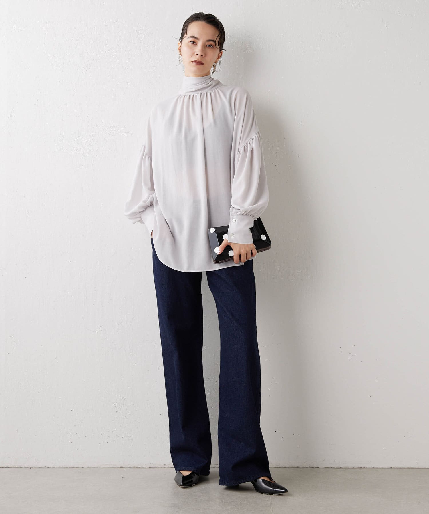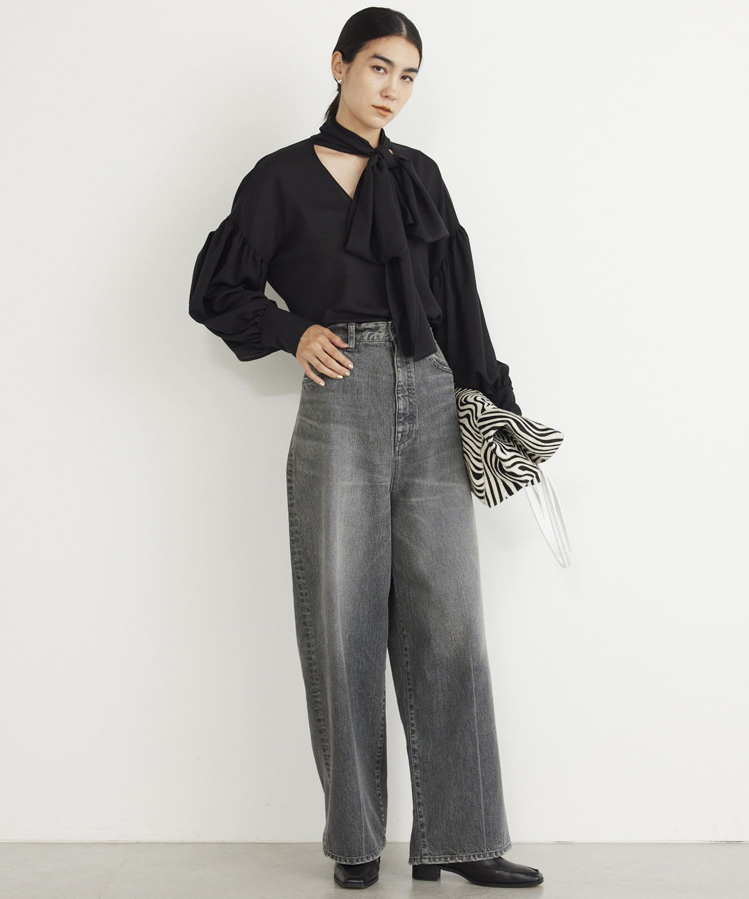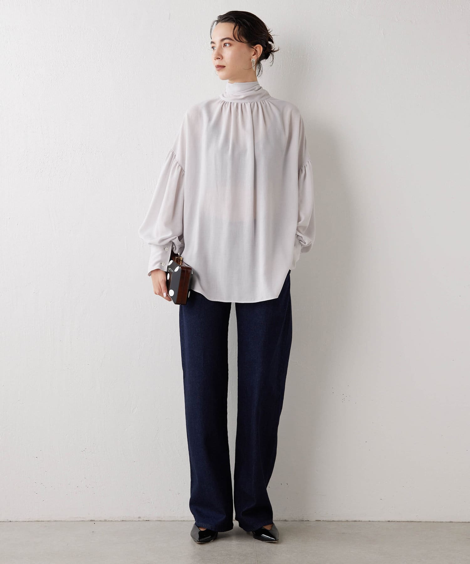 ■ボリューム感のあるギャザースリーブとボウタイが印象的なブラウス。