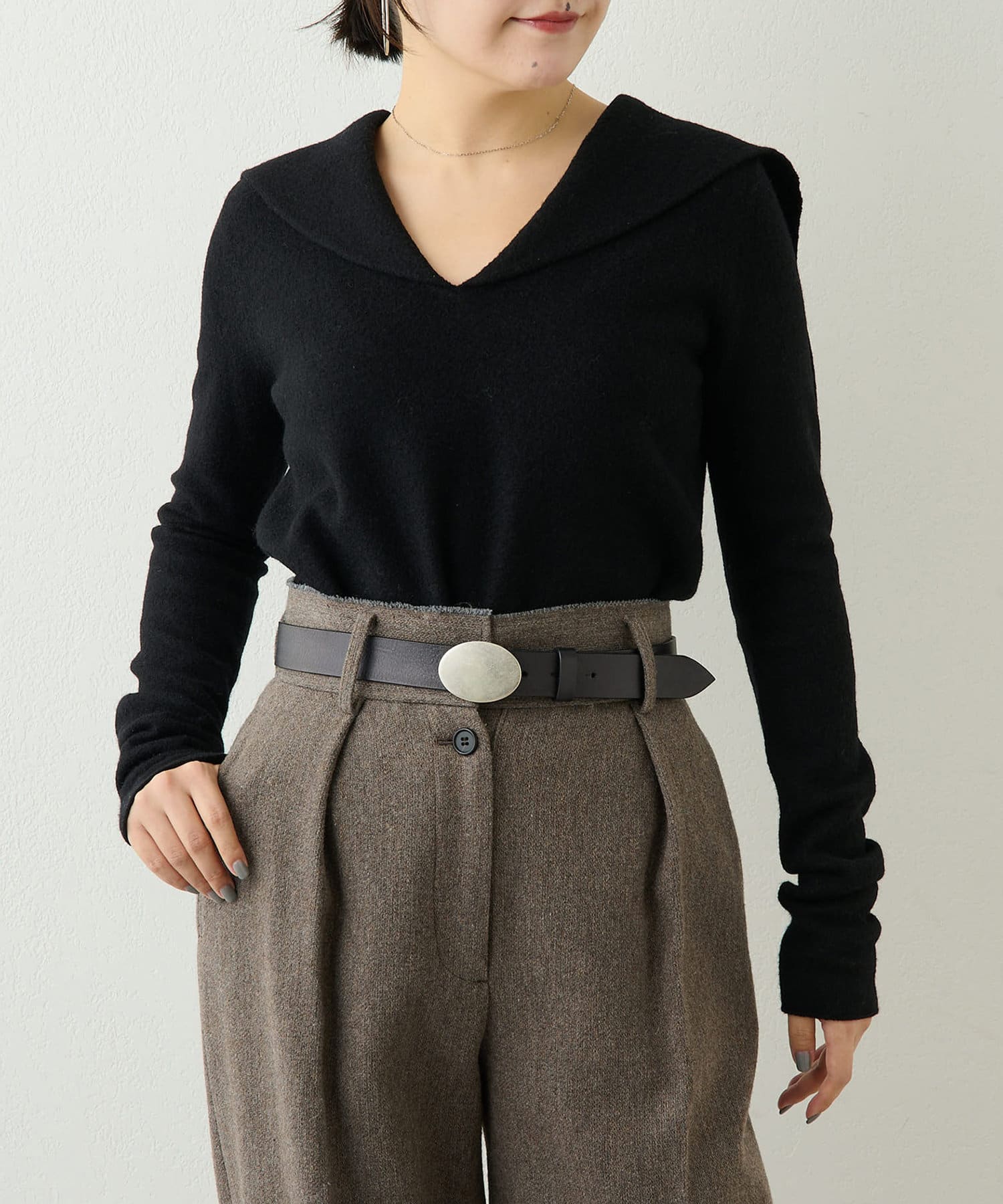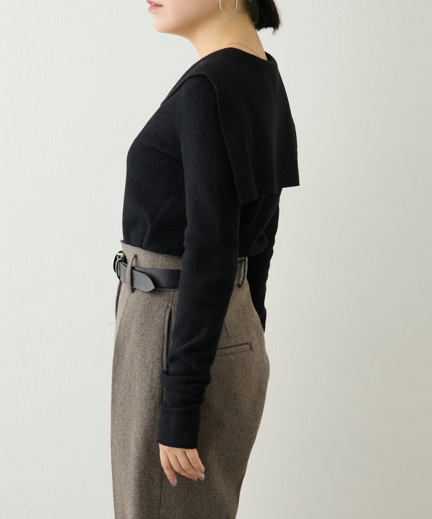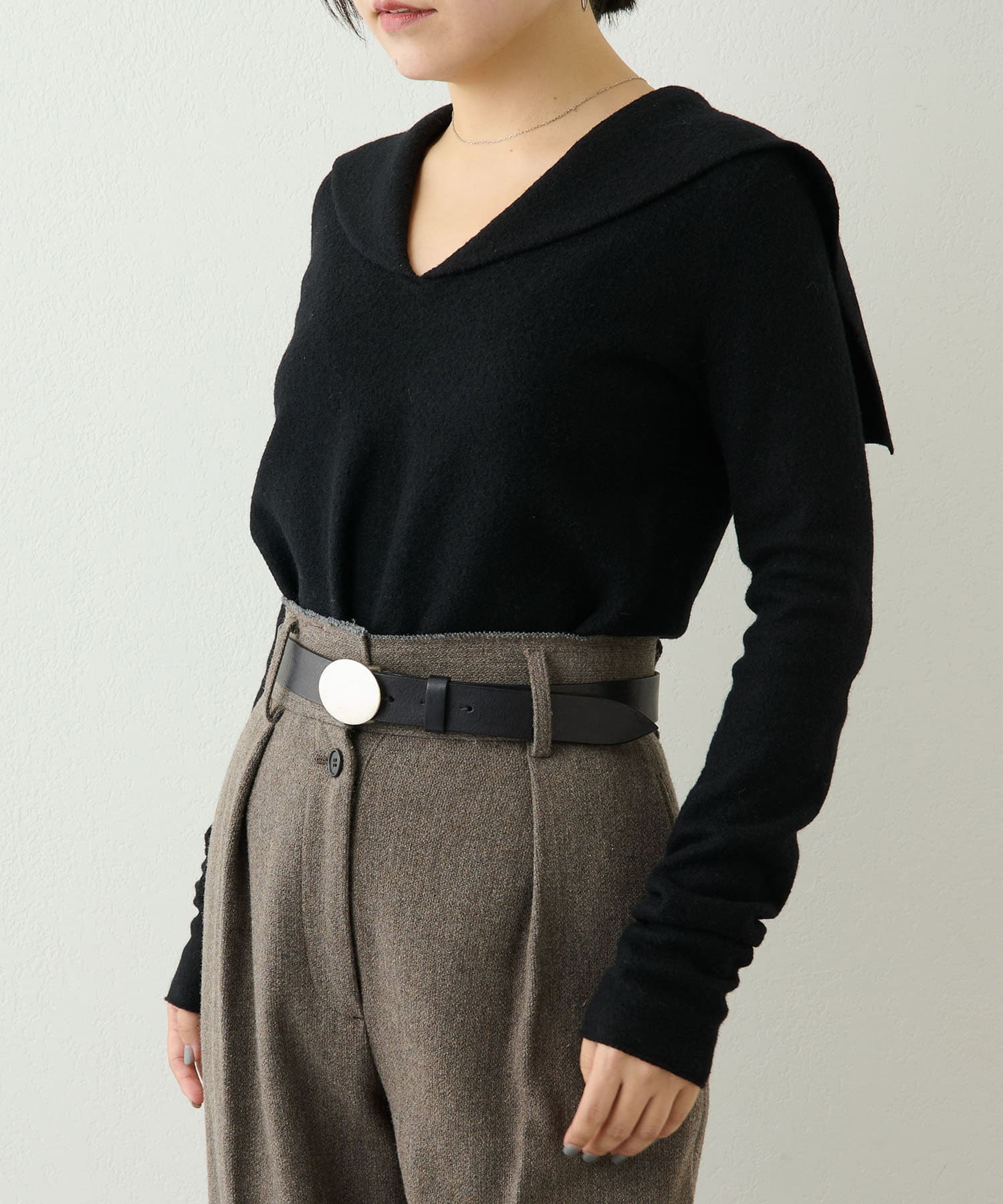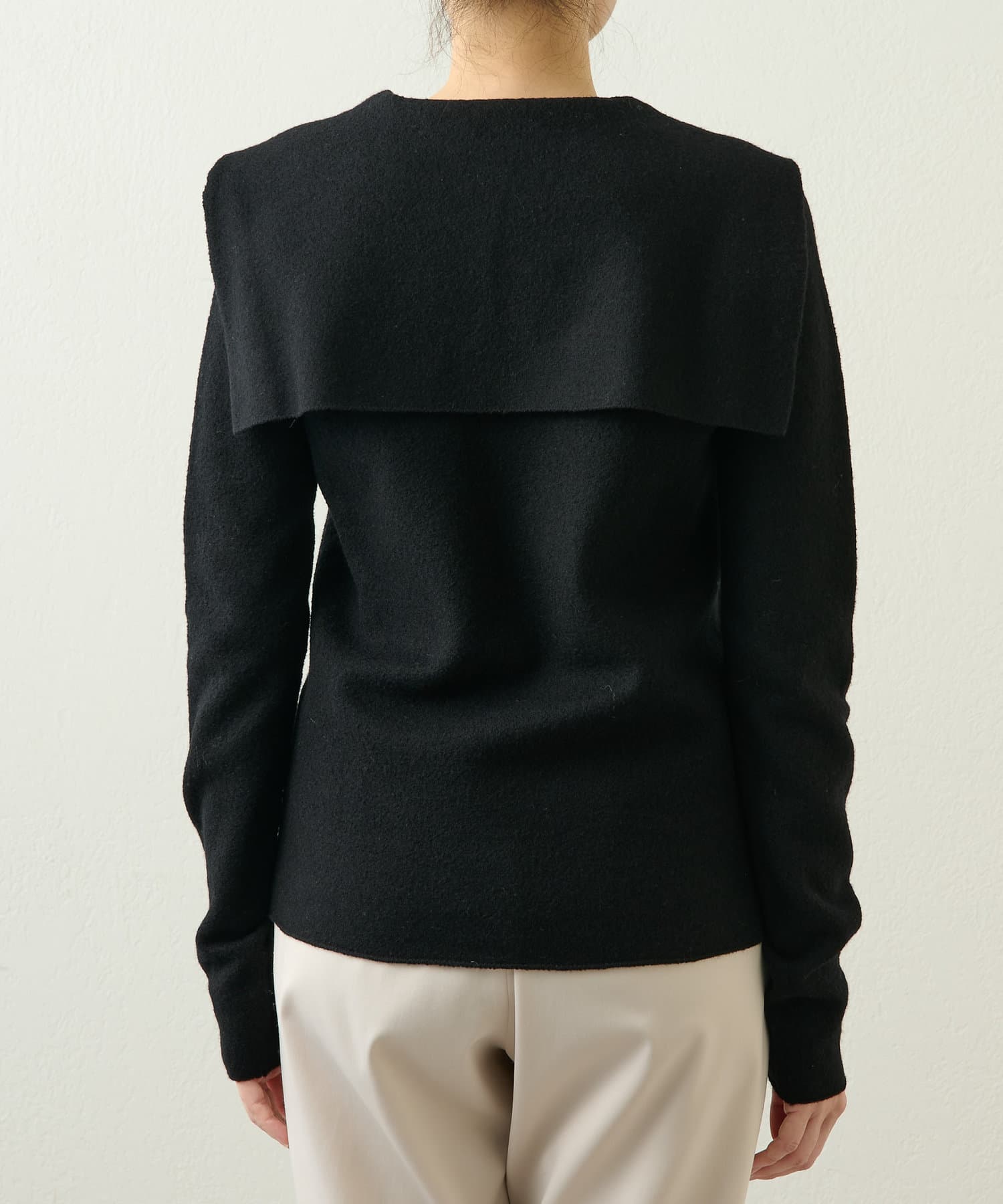 ■シンプルながらも大きめの衿がアクセントになり、いつもと違ったニットスタイルを楽しめるアイテム。