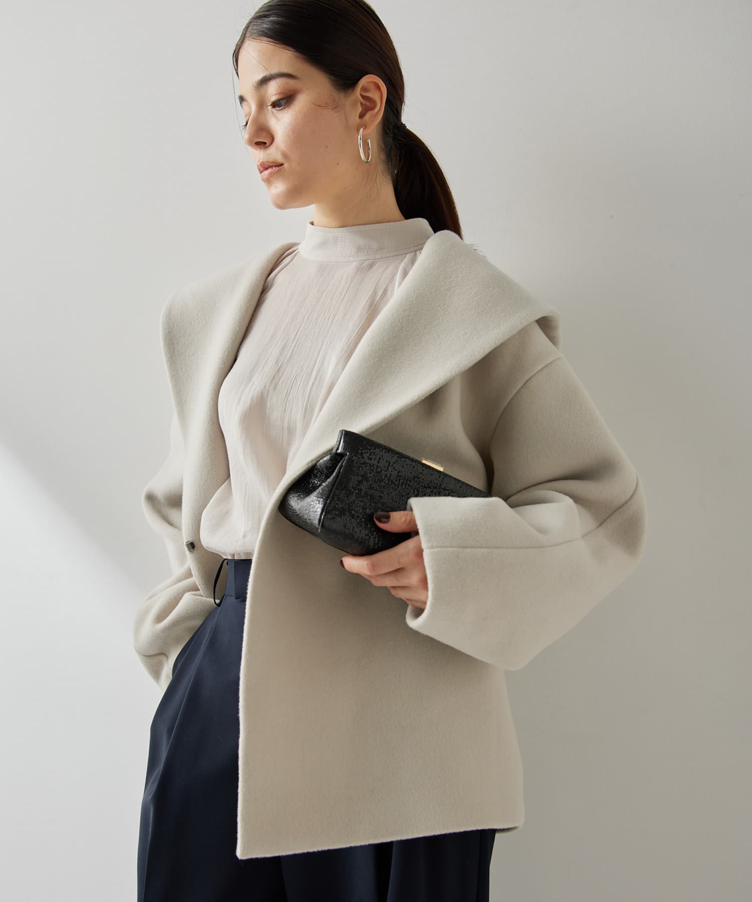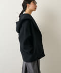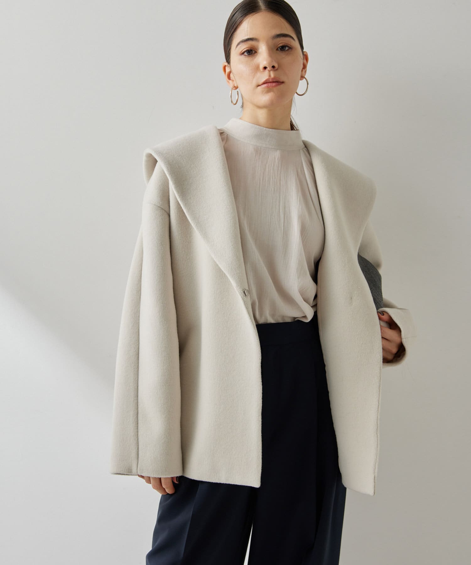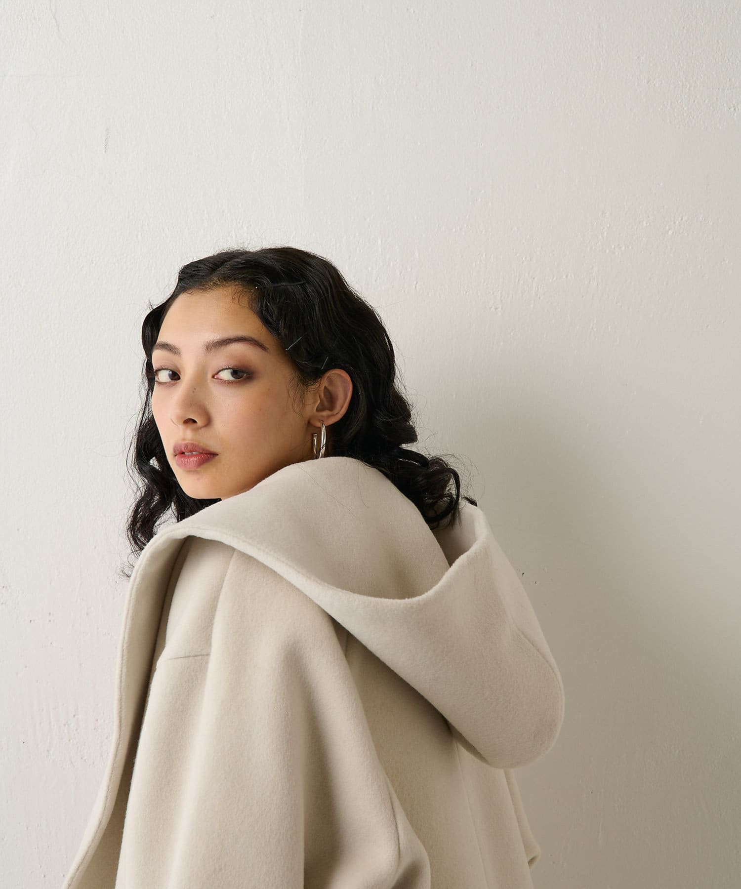 ■ハリのある大きめのフードデザインで顔回りをすっきりと小さく見せてくれる効果も。