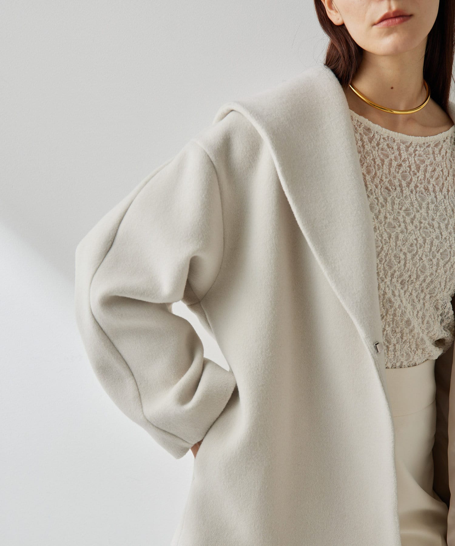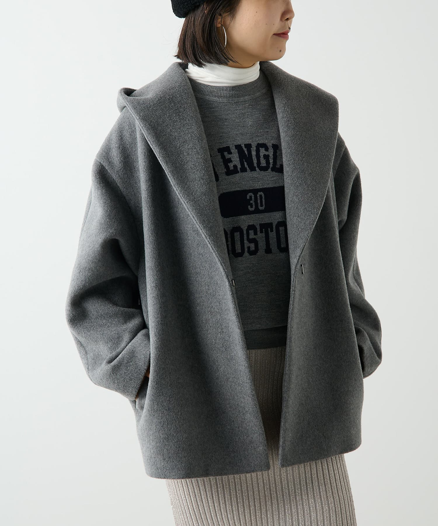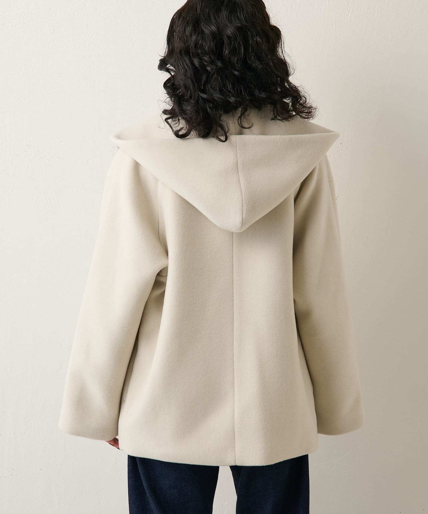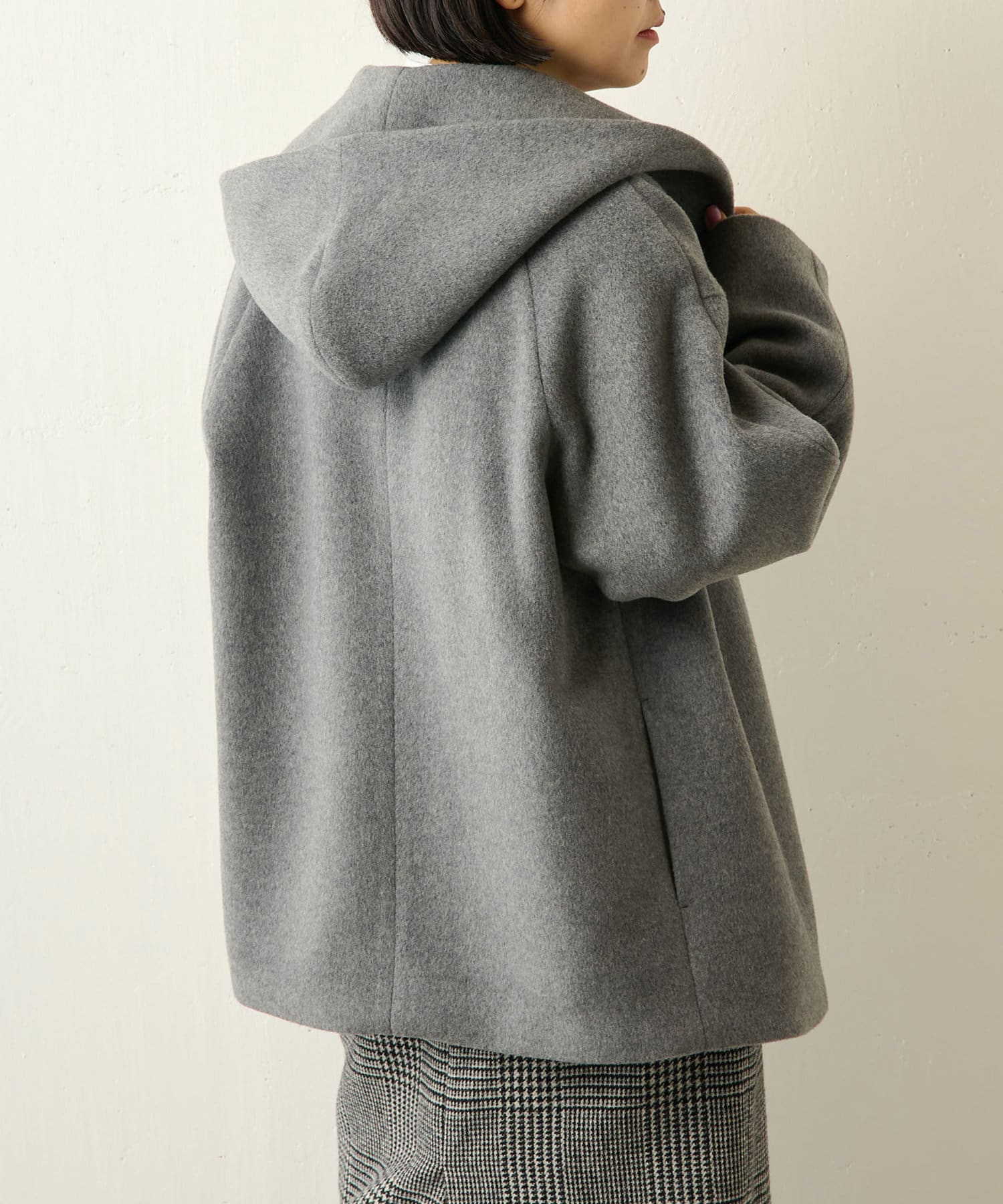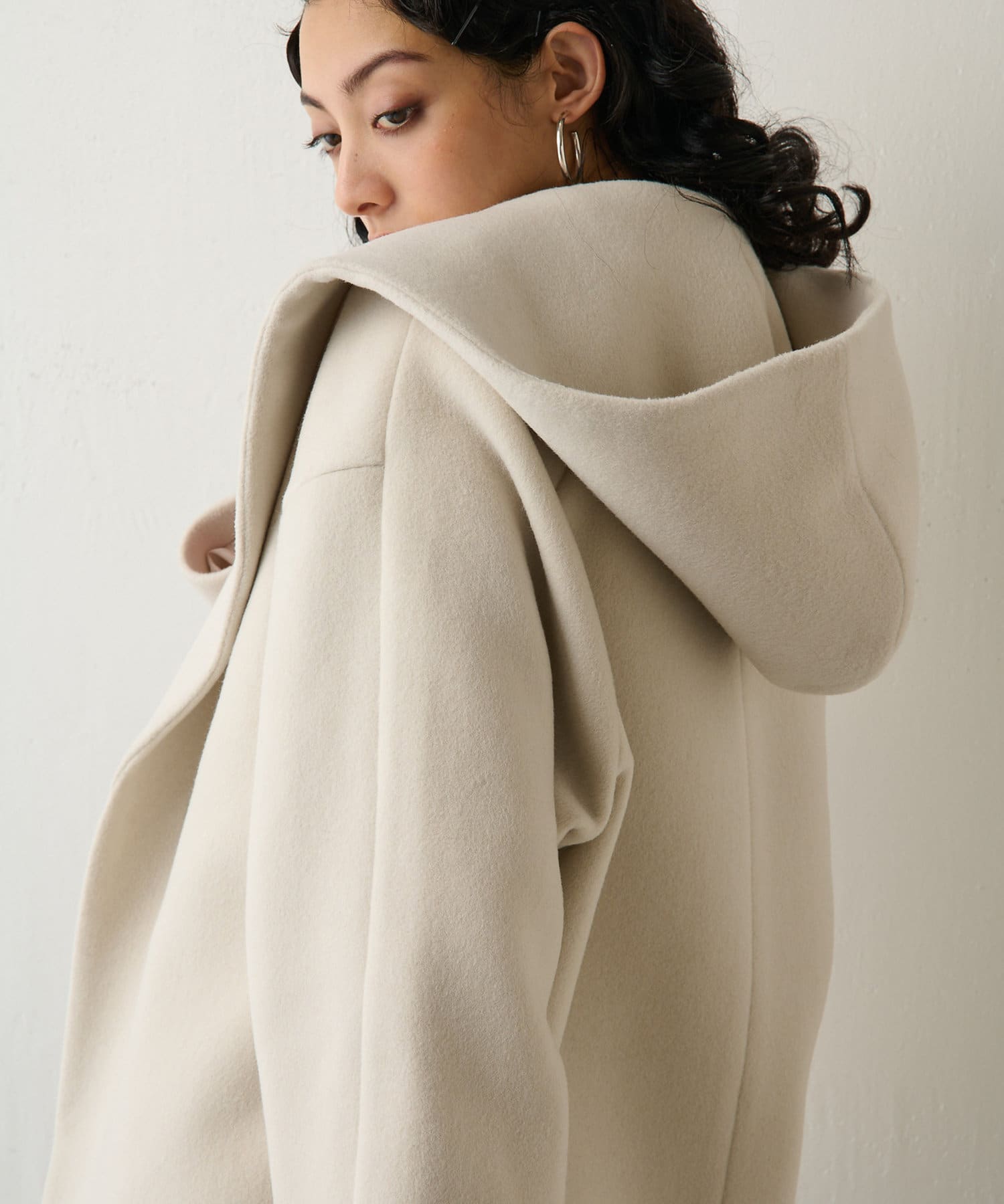 インナーを選ばない大人のフードコート。生地に上品さがありますので、きれいめはもちろんのこと、カジュアルなアイテムとの合わせもバランスがとれるアウター。少しオーバーサイズなところが、また素敵。パッと羽織れてサマになるコートです。