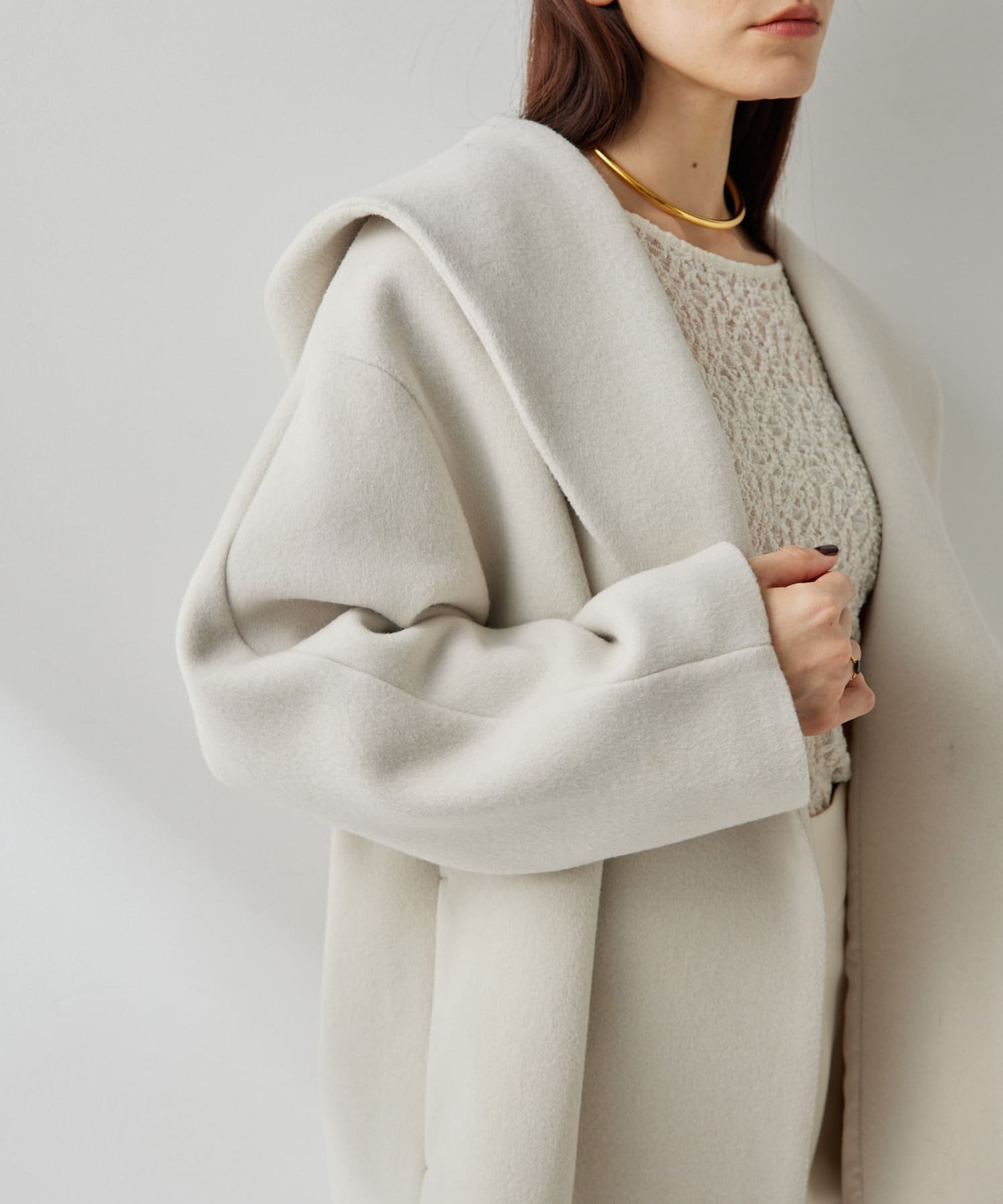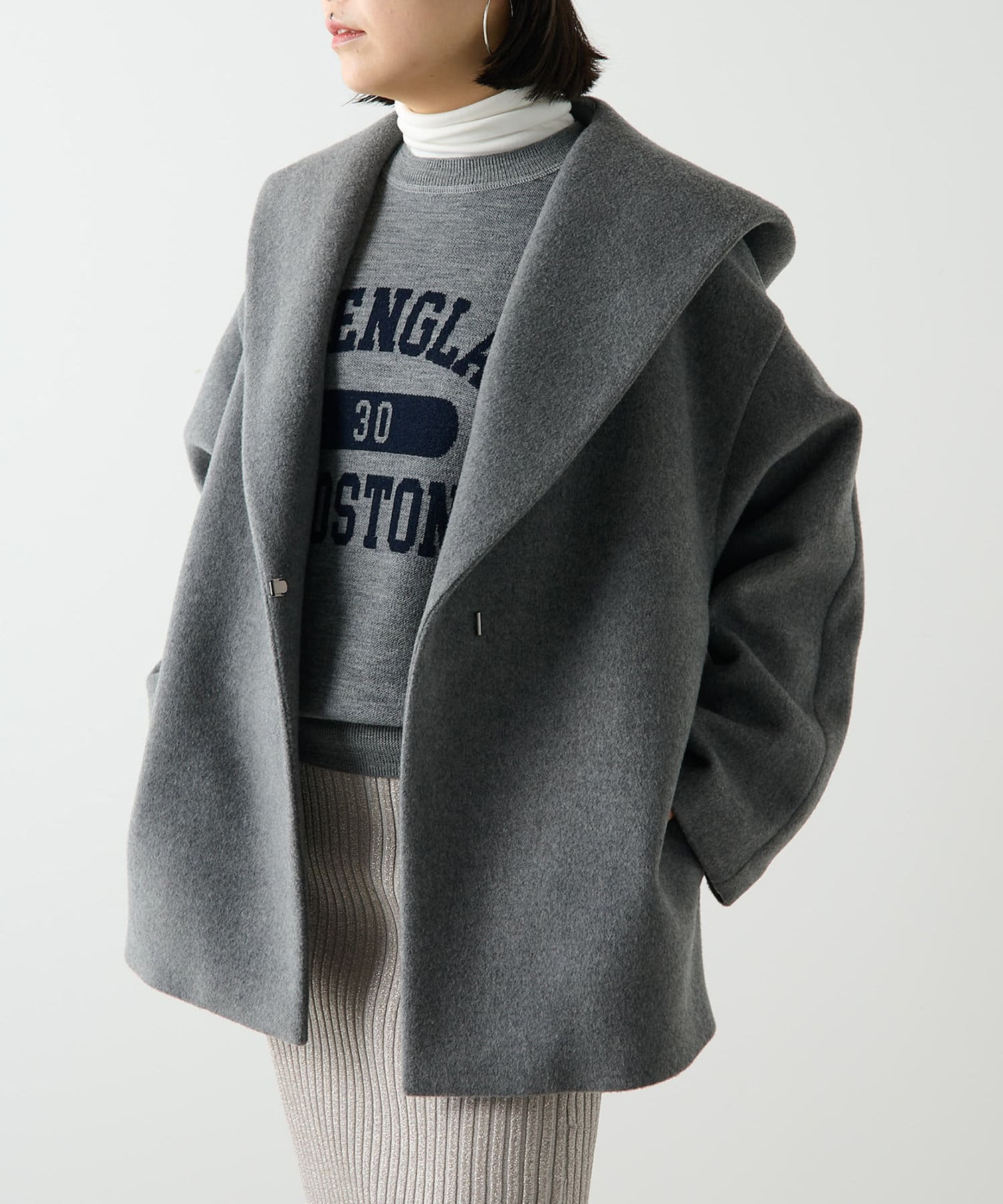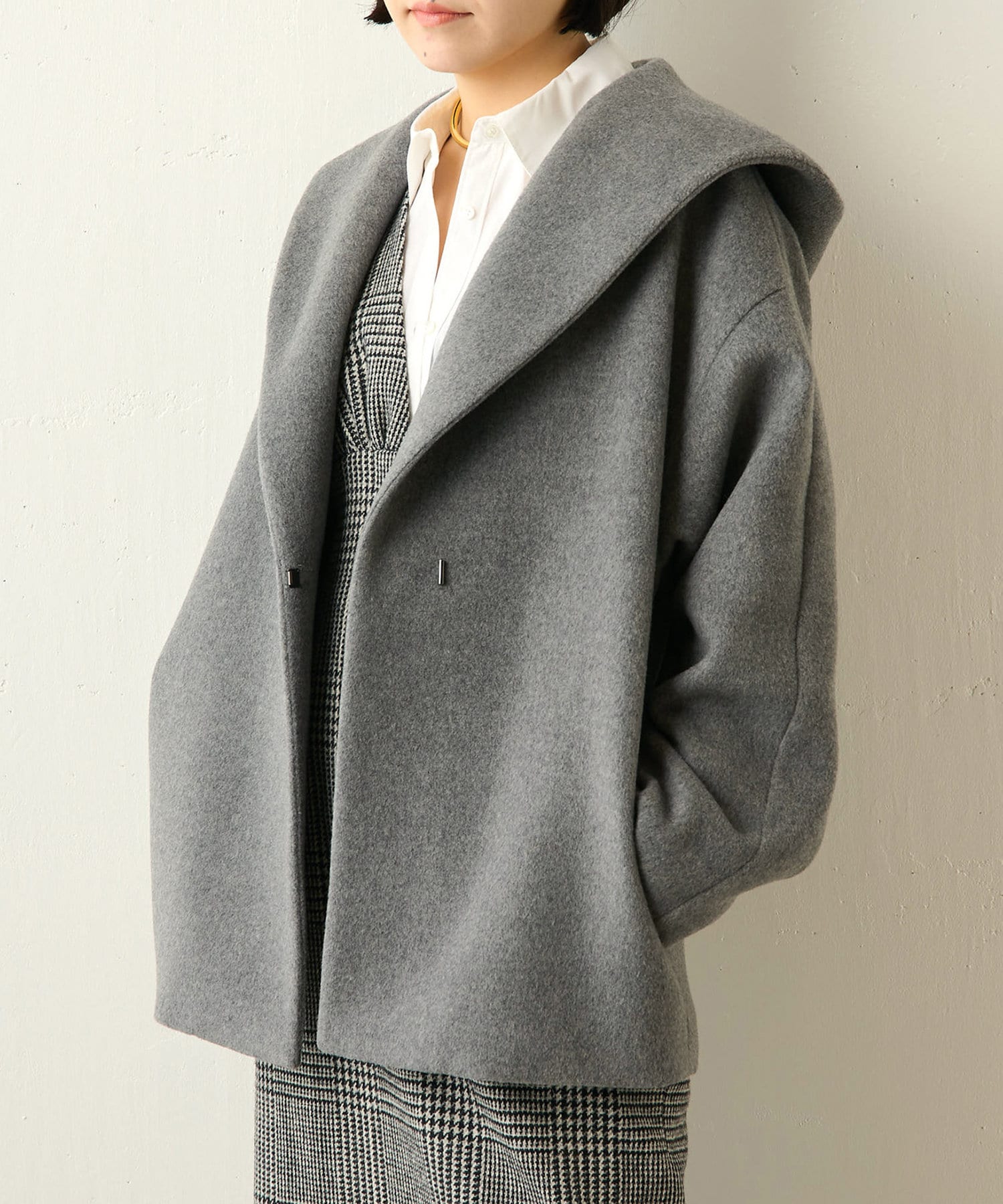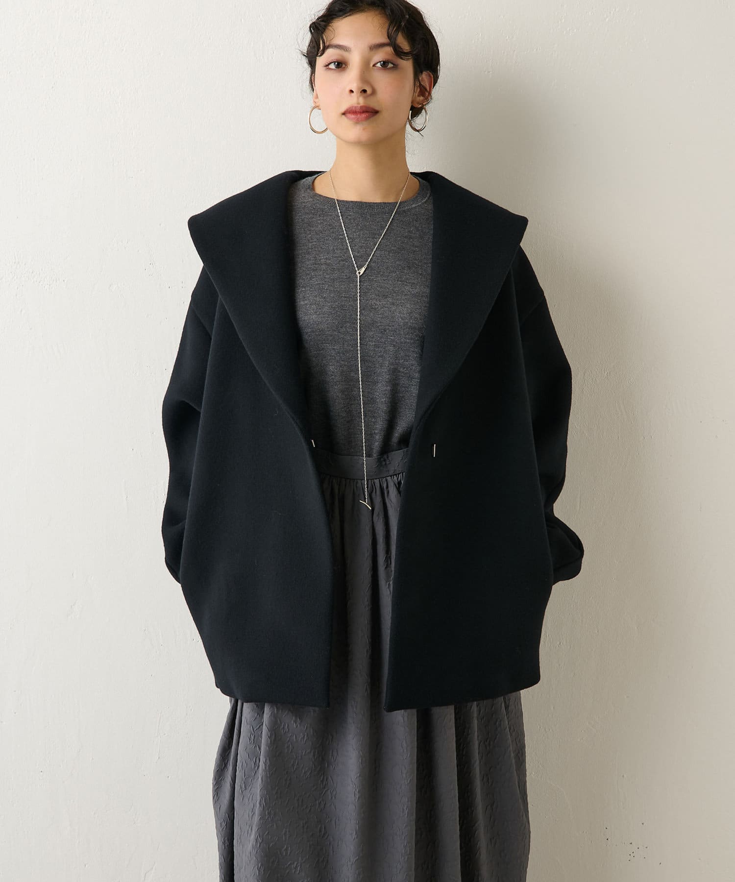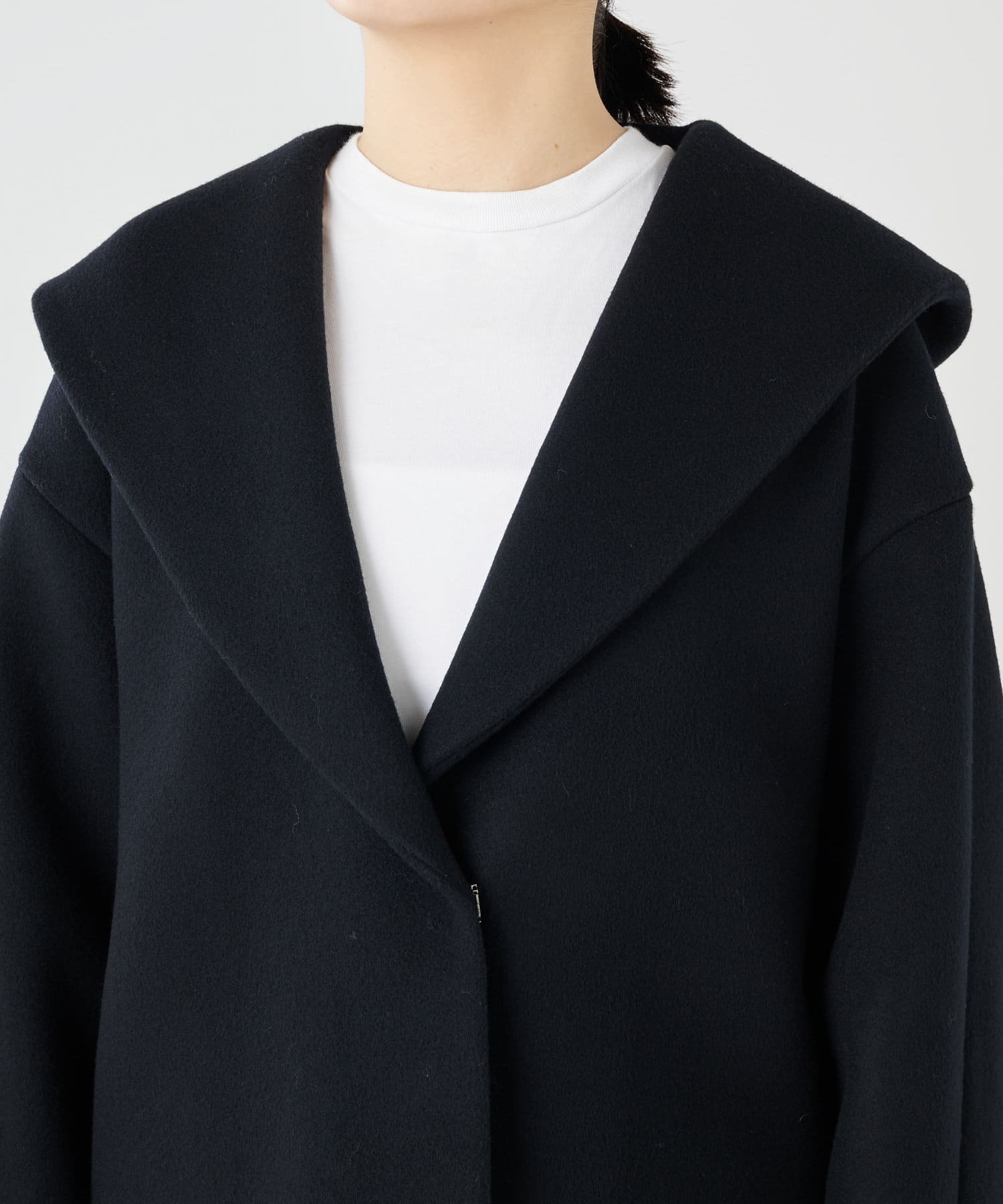 インナーを選ばない大人のフードコート。生地に上品さがありますので、きれいめはもちろんのこと、カジュアルなアイテムとの合わせもバランスがとれるアウター。少しオーバーサイズなところが、また素敵。パッと羽織れてサマになるコートです。