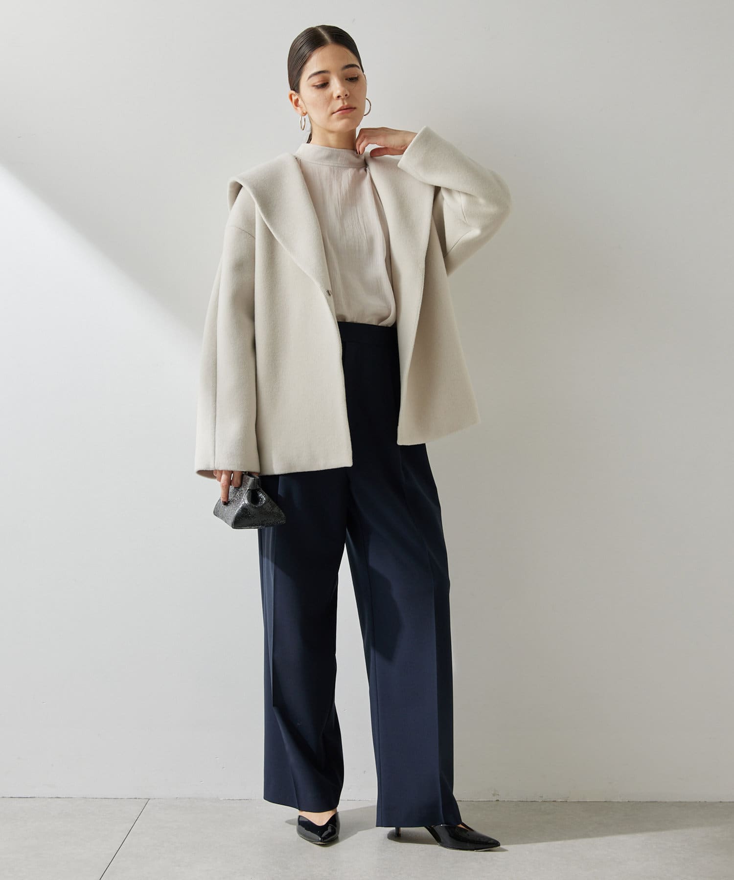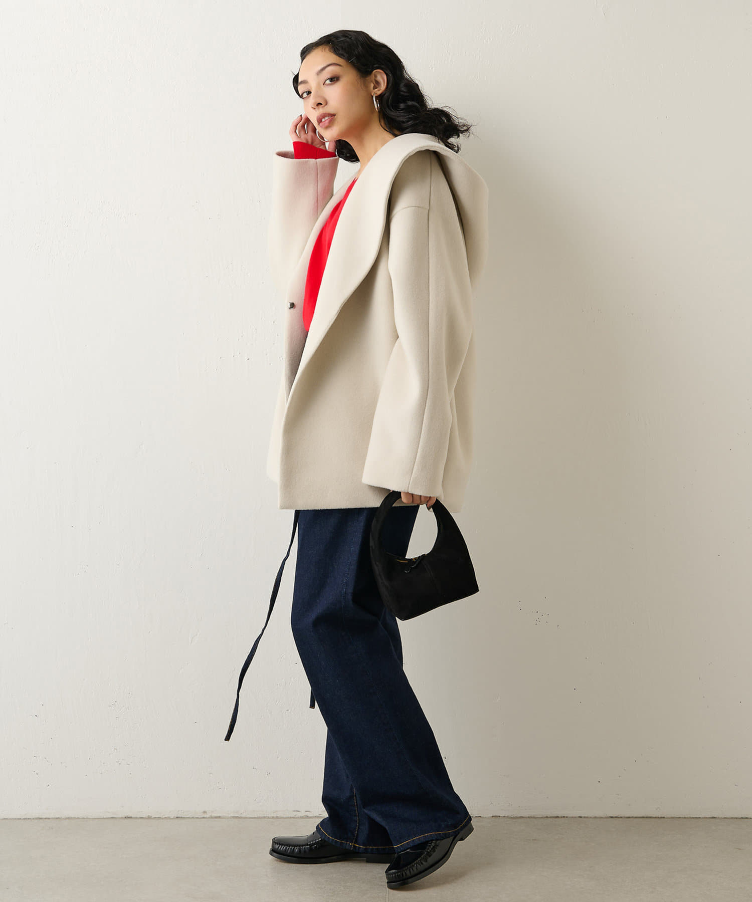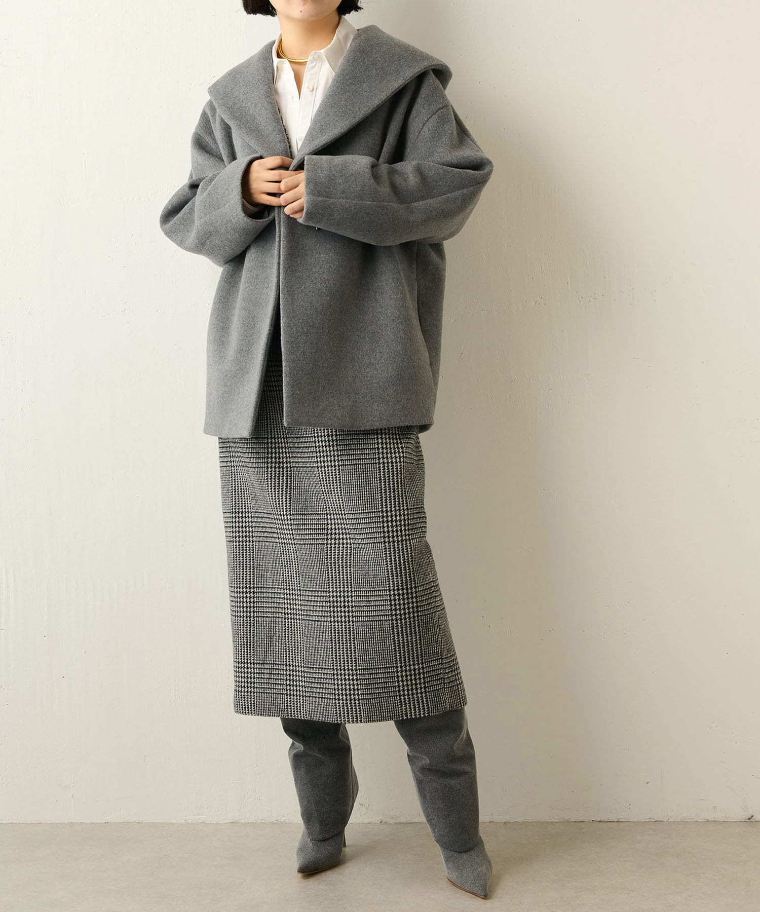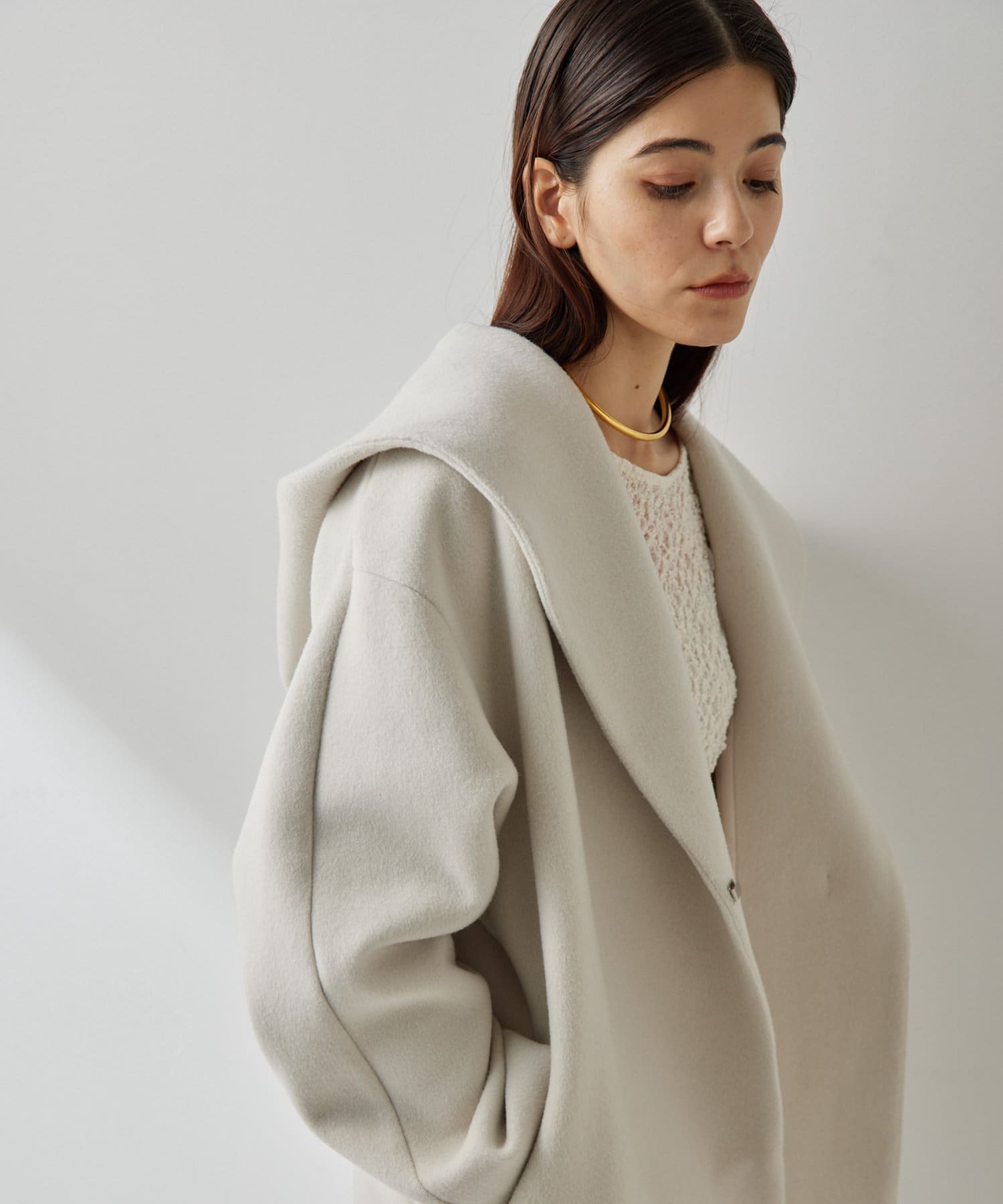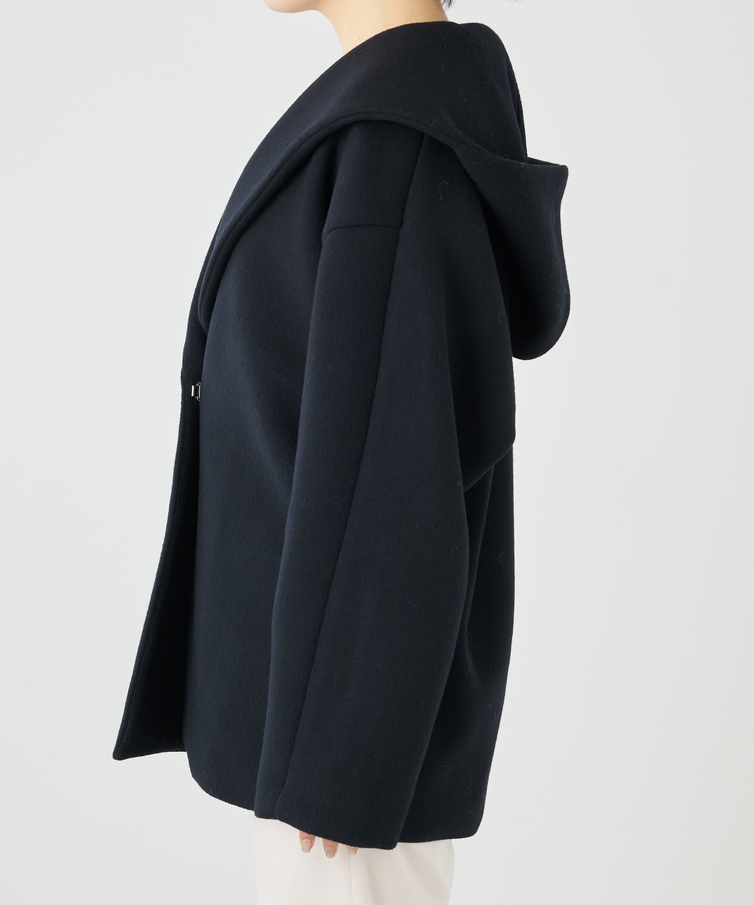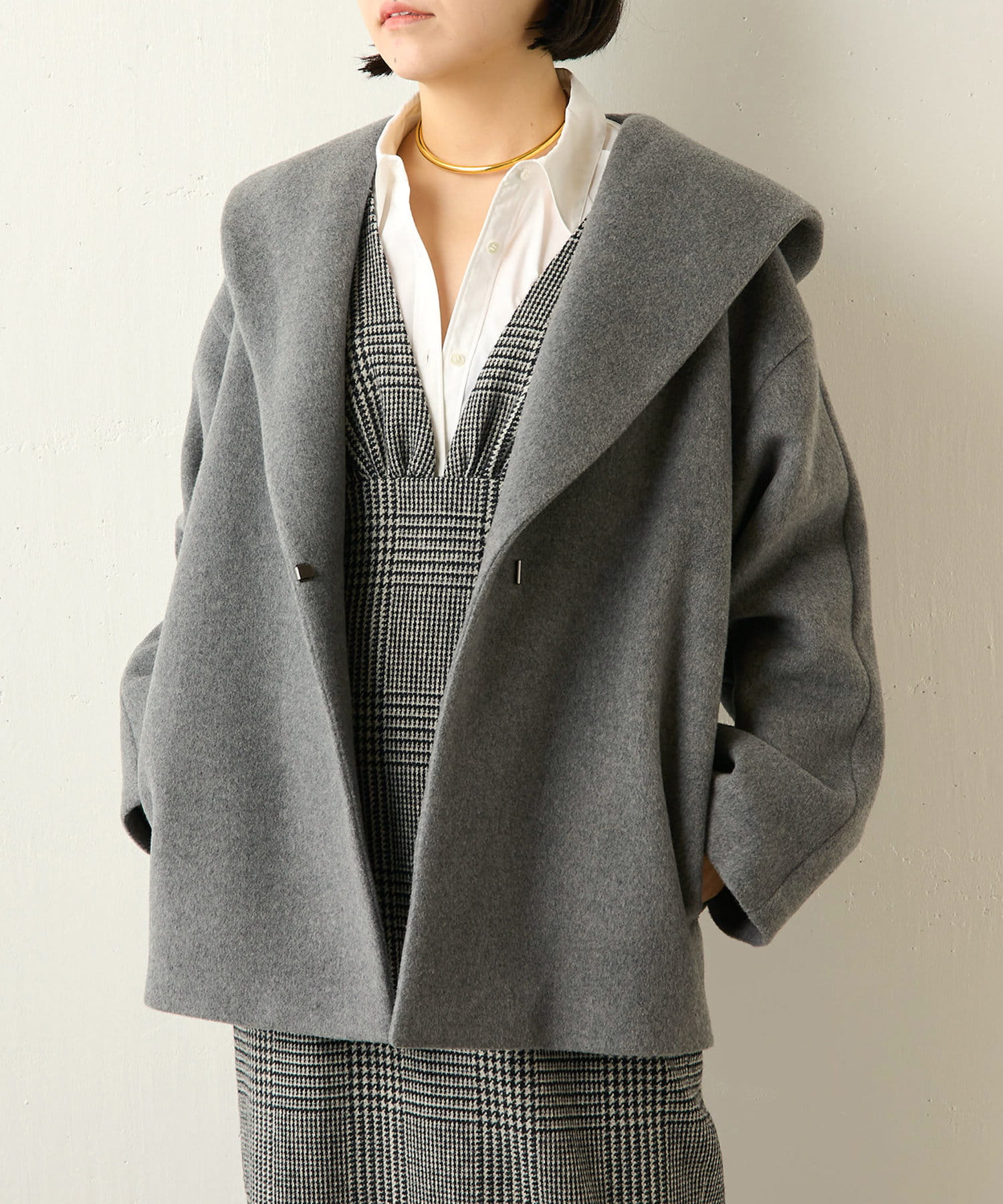 インナーを選ばない大人のフードコート。生地に上品さがありますので、きれいめはもちろんのこと、カジュアルなアイテムとの合わせもバランスがとれるアウター。少しオーバーサイズなところが、また素敵。パッと羽織れてサマになるコートです。