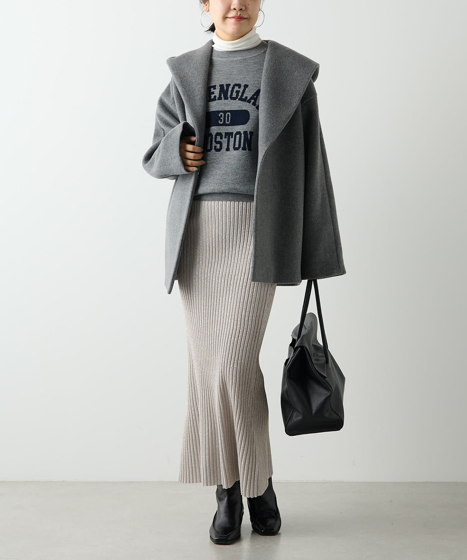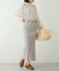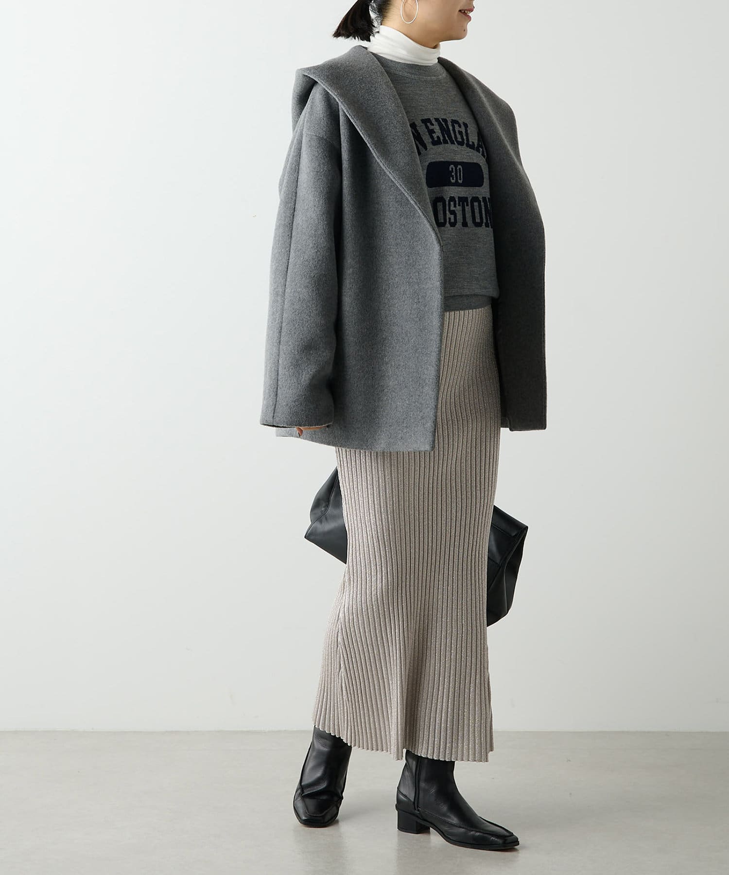 フィット感はありますが、ボディラインを活かしつつ本当に綺麗に見せてくれます。ストレッチが効いていてロング丈でも歩きやすく、オンオフ問わずシーズンレスに使えますよ。ラメですが派手になりすぎず、コーディネートに取り入れやすく普段使いもしやすいのがポイントです!